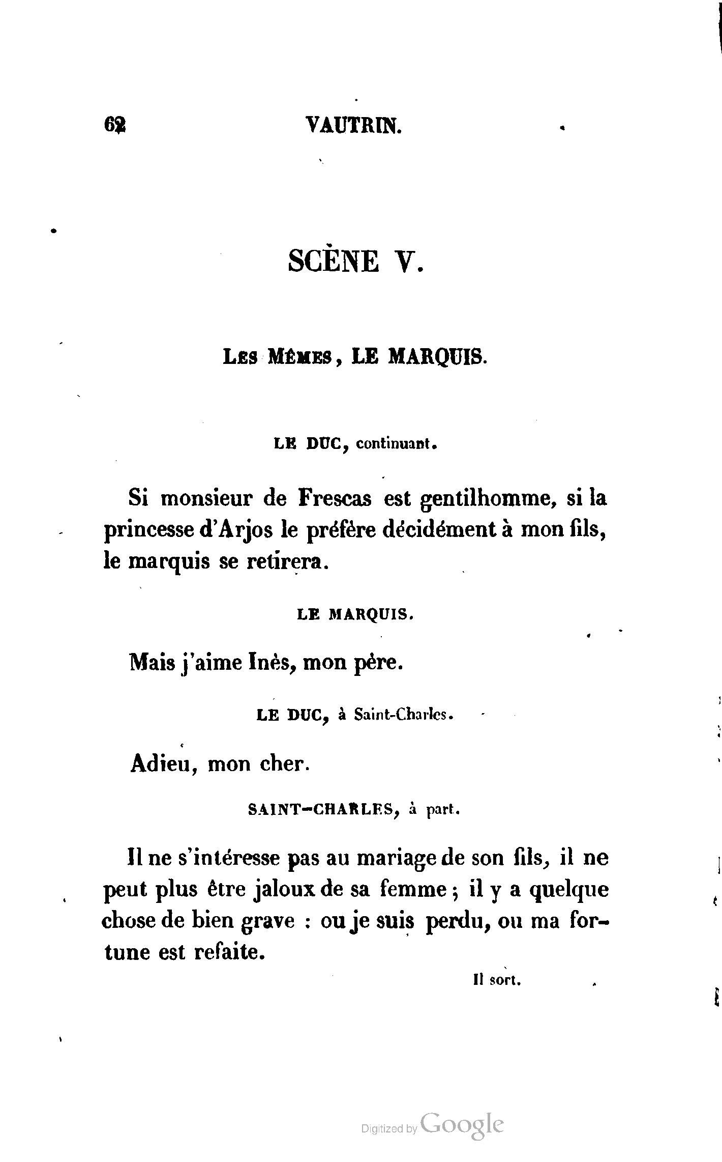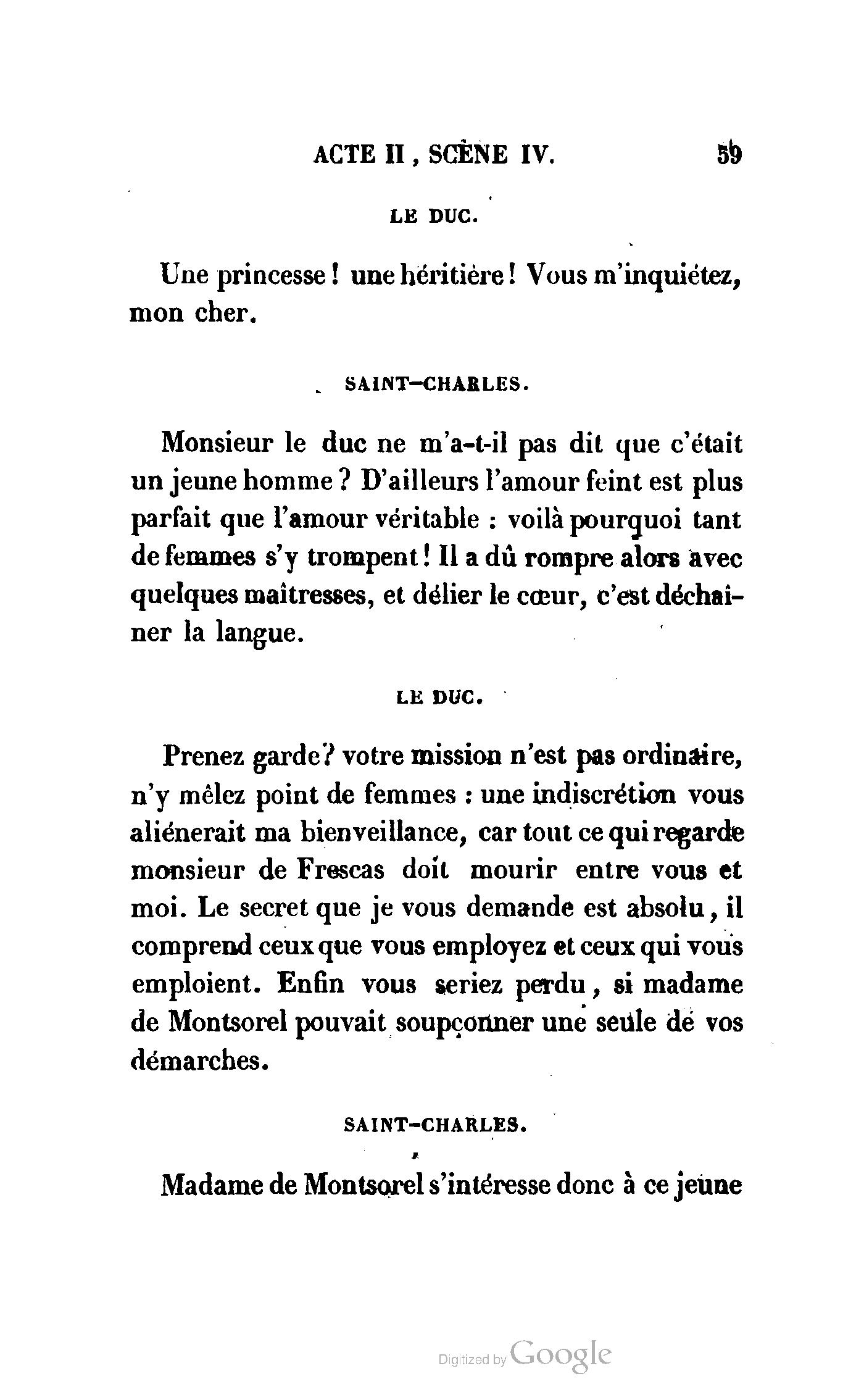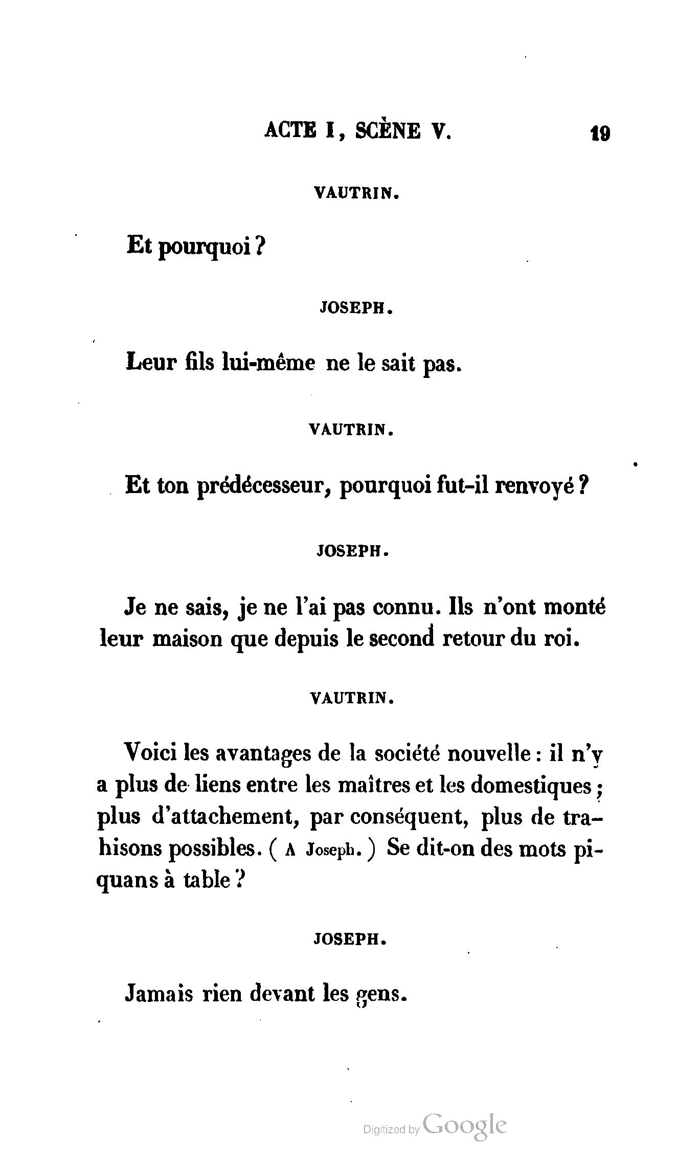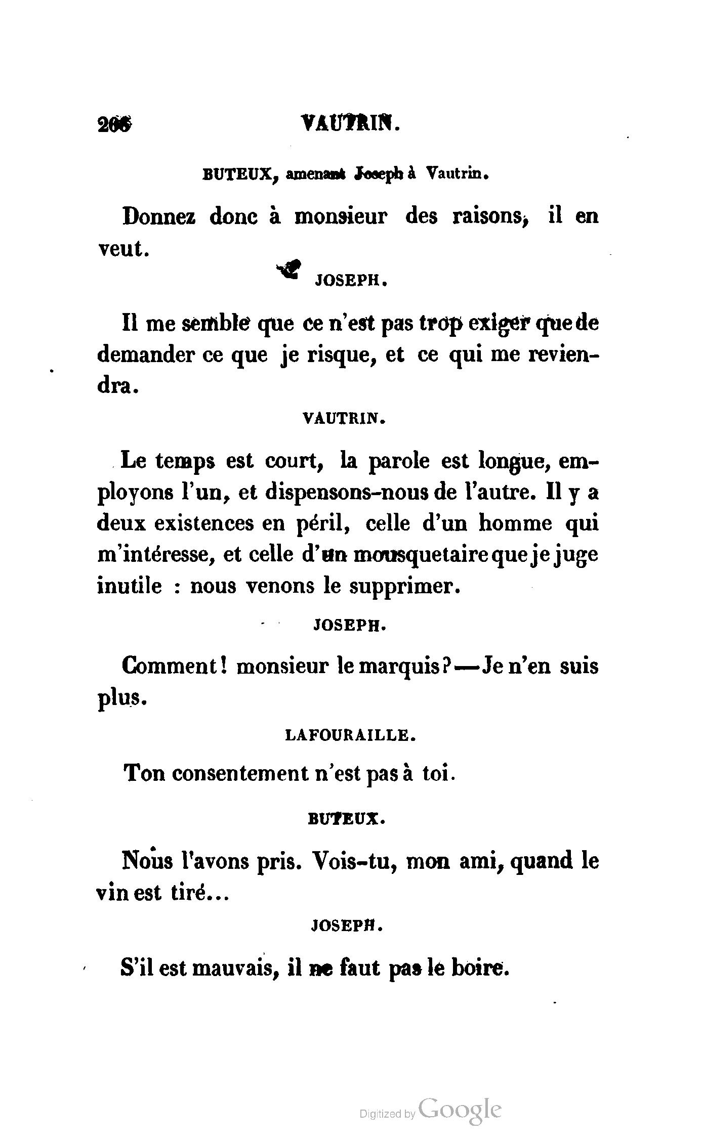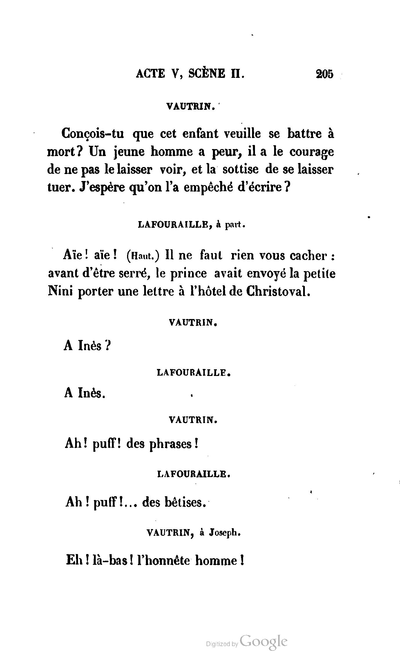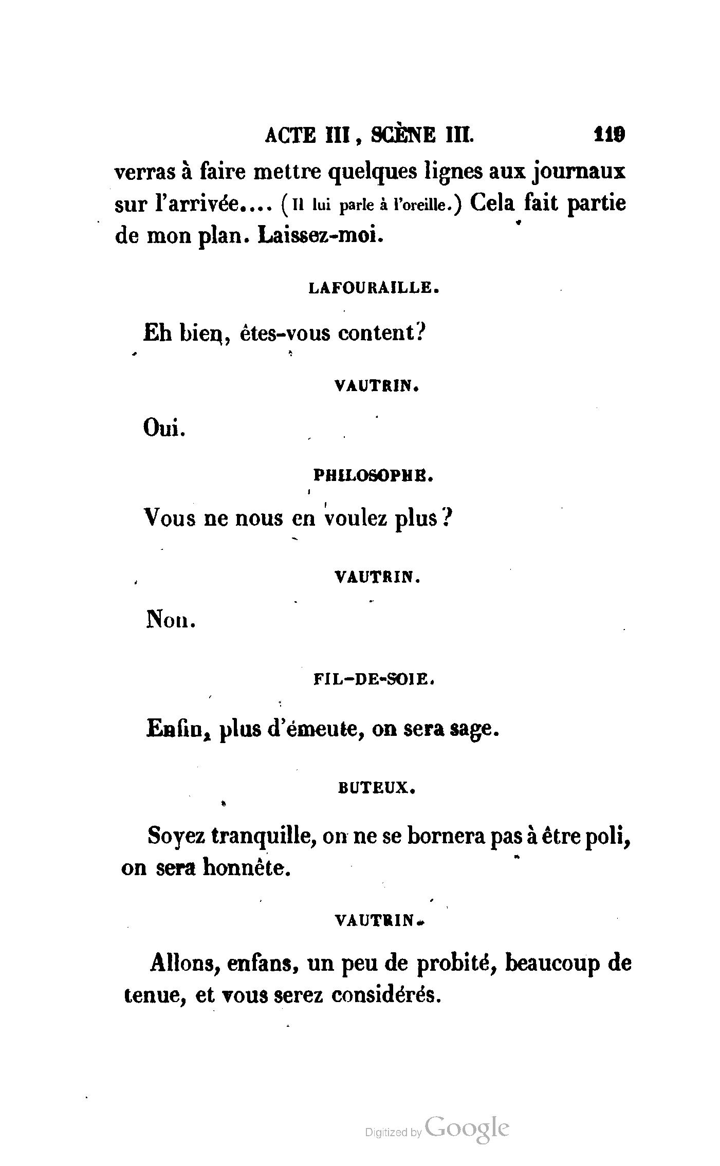 Chez vous, Monsieur le duc, laissez passer la justice du roi. C’est une affaire entre ces Messieurs et moi. (Au commissaire.) Je vous suis. (À la duchesse.) C’est Joseph qui les amène ; il est des nôtres ; renvoyez-le.