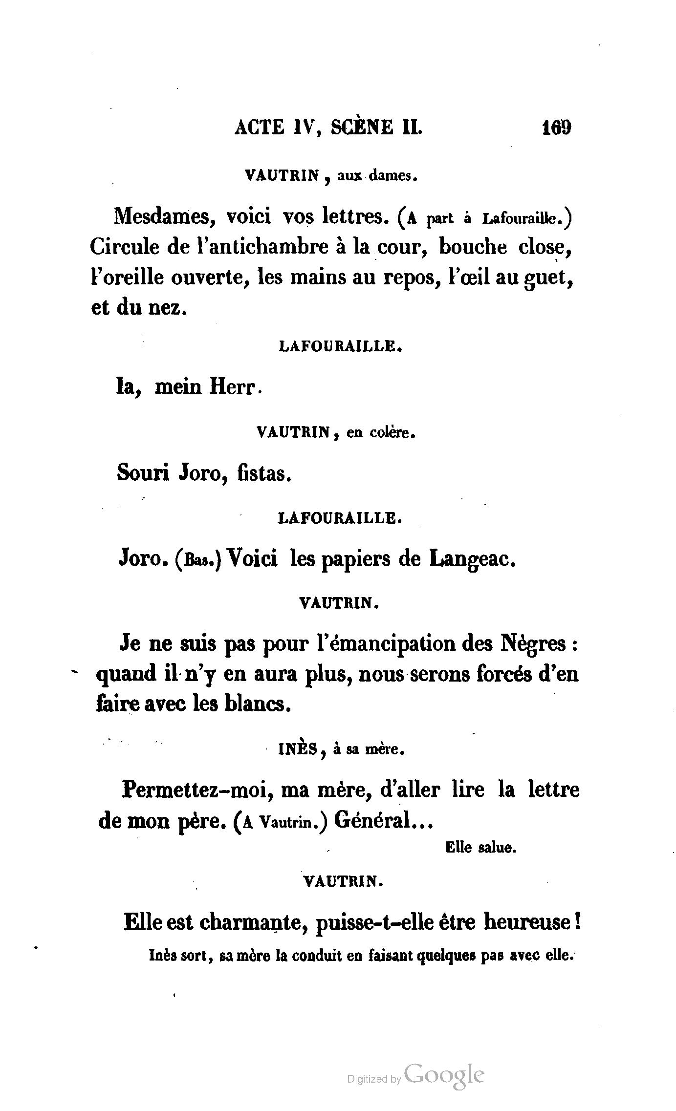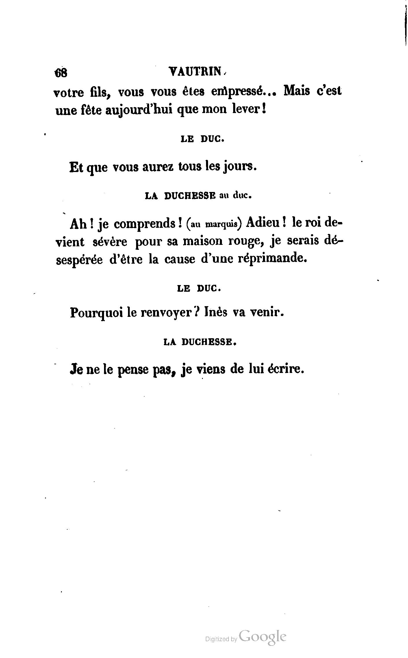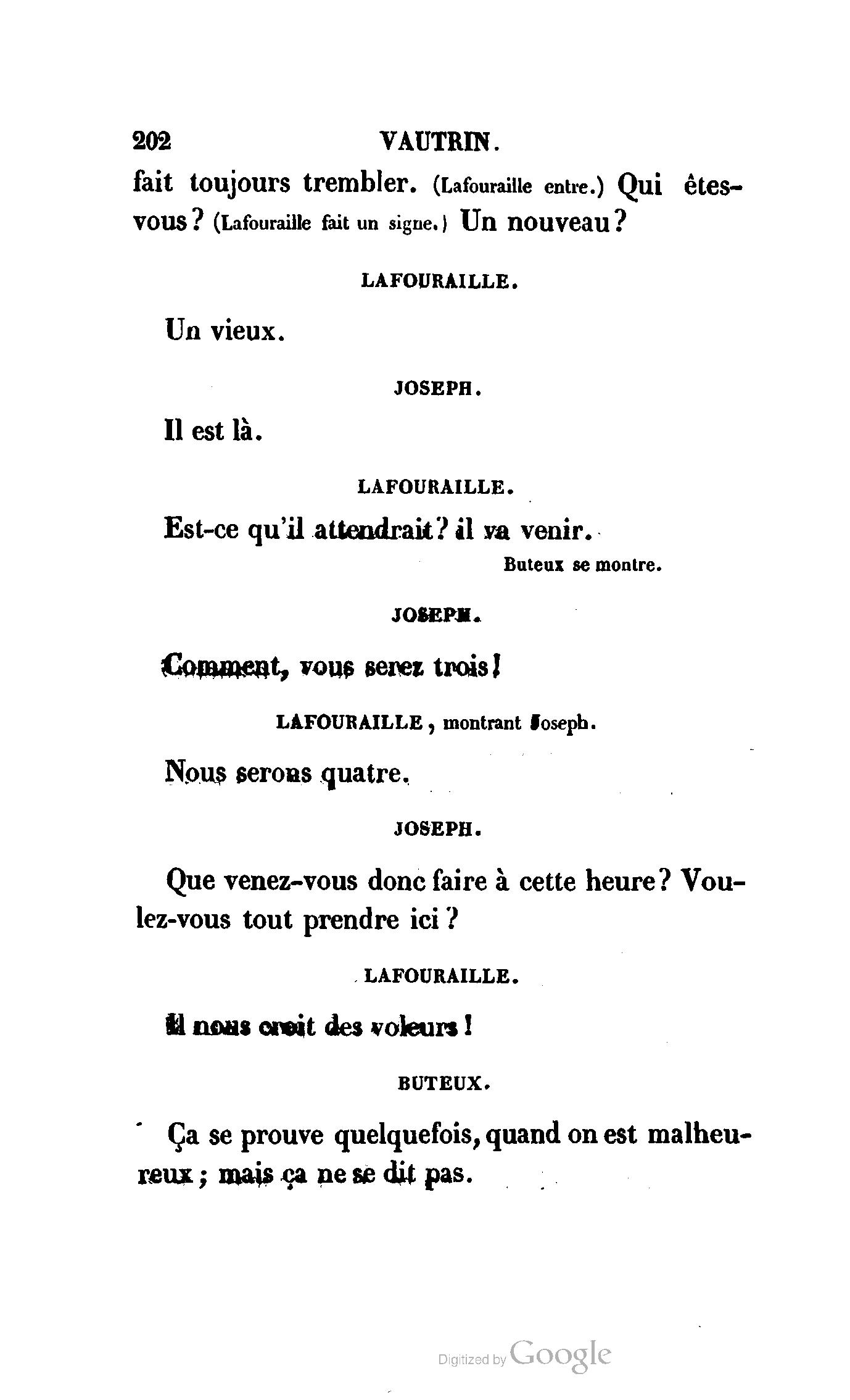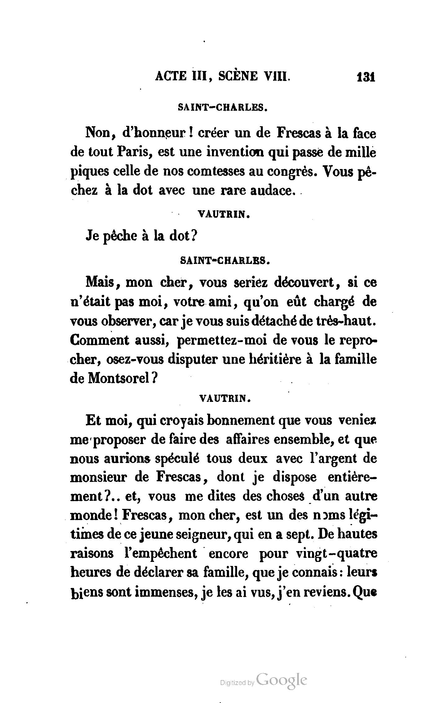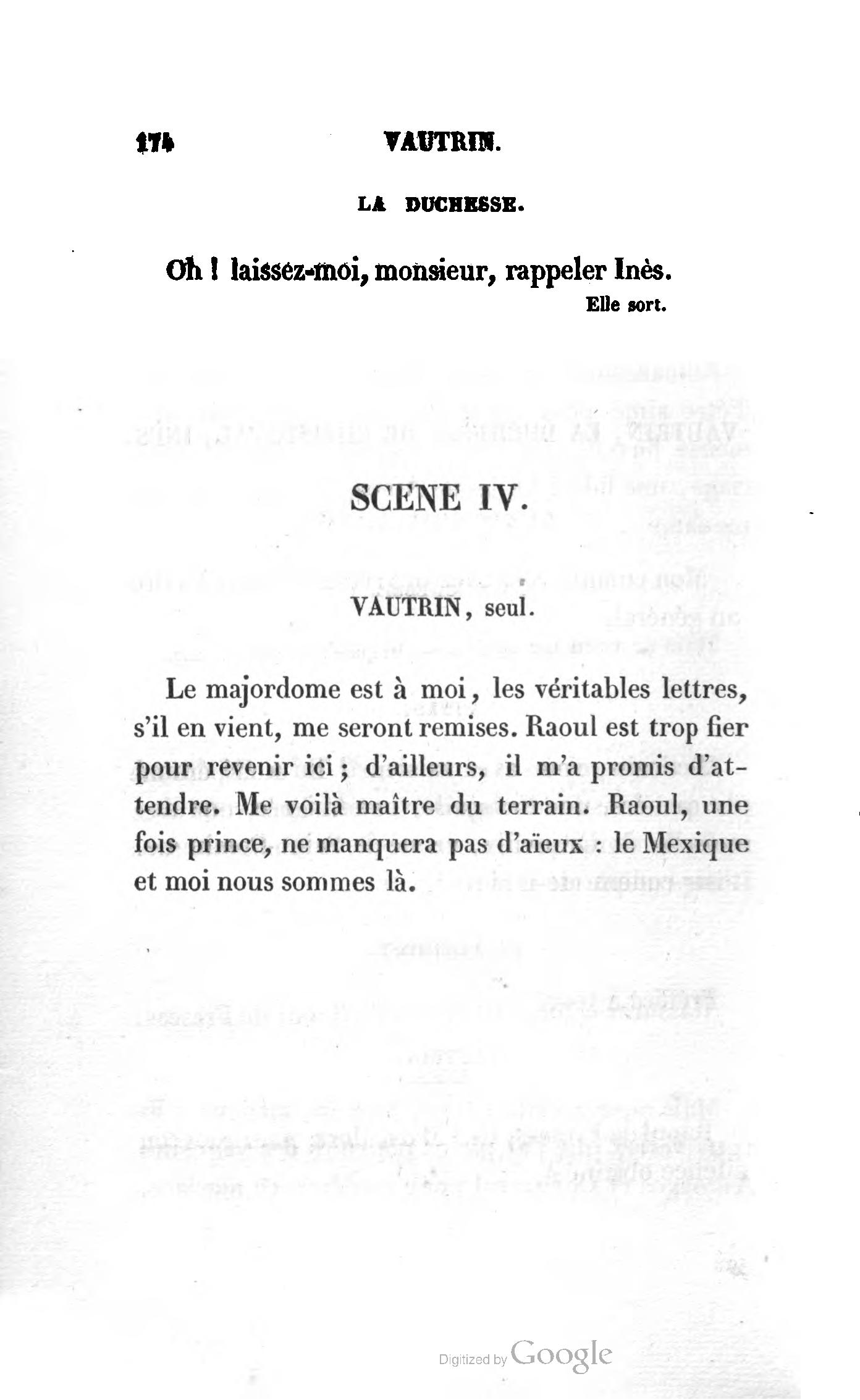 Chez vous, Monsieur le duc, laissez passer la justice du roi. C’est une affaire entre ces Messieurs et moi. (Au commissaire.) Je vous suis. (À la duchesse.) C’est Joseph qui les amène ; il est des nôtres ; renvoyez-le.
