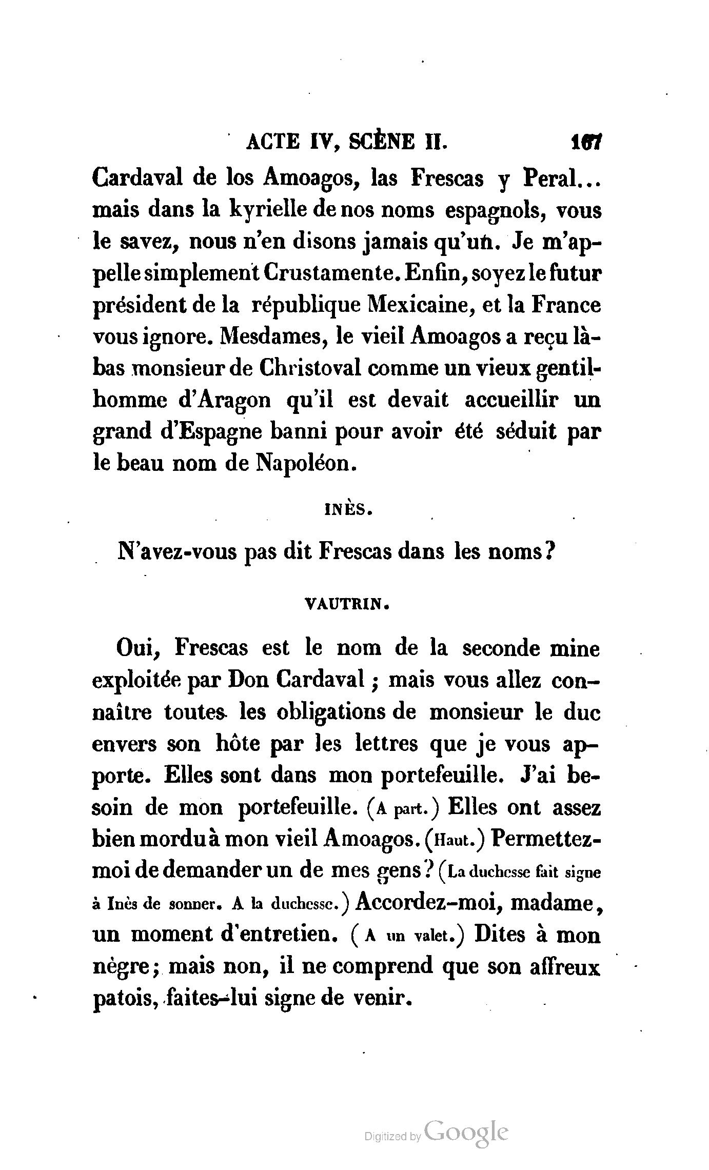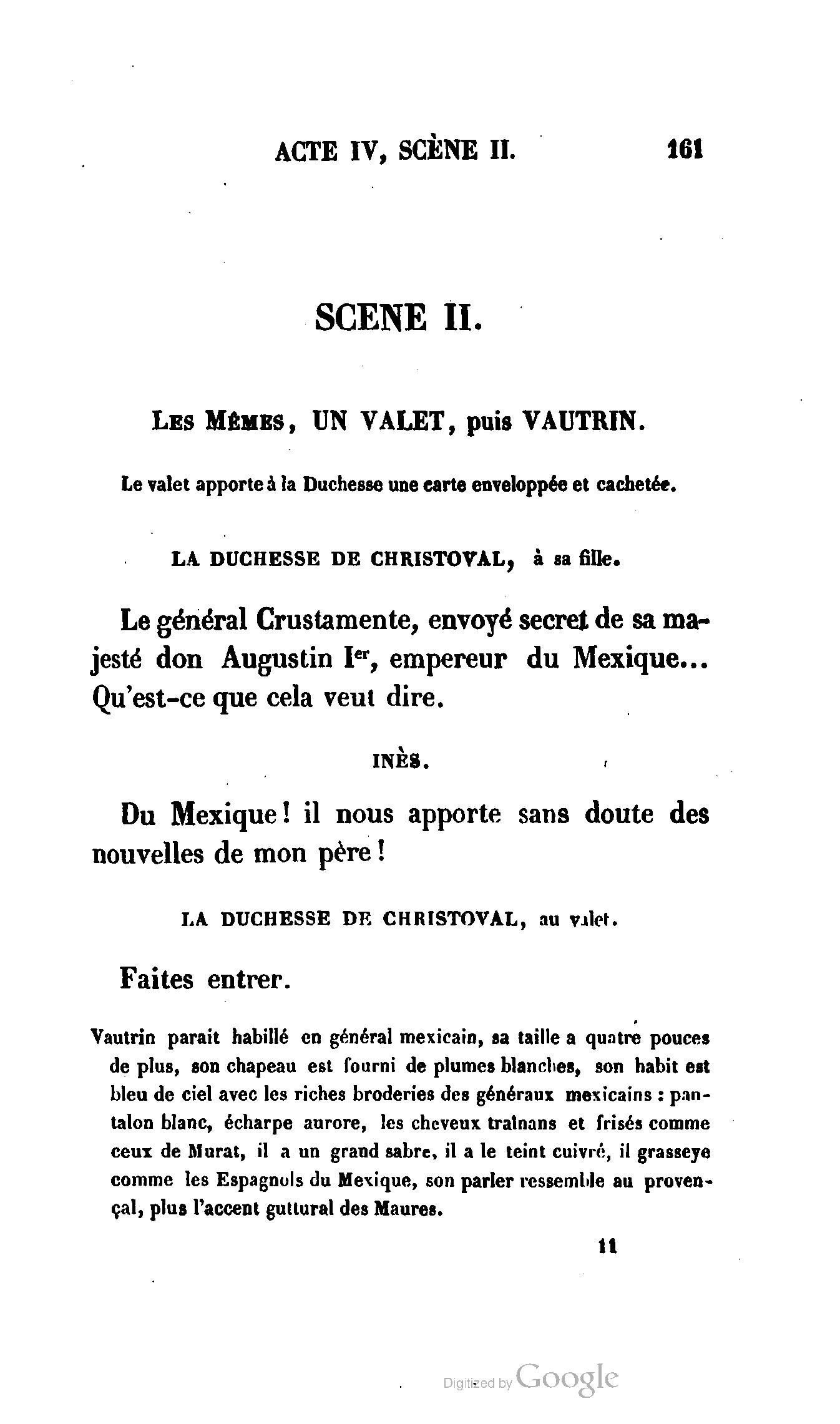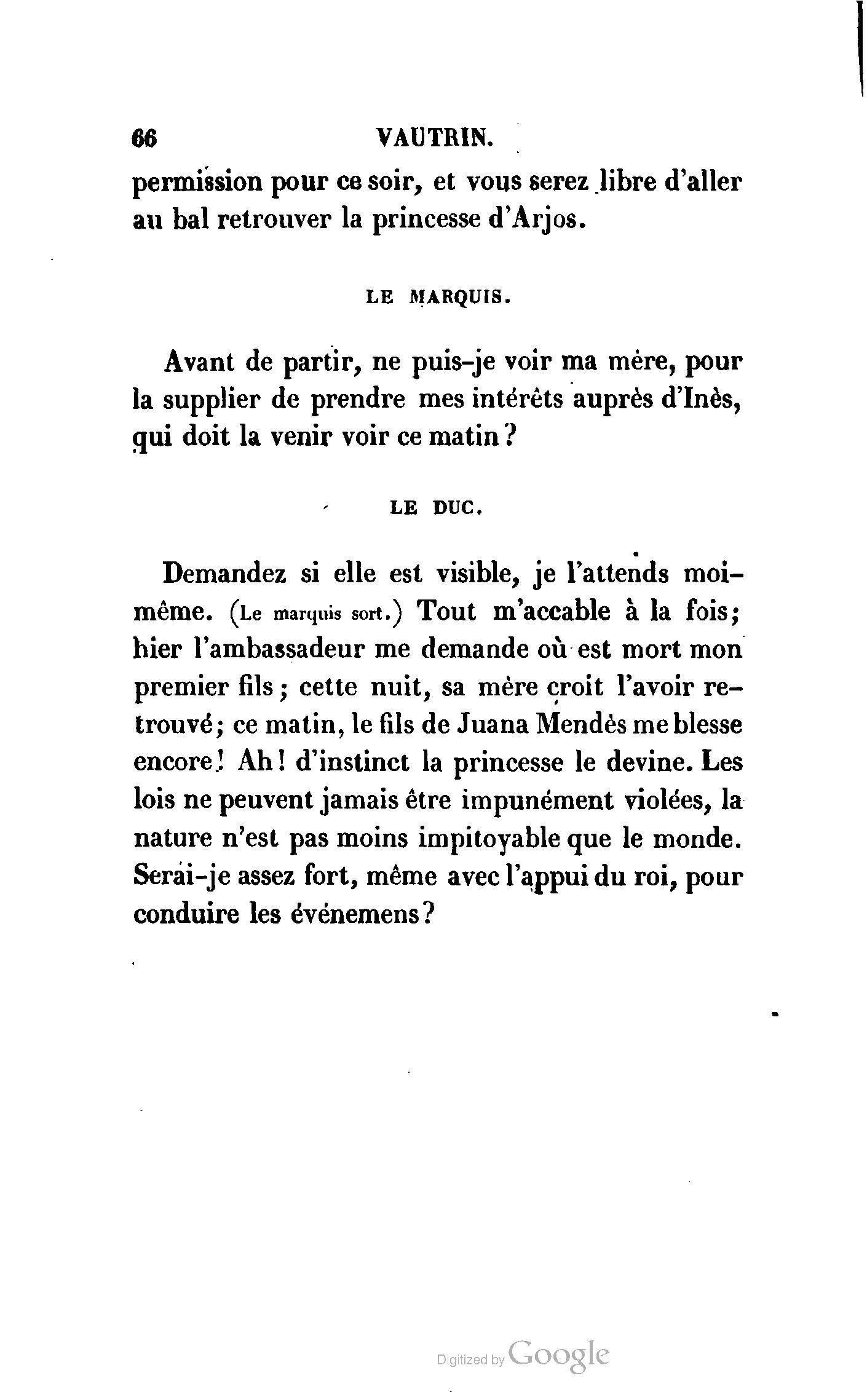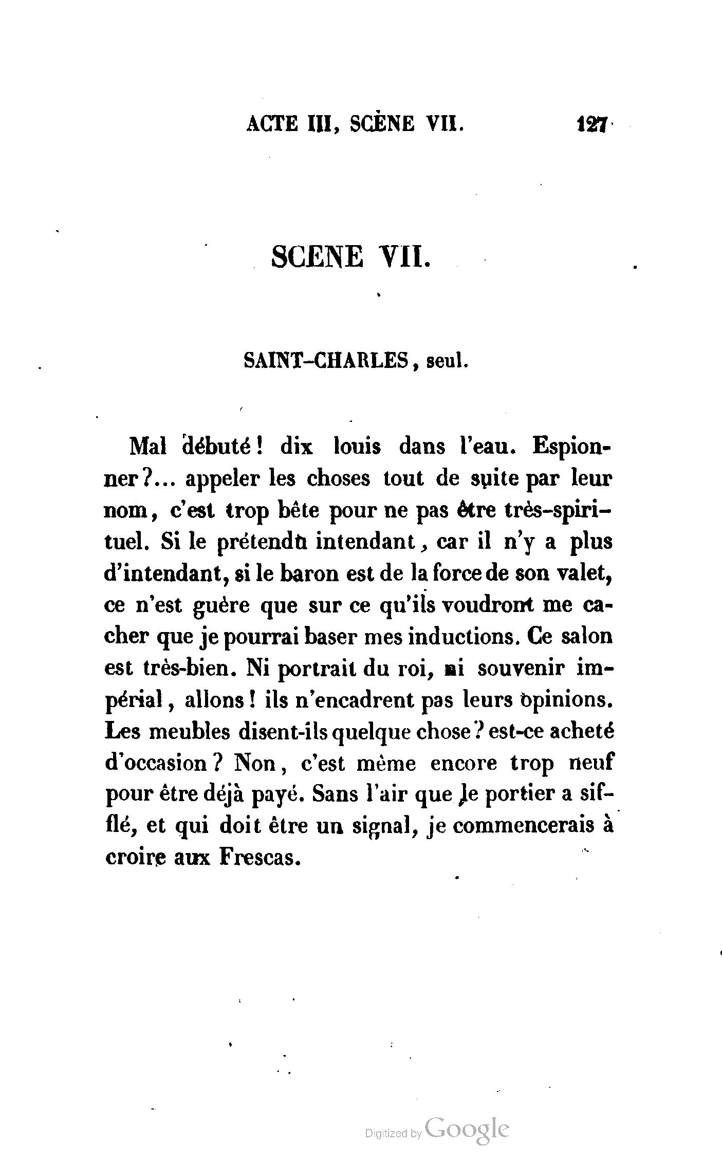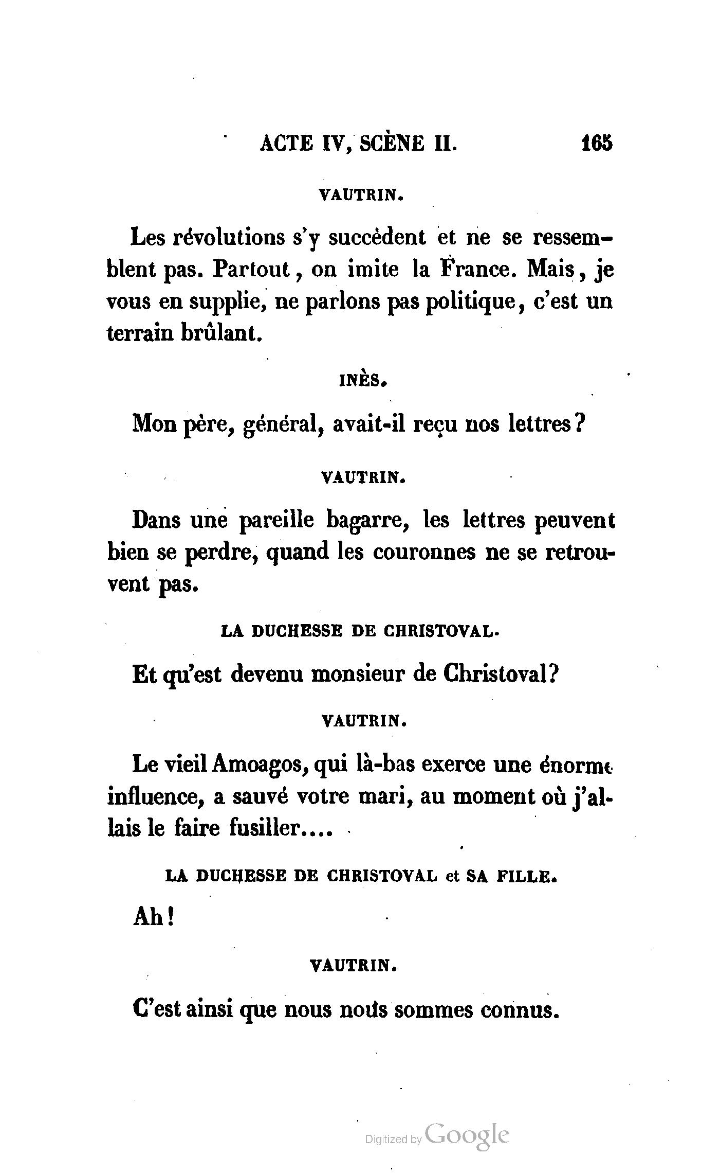 Chez vous, Monsieur le duc, laissez passer la justice du roi. C’est une affaire entre ces Messieurs et moi. (Au commissaire.) Je vous suis. (À la duchesse.) C’est Joseph qui les amène ; il est des nôtres ; renvoyez-le.