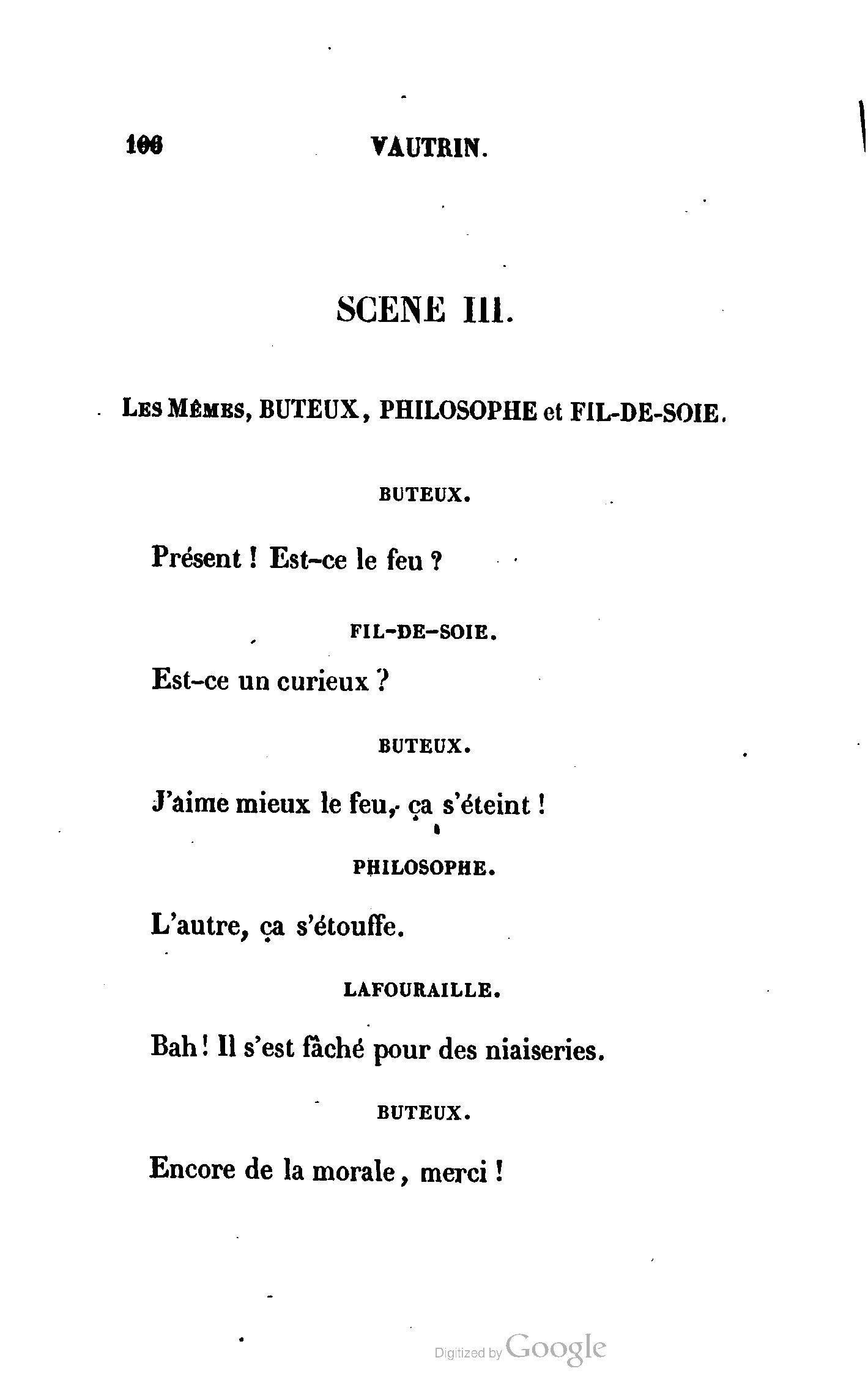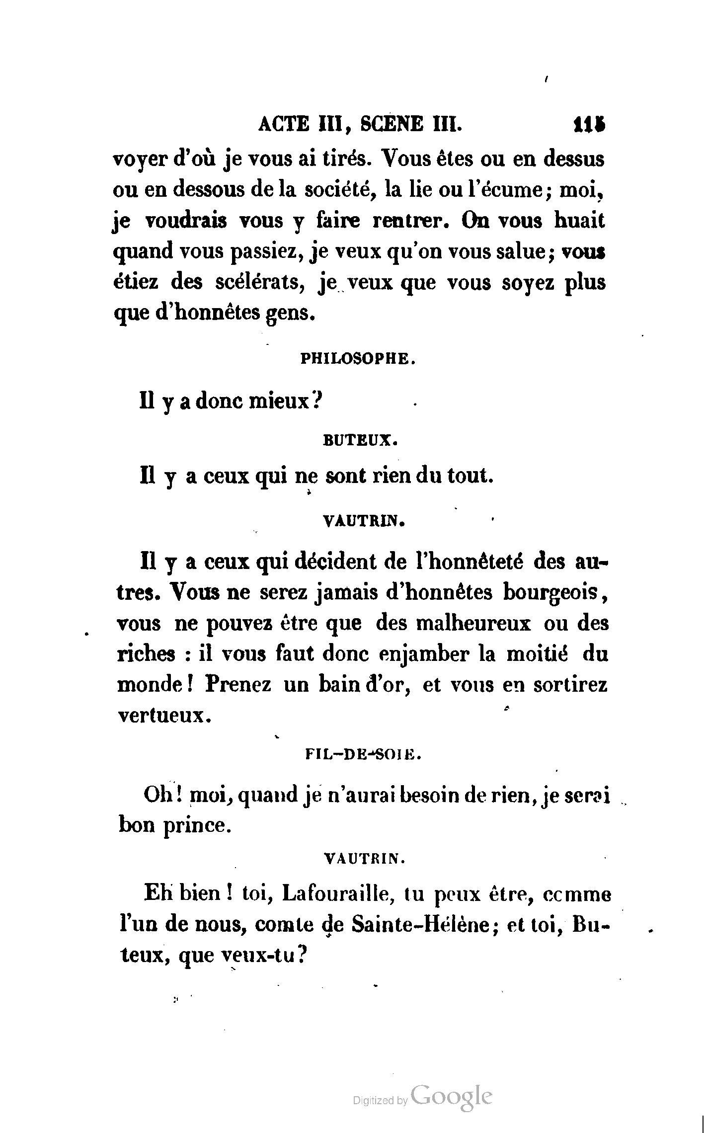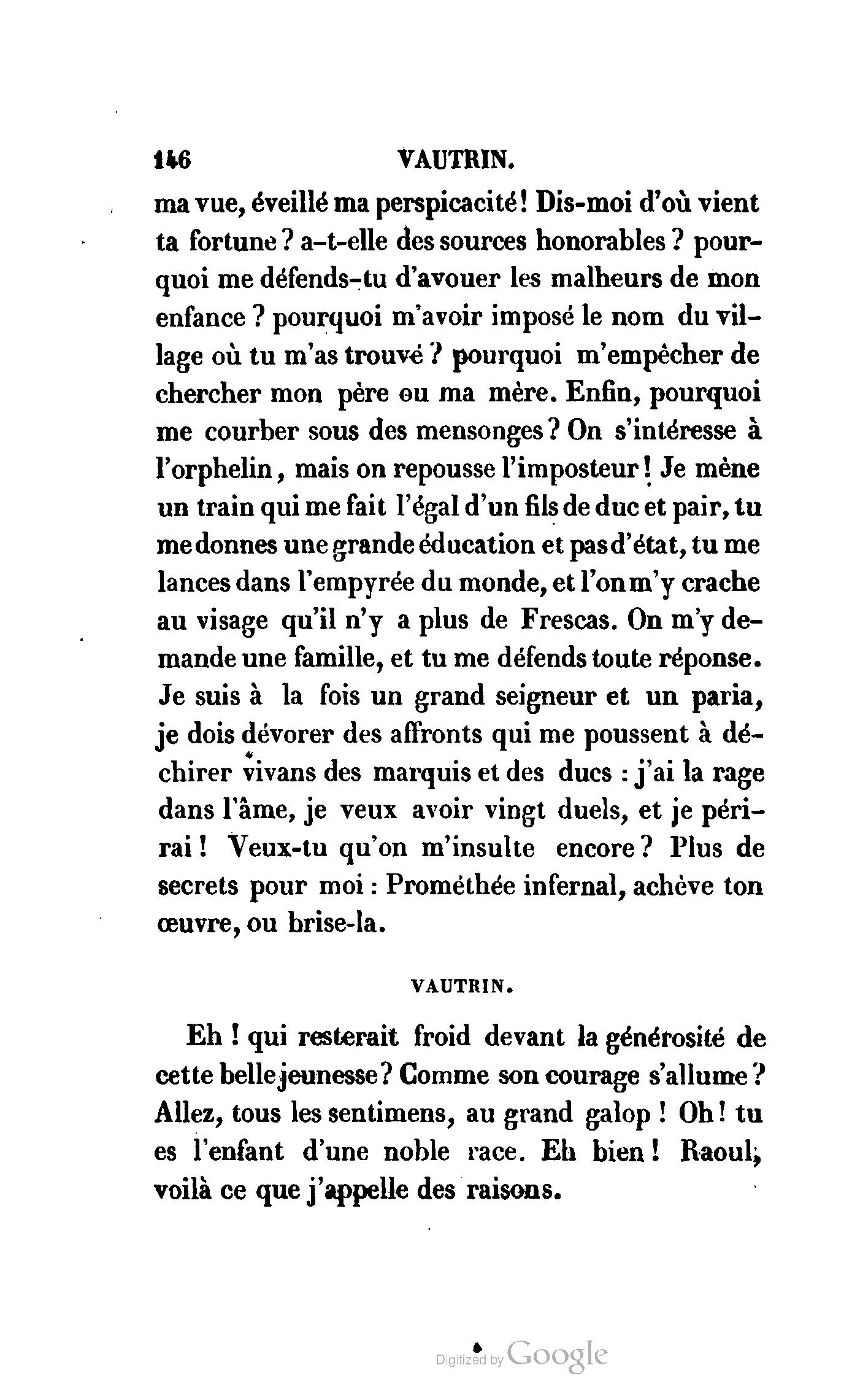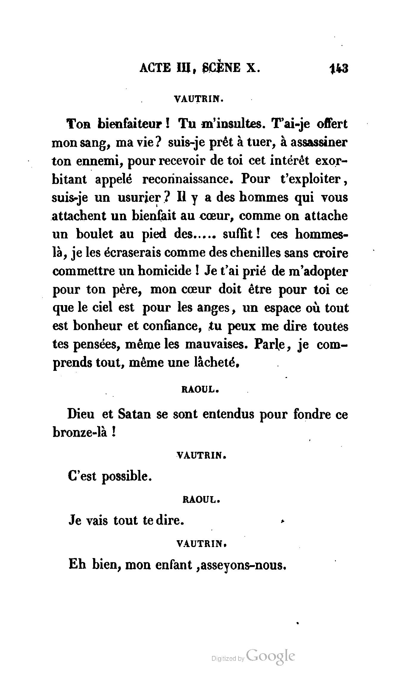 Irait-il prouver que Vautrin est un drame innocent autant qu'une pièce de Berquin ? Mais traiter la question de la moralité ou de l'immoralité du théâtre, ne serait-ce pas se mettre au-dessous des Prudhomme qui en font une question ?