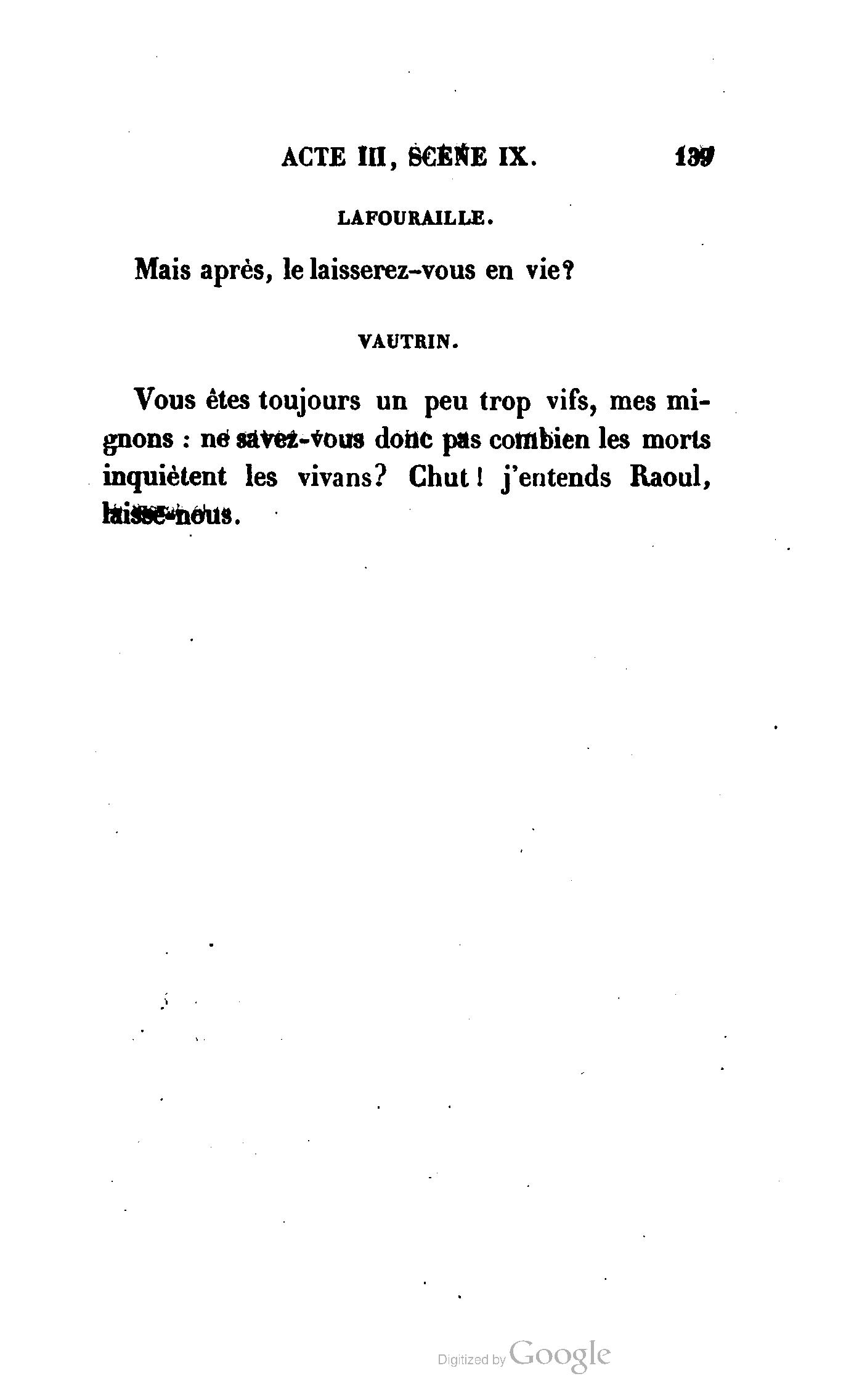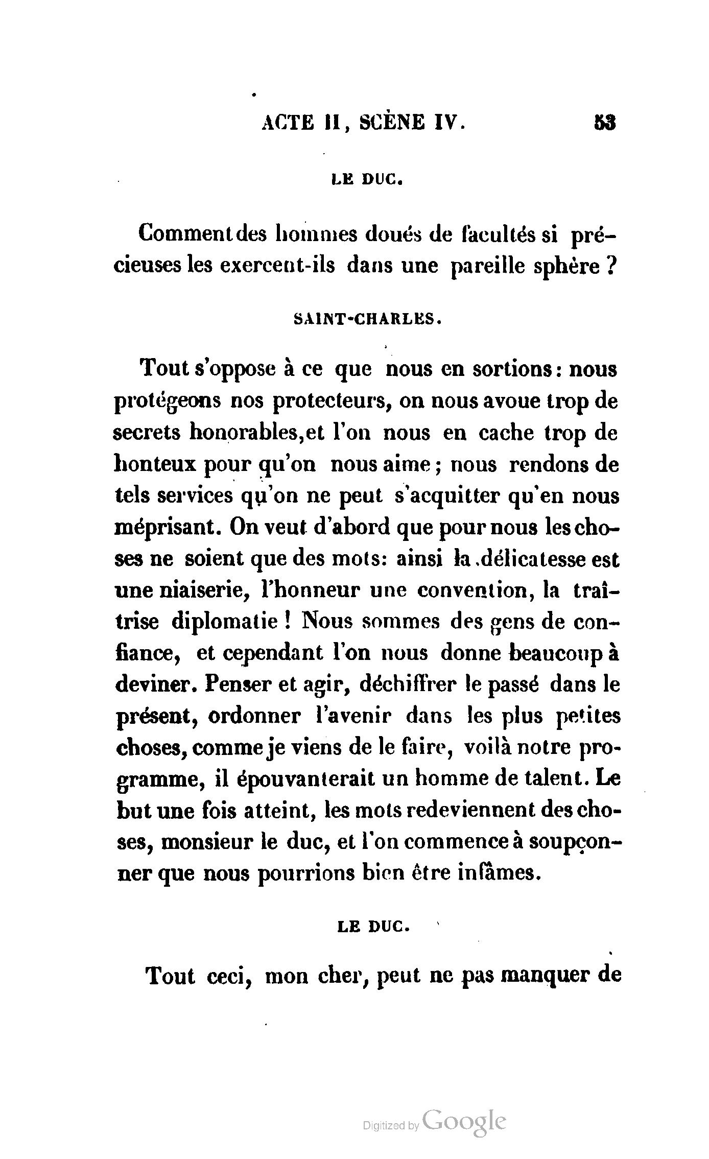 {p. II}Se plaindrait-il de la défense qui arrête la représentation de son drame ? Mais il ne connaîtrait donc ni son temps ni son pays. L'arbitraire est le péché mignon des gouvernemens constitutionnels ; c'est leur infidélité à eux ; et d'ailleurs, ne sait-il pas qu'il n'y a rien de plus cruel que les faibles ? à ce gouvernement-ci,comme aux enfans, il est permis de tout faire, excepté le bien et une majorité