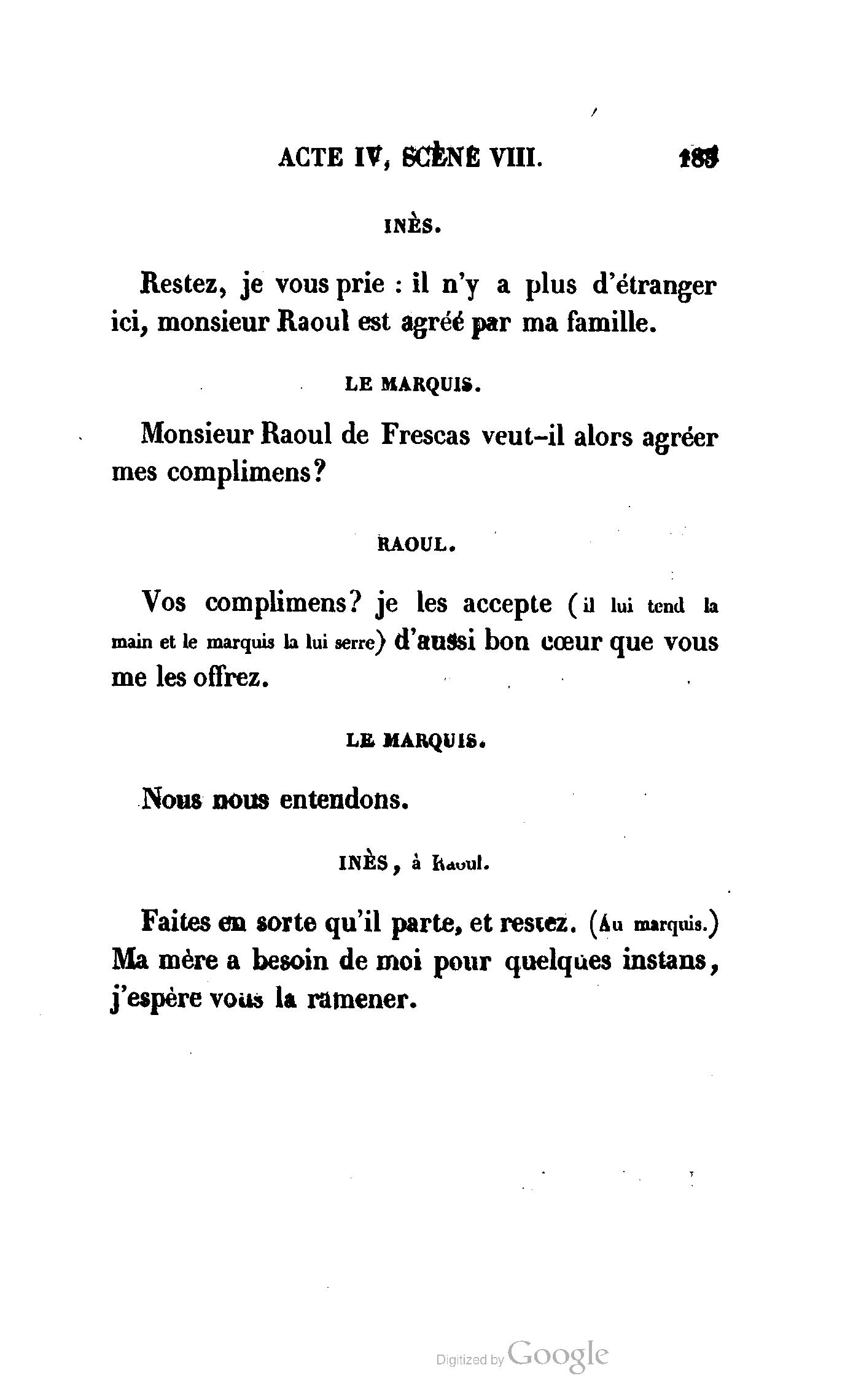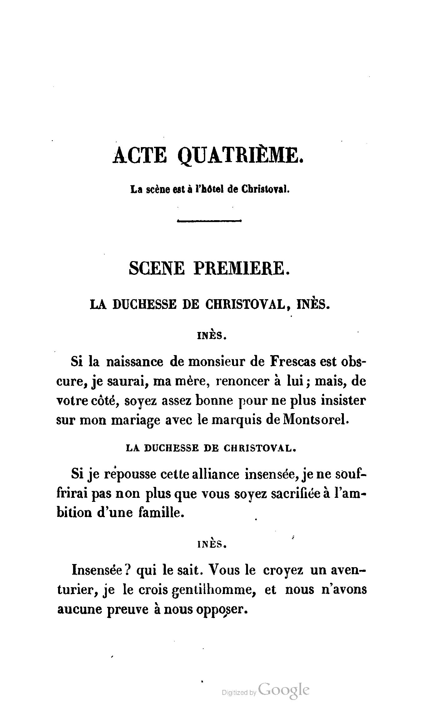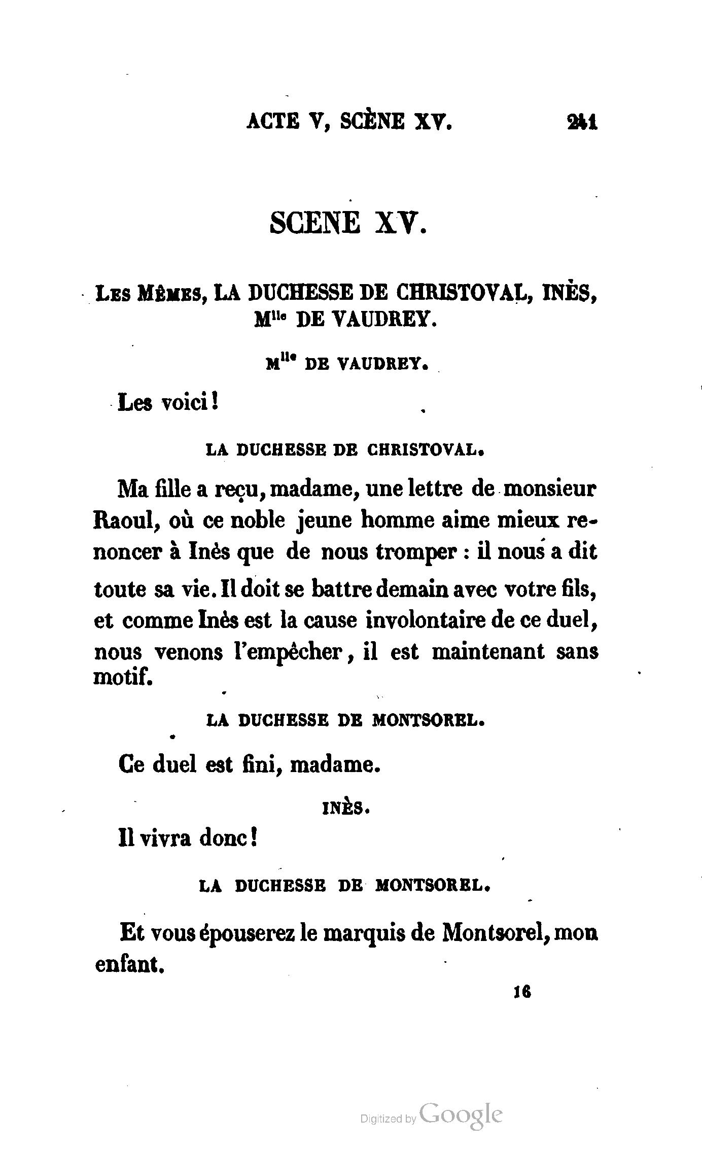 Ma fille a reçu, Madame, une lettre de Monsieur Raoul, où ce noble jeune homme aime mieux renoncer à Inès que de nous tromper : il nous a dit toute sa vie. Il doit se battre demain avec votre fils, et comme Inès est la cause involontaire de ce duel, nous venons l’empêcher, il est maintenant sans motif.