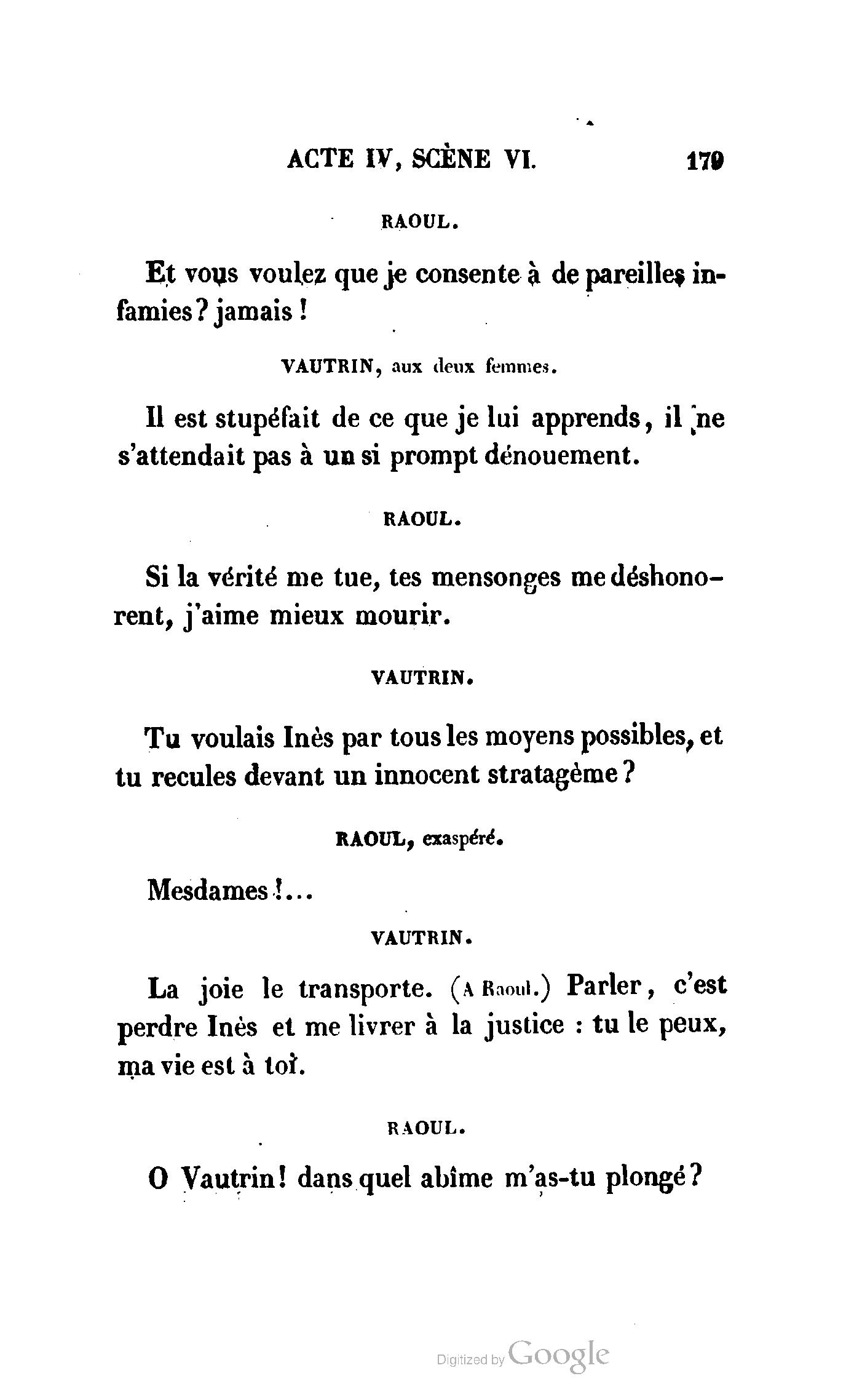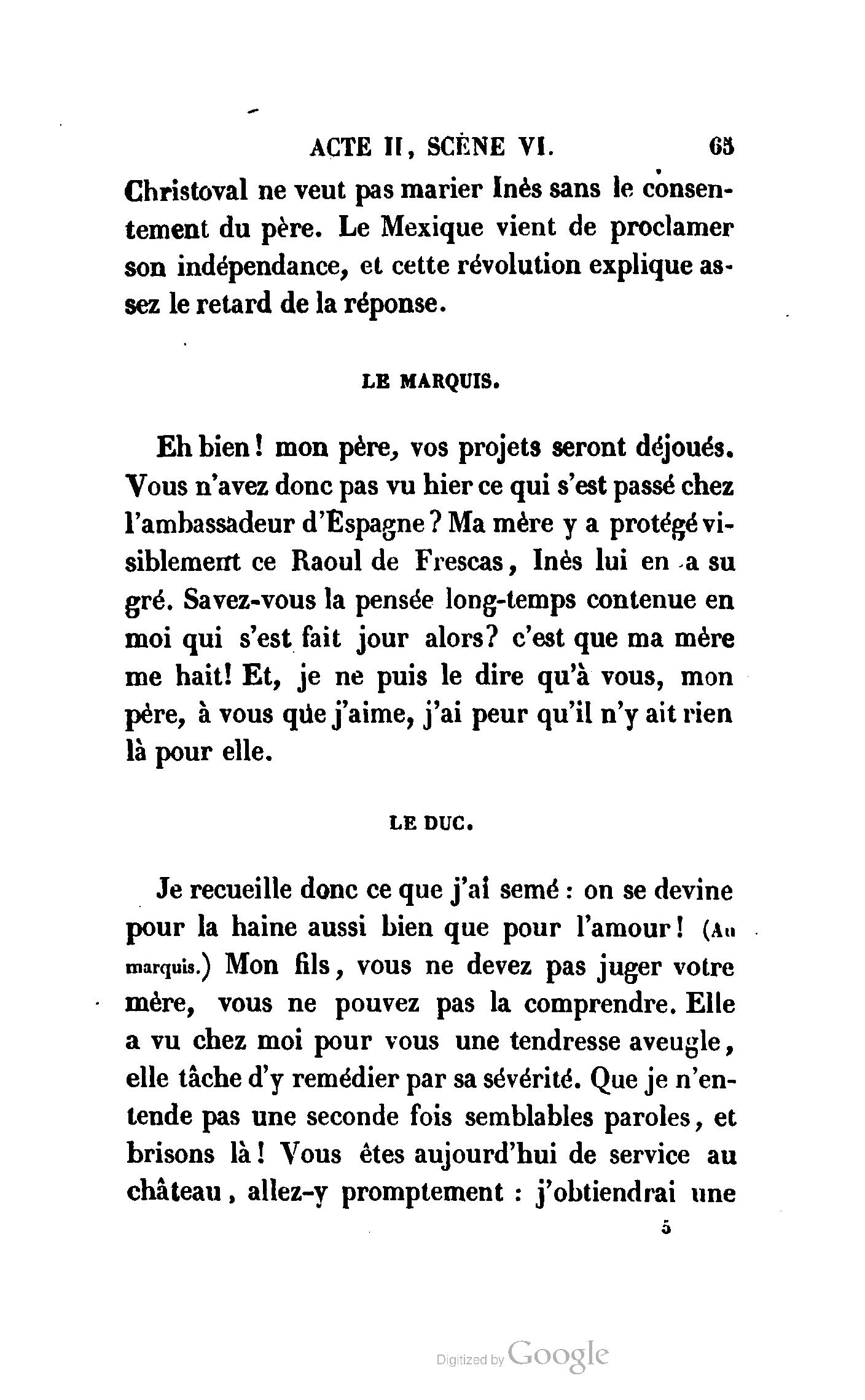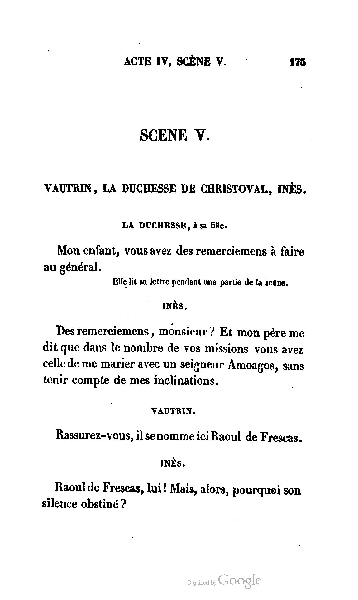 Ma fille a reçu, Madame, une lettre de Monsieur Raoul, où ce noble jeune homme aime mieux renoncer à Inès que de nous tromper : il nous a dit toute sa vie. Il doit se battre demain avec votre fils, et comme Inès est la cause involontaire de ce duel, nous venons l’empêcher, il est maintenant sans motif.