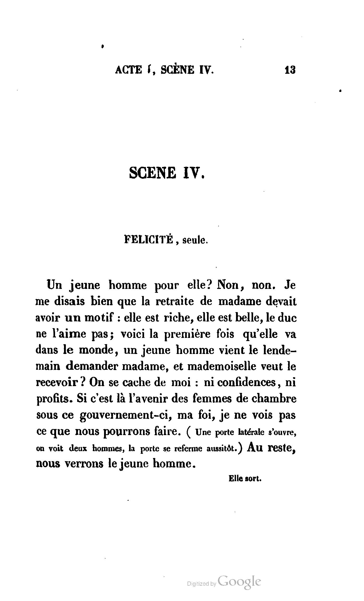 Un jeune homme pour elle ? Non, non. Je me disais bien que la retraite de Madame devait avoir un motif : elle est riche, elle est belle, le duc ne l’aime pas ; voici la première fois qu’elle va dans le monde, un jeune homme vient le lendemain demander Madame, et Mademoiselle veut le recevoir ? On se cache de moi : ni confidences, ni profits. Si c’est là l’avenir des femmes de chambre sous ce gouvernement-ci, ma foi, je ne vois pas ce que nous pourrons faire. (Une porte latérale s’ouvre, on voit deux hommes, la porte se referme aussitôt.) Au reste, nous verrons le jeune homme.