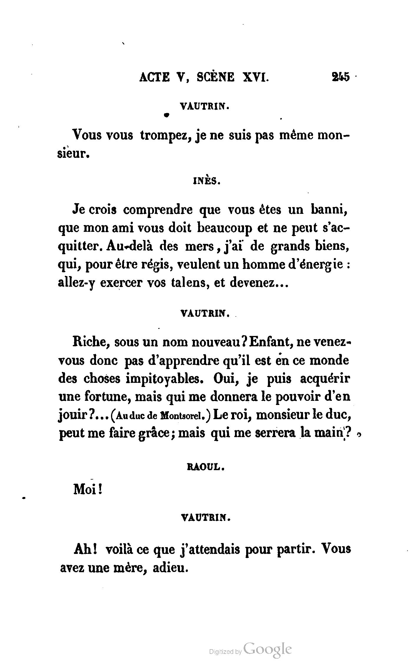 Riche, sous un nom nouveau ! Enfant, ne venez-vous donc pas d’apprendre qu’il est en ce monde des choses impitoyables. Oui, je puis acquérir une fortune ; mais qui me donnera le pouvoir d’en jouir ?… (Au duc de Montsorel.) Le roi, Monsieur le duc, peut me faire grâce ; mais qui me serrera la main ?