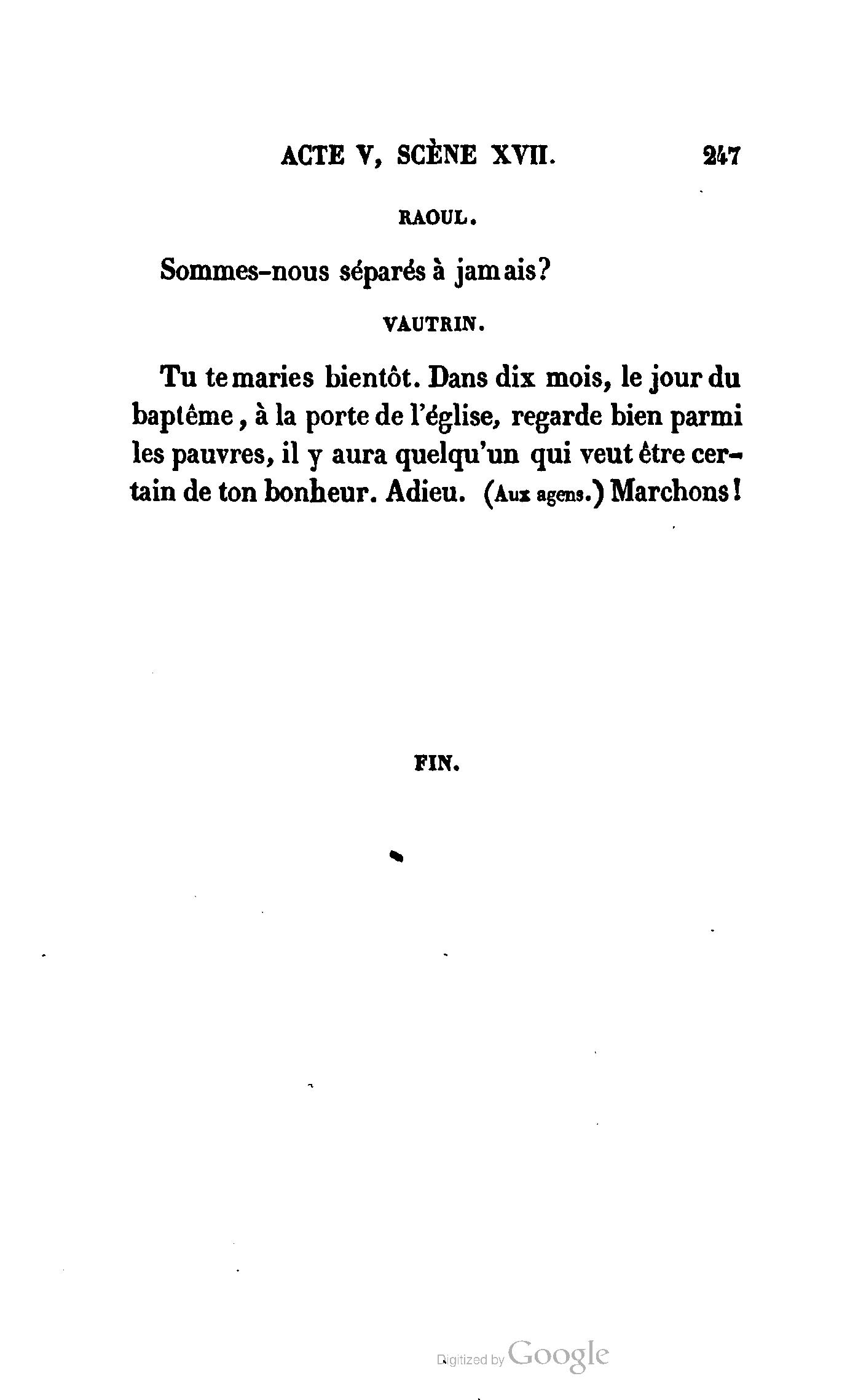 Tu te maries bientôt. Dans dix mois le jour du baptême, à la porte de l’église, regarde bien parmi les pauvres, il y aura quelqu’un qui veut être certain de ton bonheur. Adieu ! (Aux agens.) Marchons !