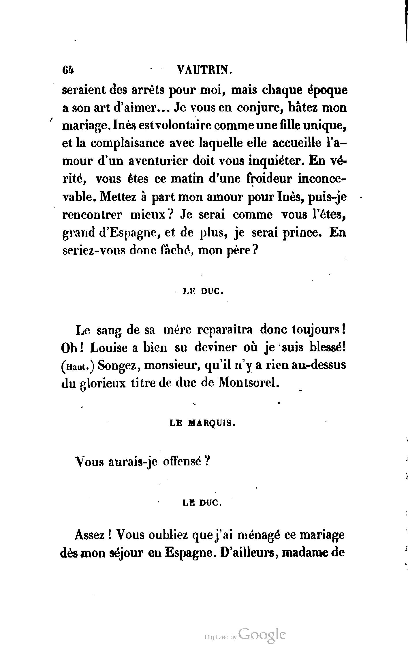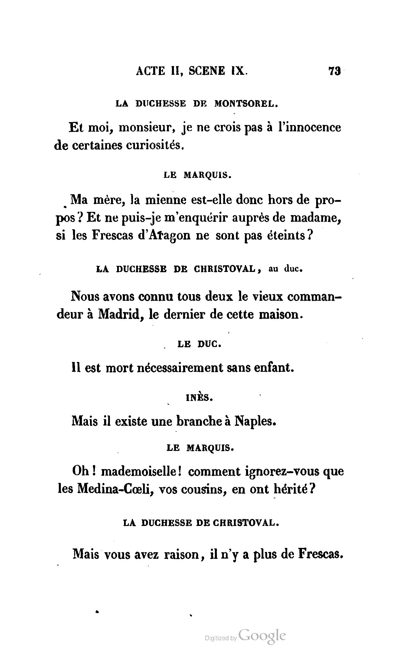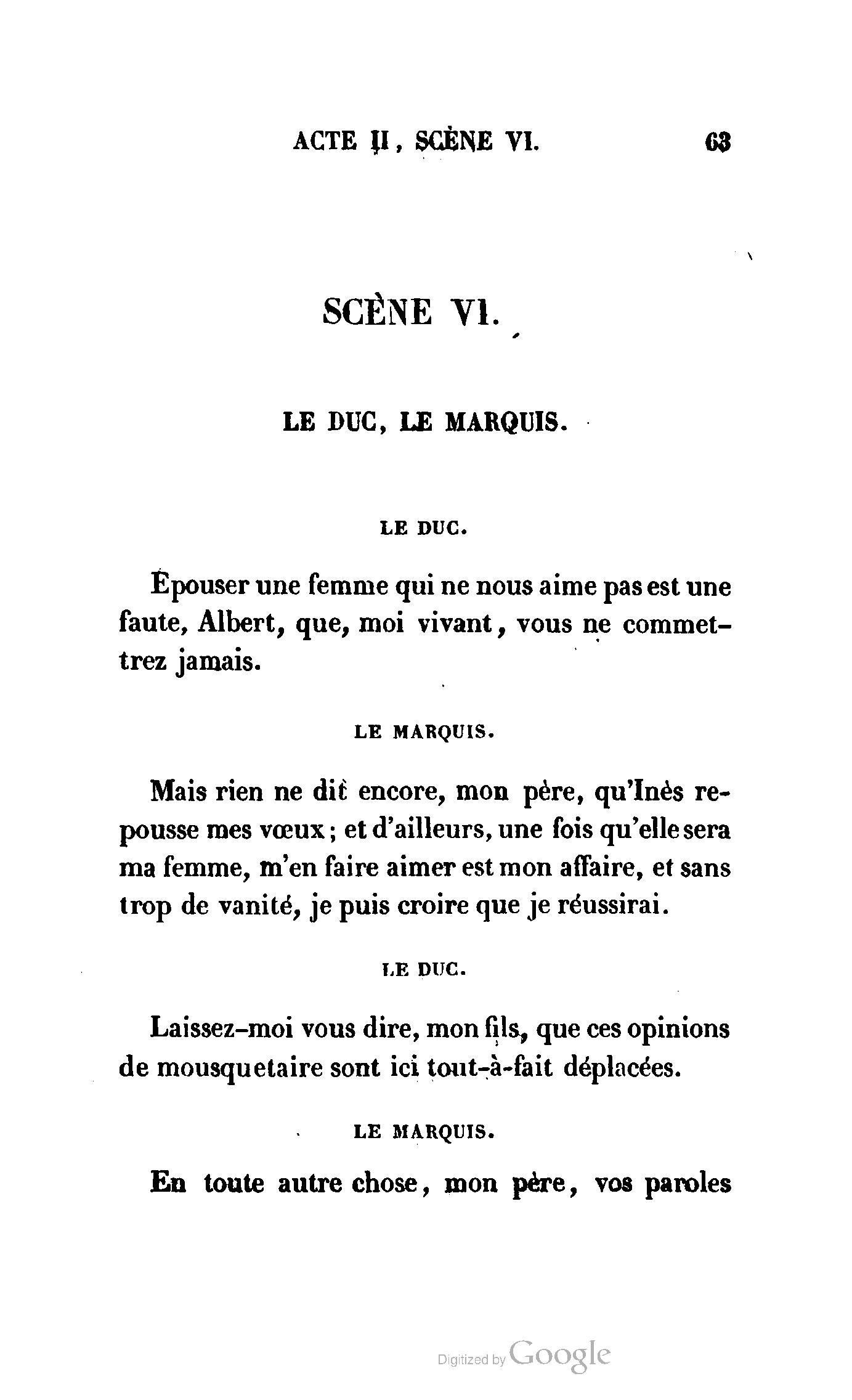 Inès, la prétendue de votre fils le marquis ? Et pensez-vous que le duc n’ait pas été frappé de cet accueil fait à un rival de son fils ?