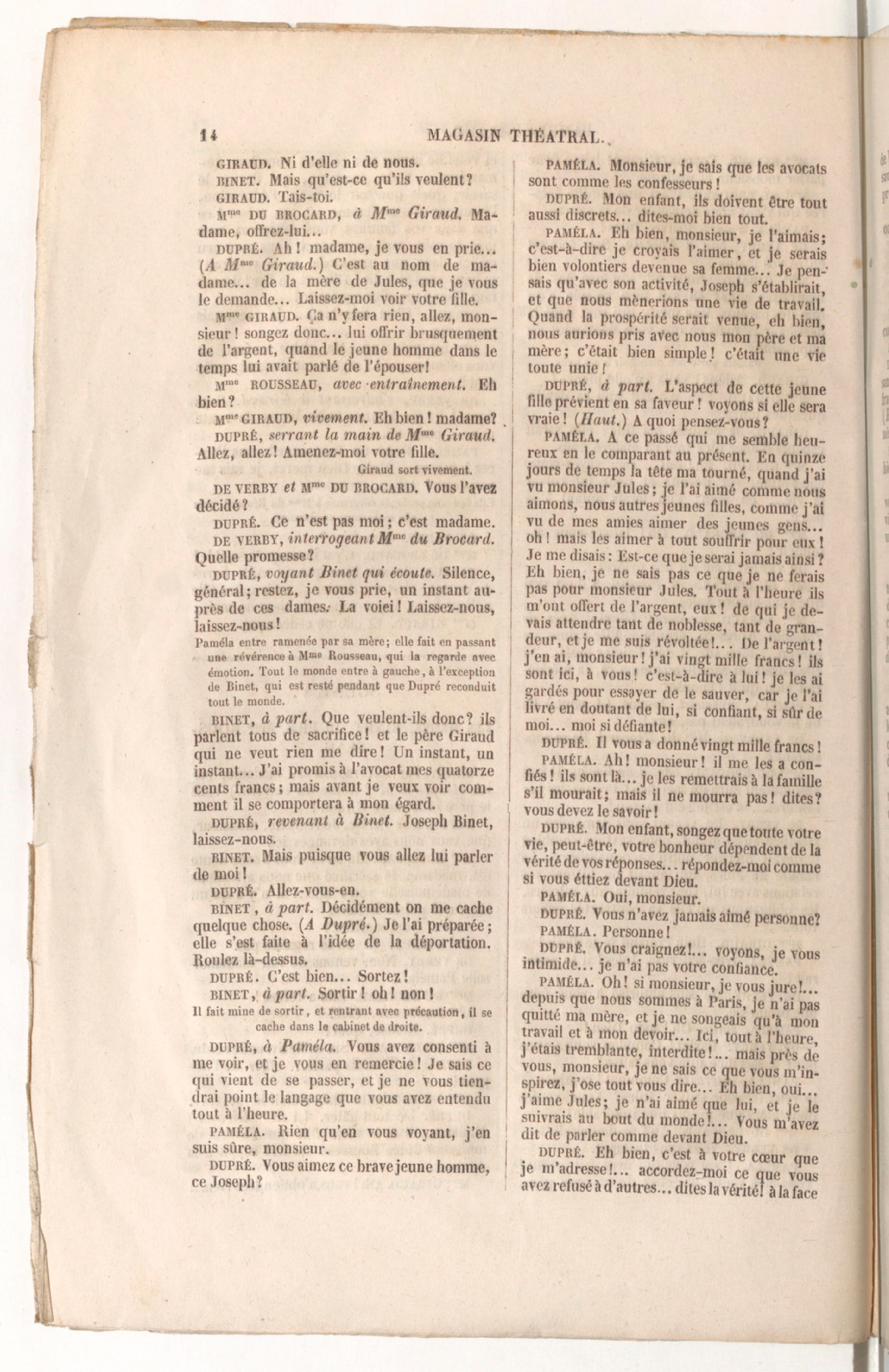 Tais-toi ! tais-toi ! (Mouvement général d’effroi ; Dupré regarde avec anxiété la chambre où est Paméla. À Binet.) T’arrêter !…