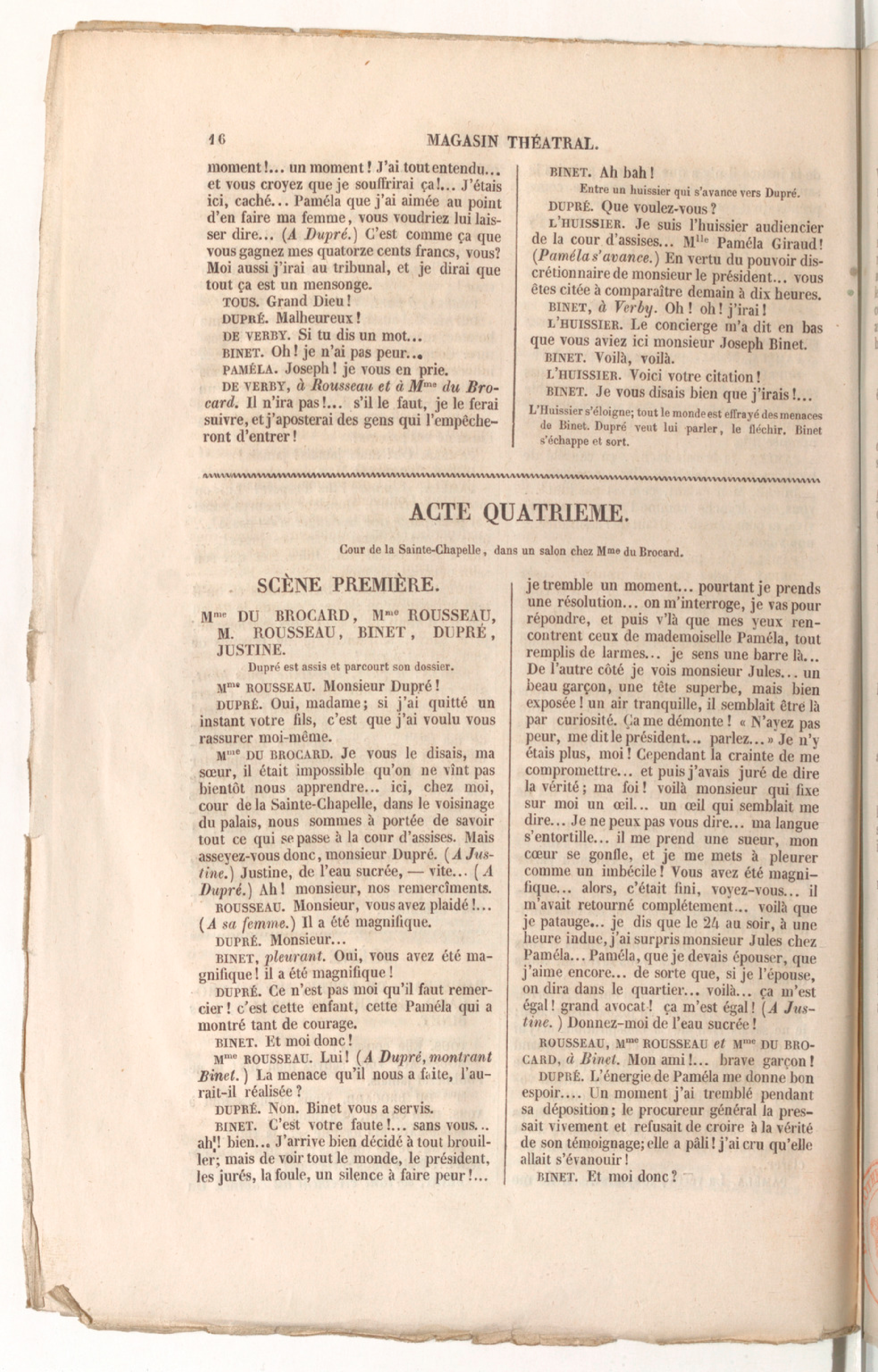 Eh bien ! (Madame du Brocard lui remet la lettre qu ’ il a demandée ; Verby lui donne la sienne ; Rousseau l’examine.) Enfin !… (De Verby lance un regard {p. 26} furieux à Dupré et à la famille, et sort vivement. À Rousseau) Et vous, monsieur ?