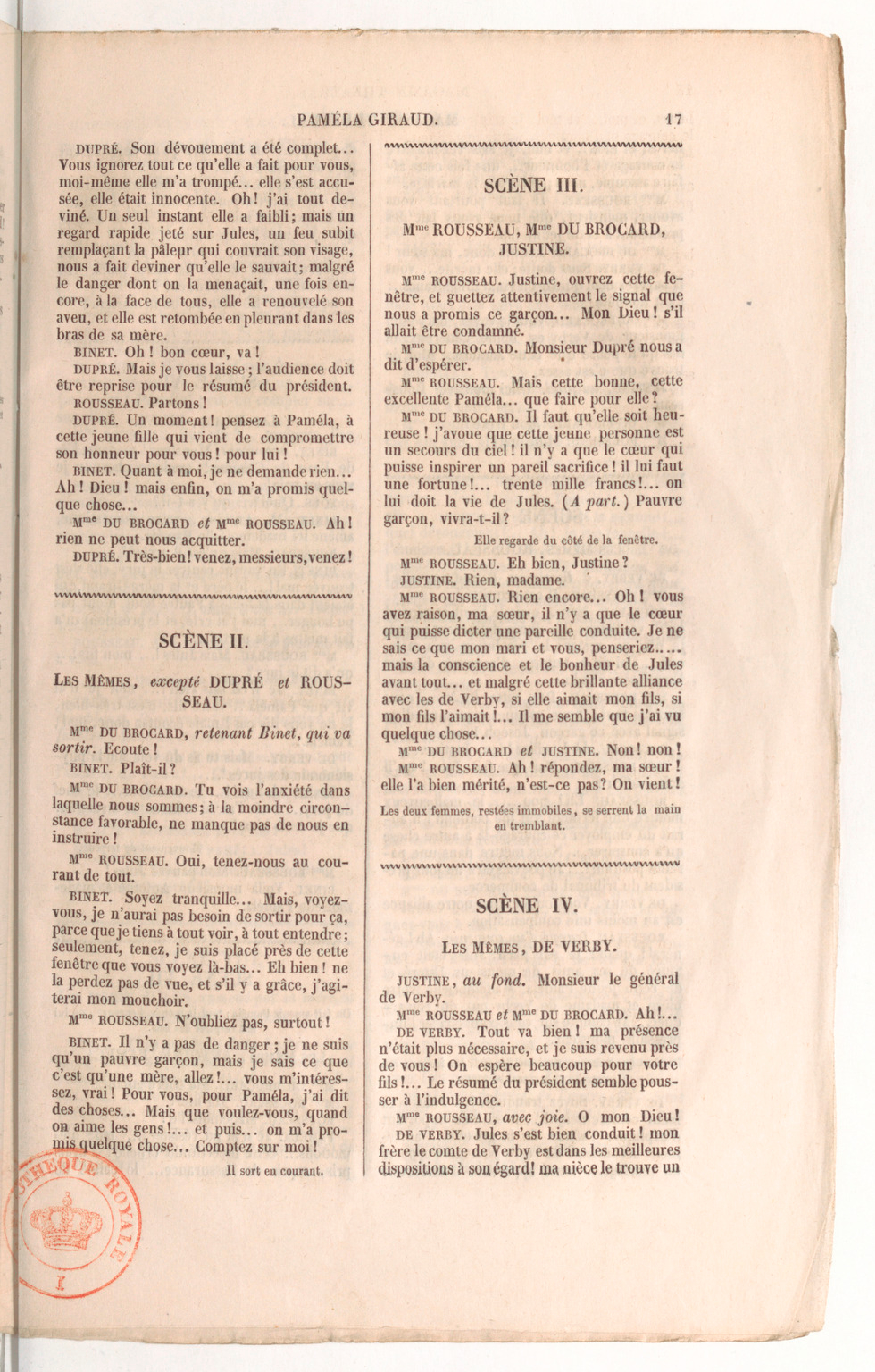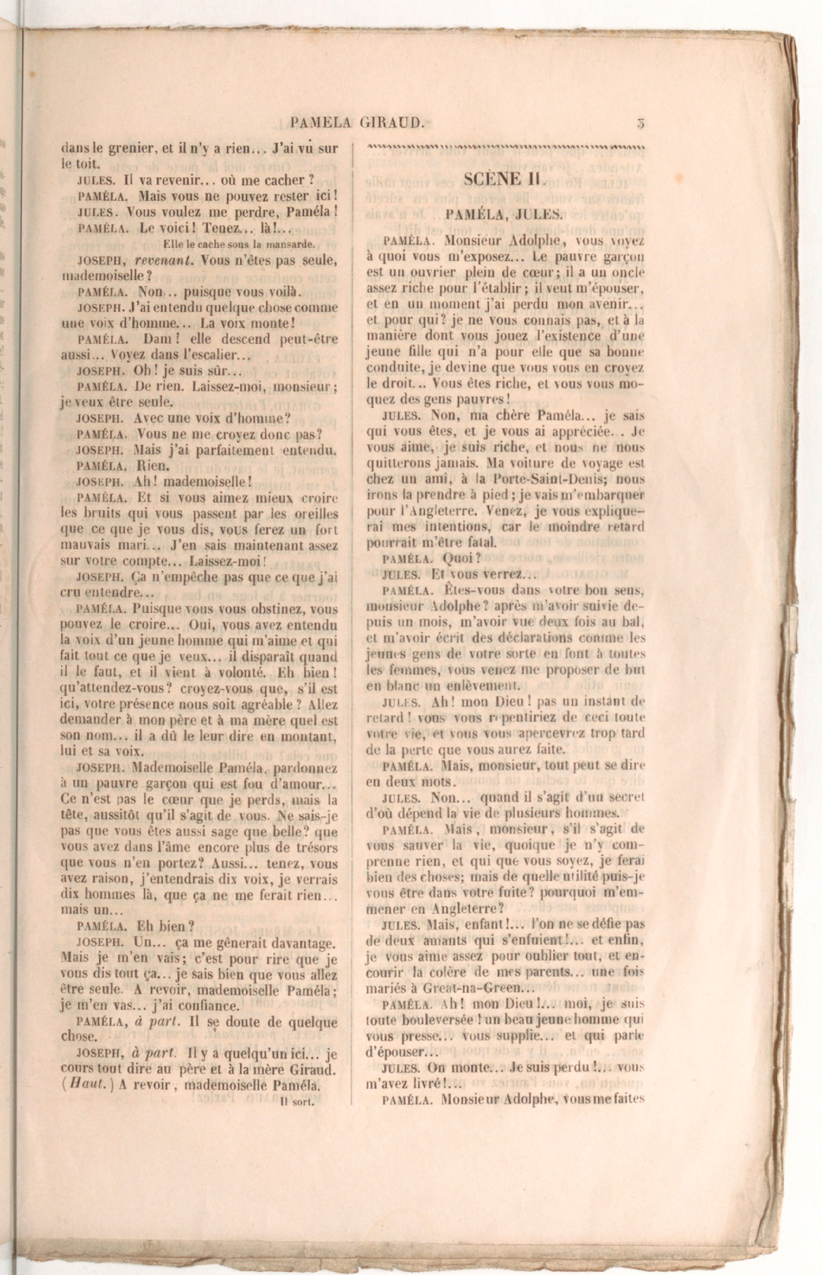 Non, ma chère Paméla… je sais qui vous êtes, et je vous ai appréciée… Je vous aime, je suis riche, et nous ne nous quitterons jamais. Ma voiture de voyage est chez un ami, à la Porte-Saint-Denis ; nous irons la prendre à pied ; je vais m’embarquer pour l’Angleterre. Venez, je vous expliquerai mes intentions, car le moindre retard pourrait m’être fatal.