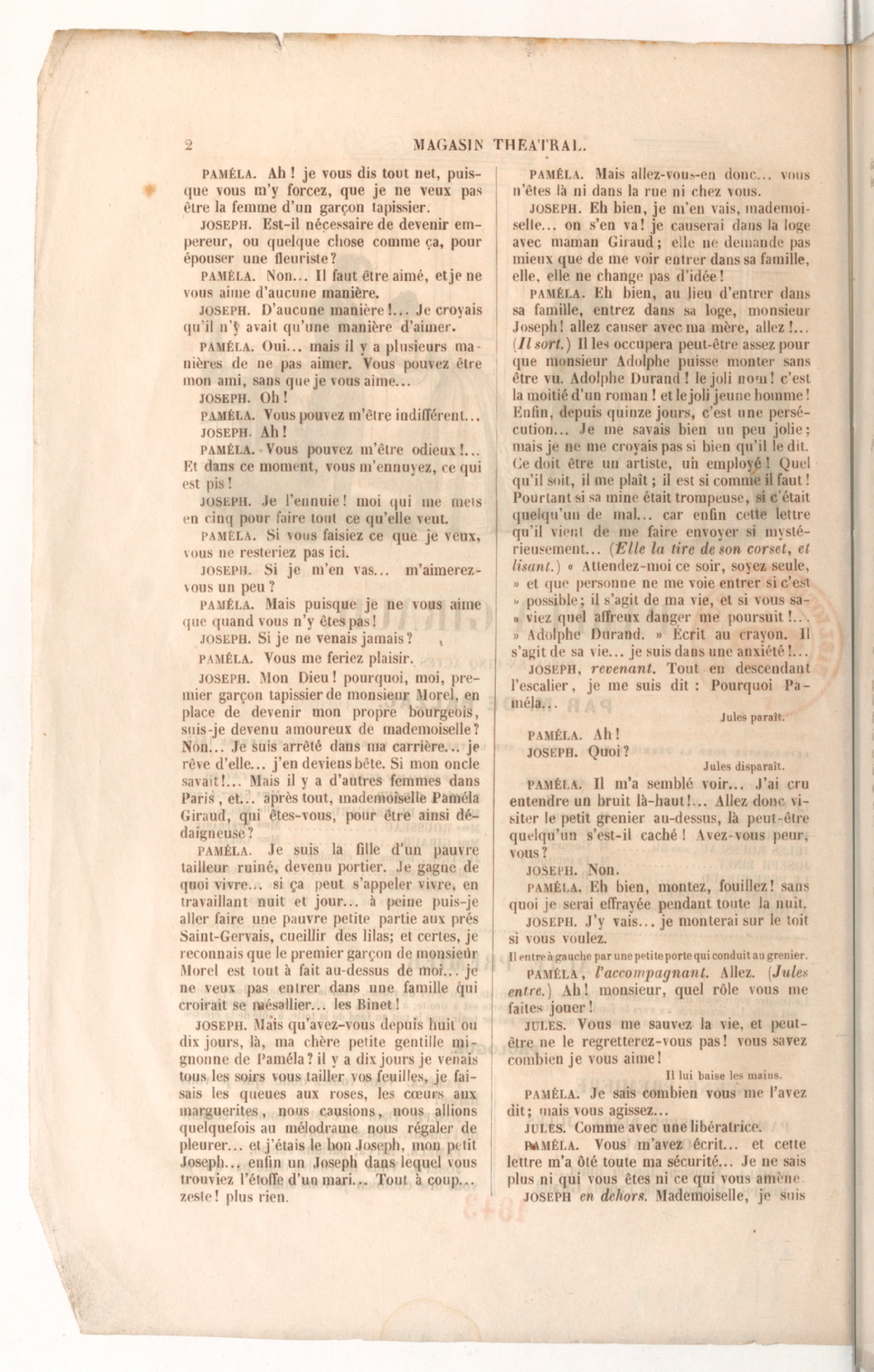 Mais qu’avez-vous depuis huit ou dix jours, là, ma chère petite gentille mignonne de Paméla ? il y a dix jours je venais tous les soirs vous tailler vos feuilles, je faisais les queues aux roses, les cœurs aux marguerites, nous causions, nous allions quelquefois au mélodrame nous régaler de pleurer… et j’étais le bon Joseph, mon petit Joseph… enfin un Joseph dans lequel vous trouviez l’étoffe d’un mari… Tout à coup… zeste ! plus rien.
