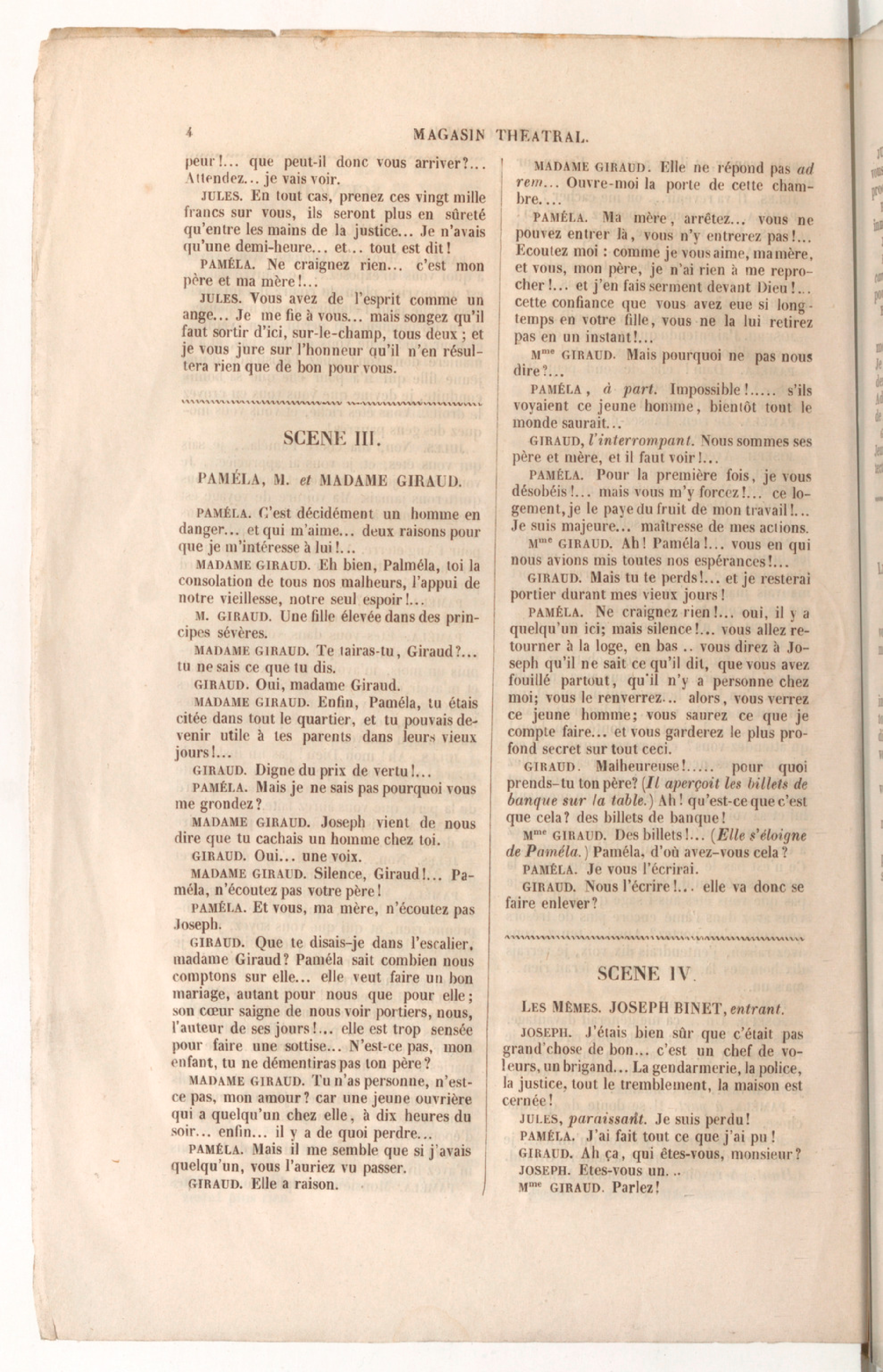 Je suis la fille d’un pauvre tailleur ruiné, devenu portier. Je gagne de quoi vivre… si ça peut s’appeler vivre, en travaillant nuit et jour… à peine puis-je aller faire une pauvre petite partie aux prés Saint-Gervais, cueillir des lilas ; et certes, je reconnais que le premier garçon de monsieur Morel est tout à fait au-dessus de moi… je ne veux pas entrer dans une famille qui croirait se mésallier… les Binet !