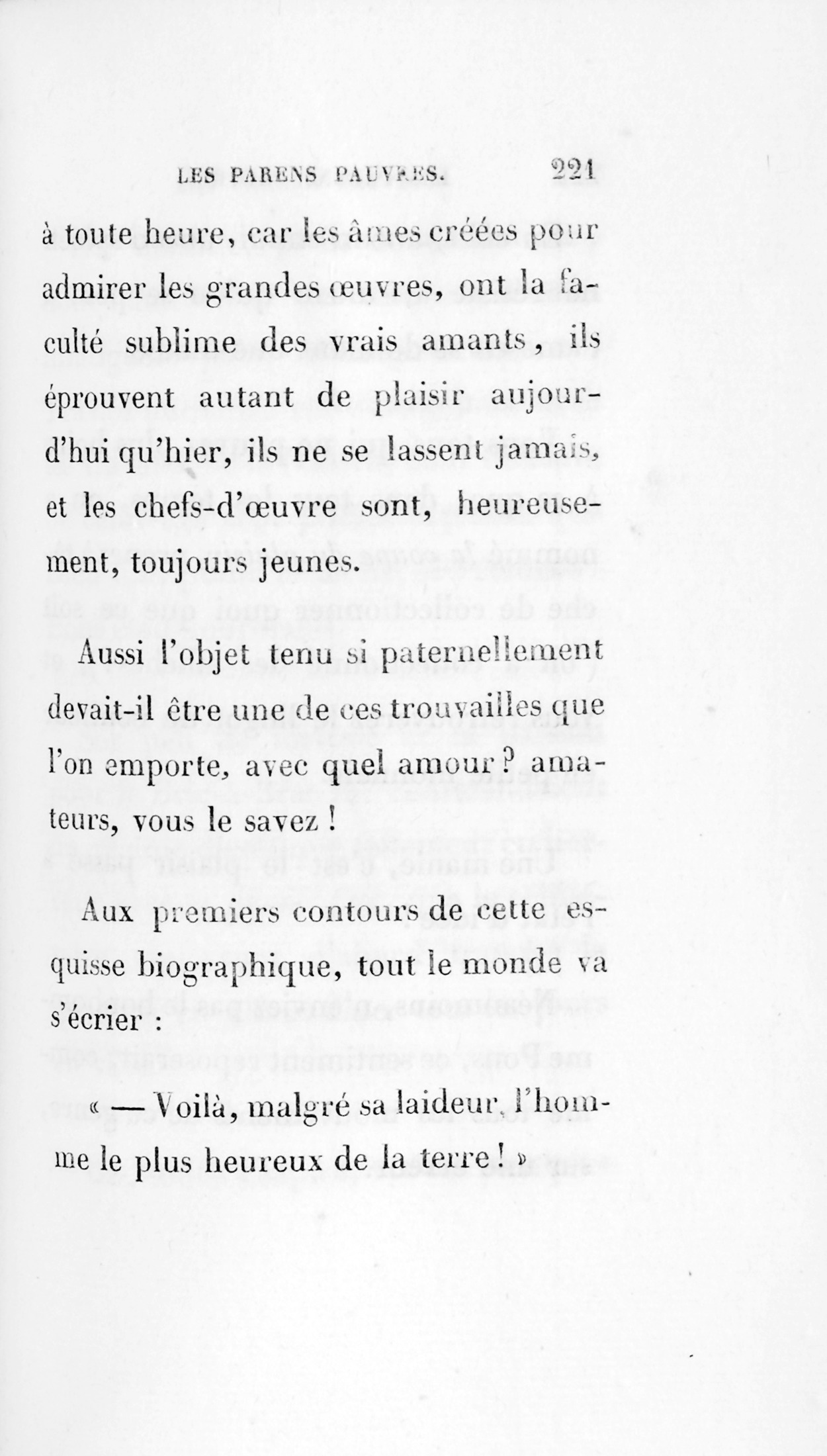 Cet artiste, doué d’une âme tendre, rêveuse, délicate, forcé d’accepter le caractère que lui imposait sa figure, désespéra d’être jamais aimé. Le célibat fut donc chez lui moins un goût qu’une nécessité.. La gourmandise, le péché des moines vertueux, lui tendit les bras ; il s’y précipita comme il s’était précipité dans l’adoration des œuvres d’art et dans son culte pour la musique. La bonne chère et le Bric-à-Brac furent pour lui la monnaie d’une femme ; car la musique était son état, et trouvez un homme qui aime l’état dont il vit ? À la longue, il en est d’une profession, comme du mariage, on n’en sent plus que les inconvéniens.