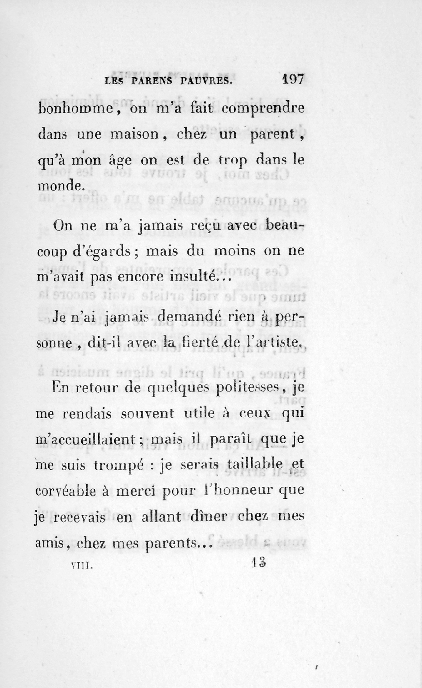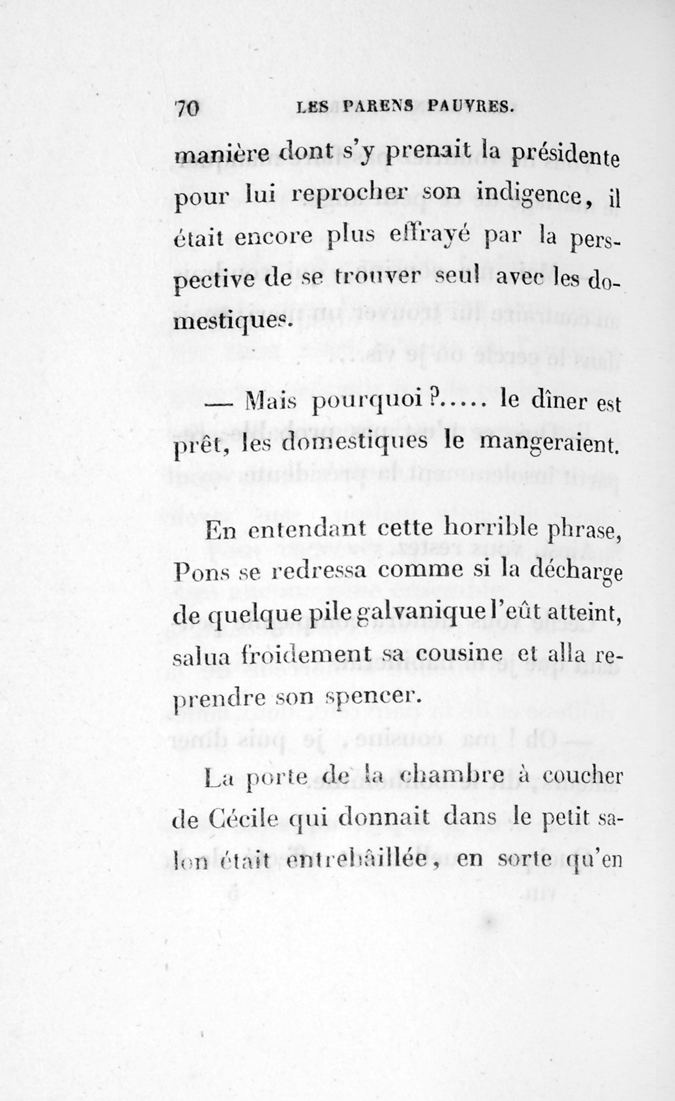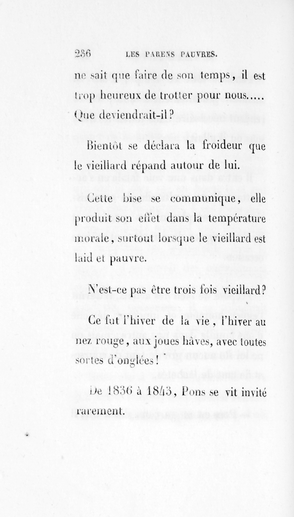 De 1836 à 1843, Pons se vit invité rarement. Loin de rechercher le parasite, chaque famille l’acceptait comme on accepte un impôt ; on ne lui tenait plus compte de rien, pas même de ses services réels.