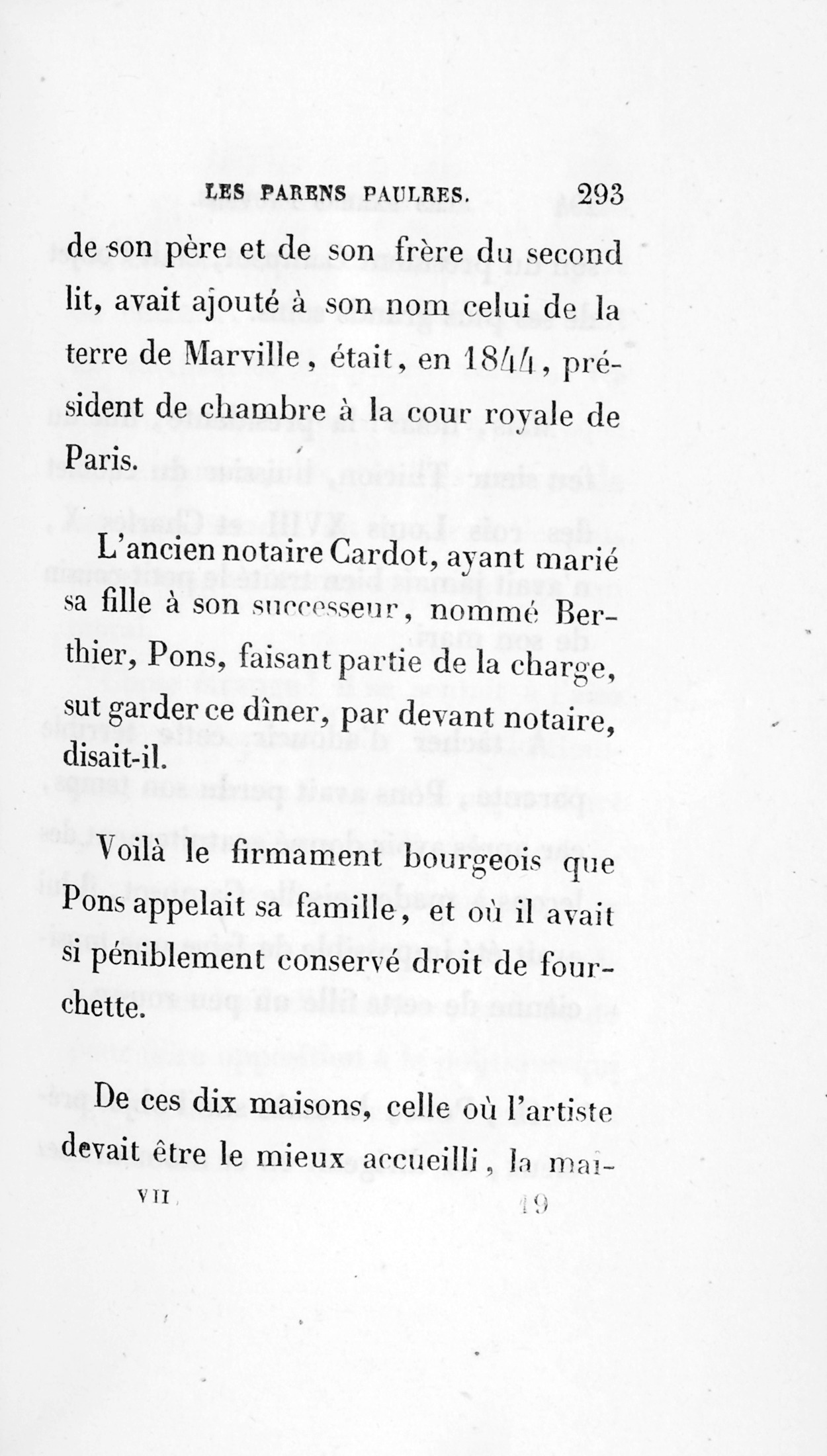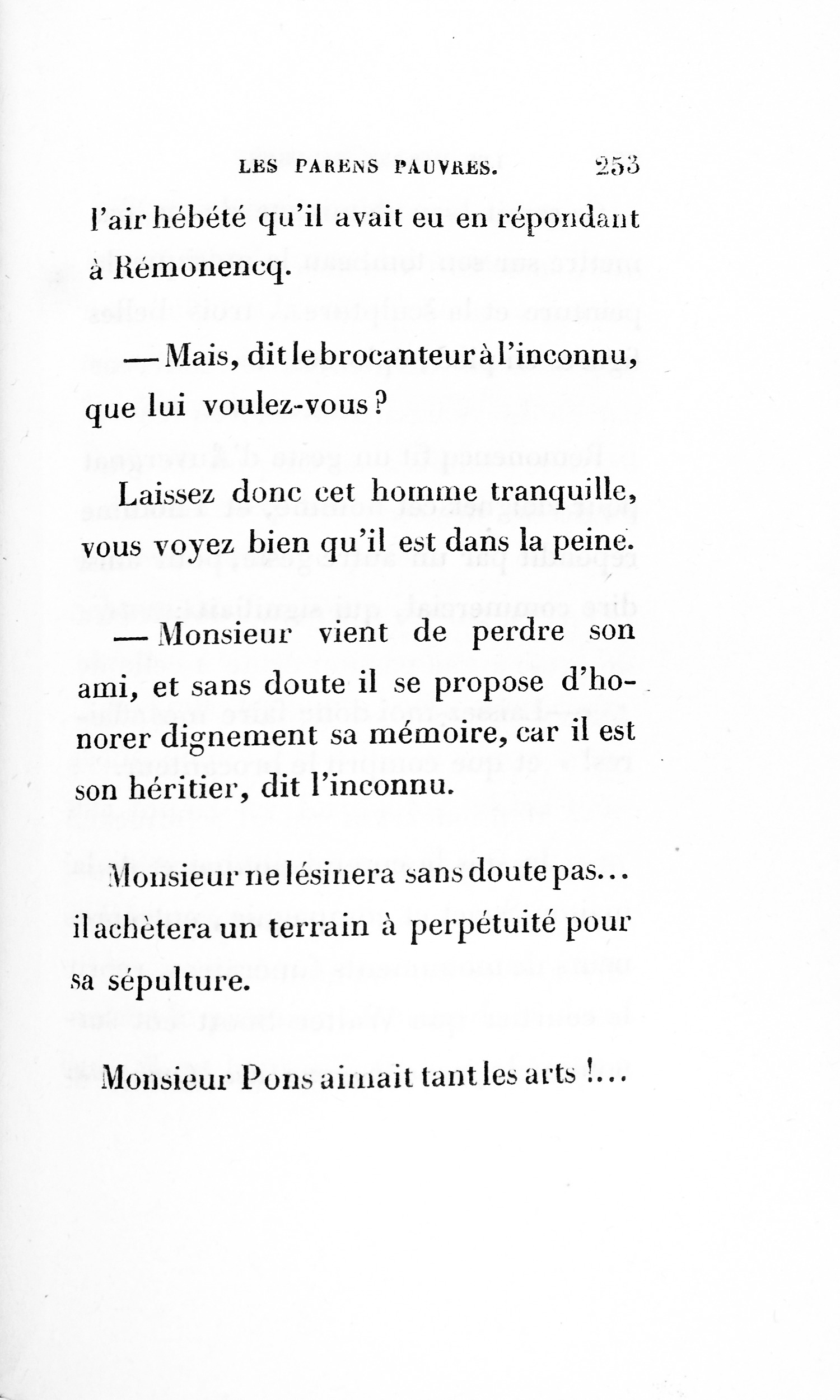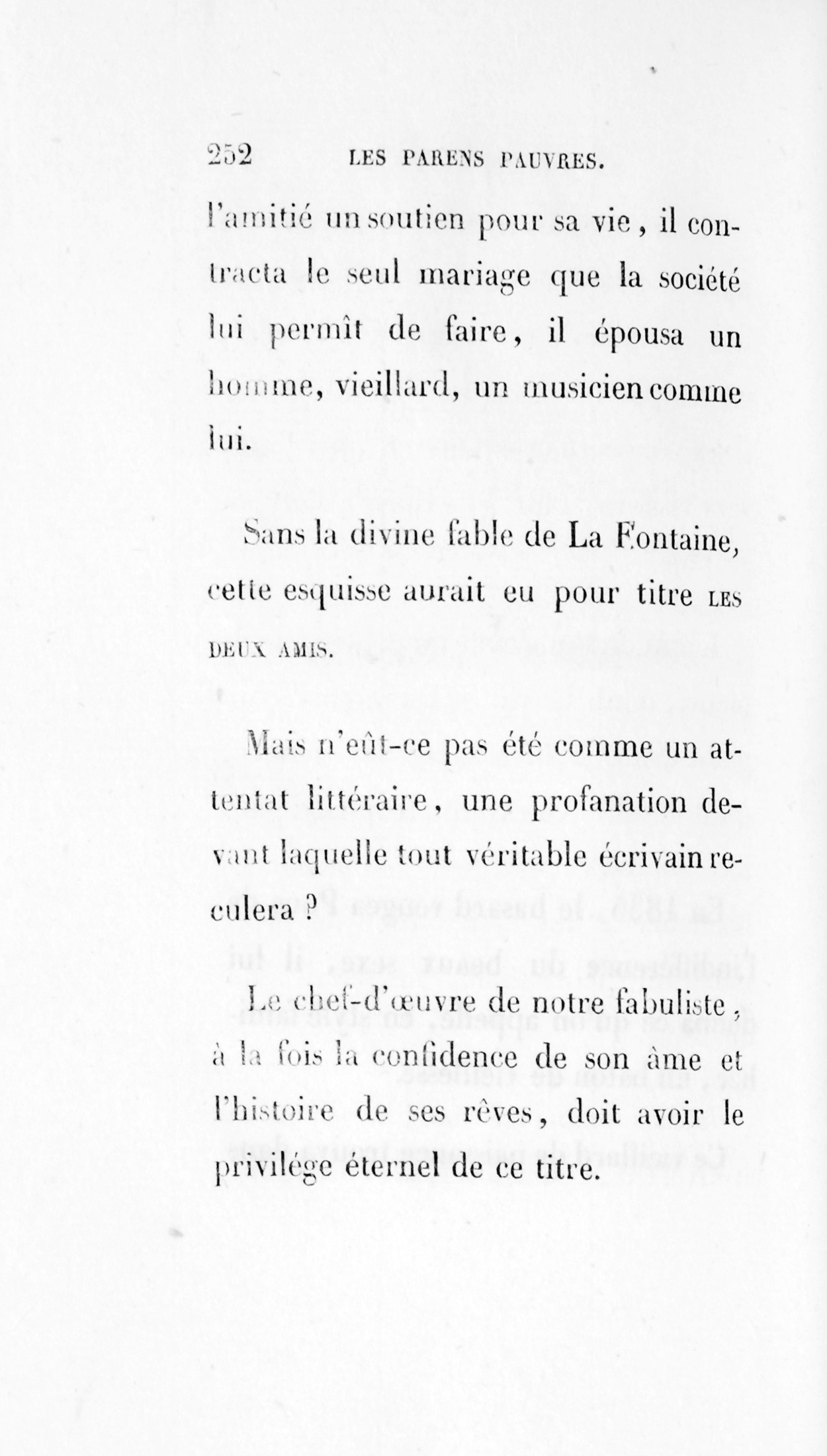 [p. 253]En 1835, le Hasard vengea Pons de l’indifférence du beau sexe, il lui donna ce qu’on appelle, en style familier, un bâton de vieillesse. Ce vieillard de naissance trouva dans l’amitié un soutien pour sa vie, il contracta le seul mariage que la Société lui permît de faire, il épousa un homme, vieillard, un musicien comme lui.