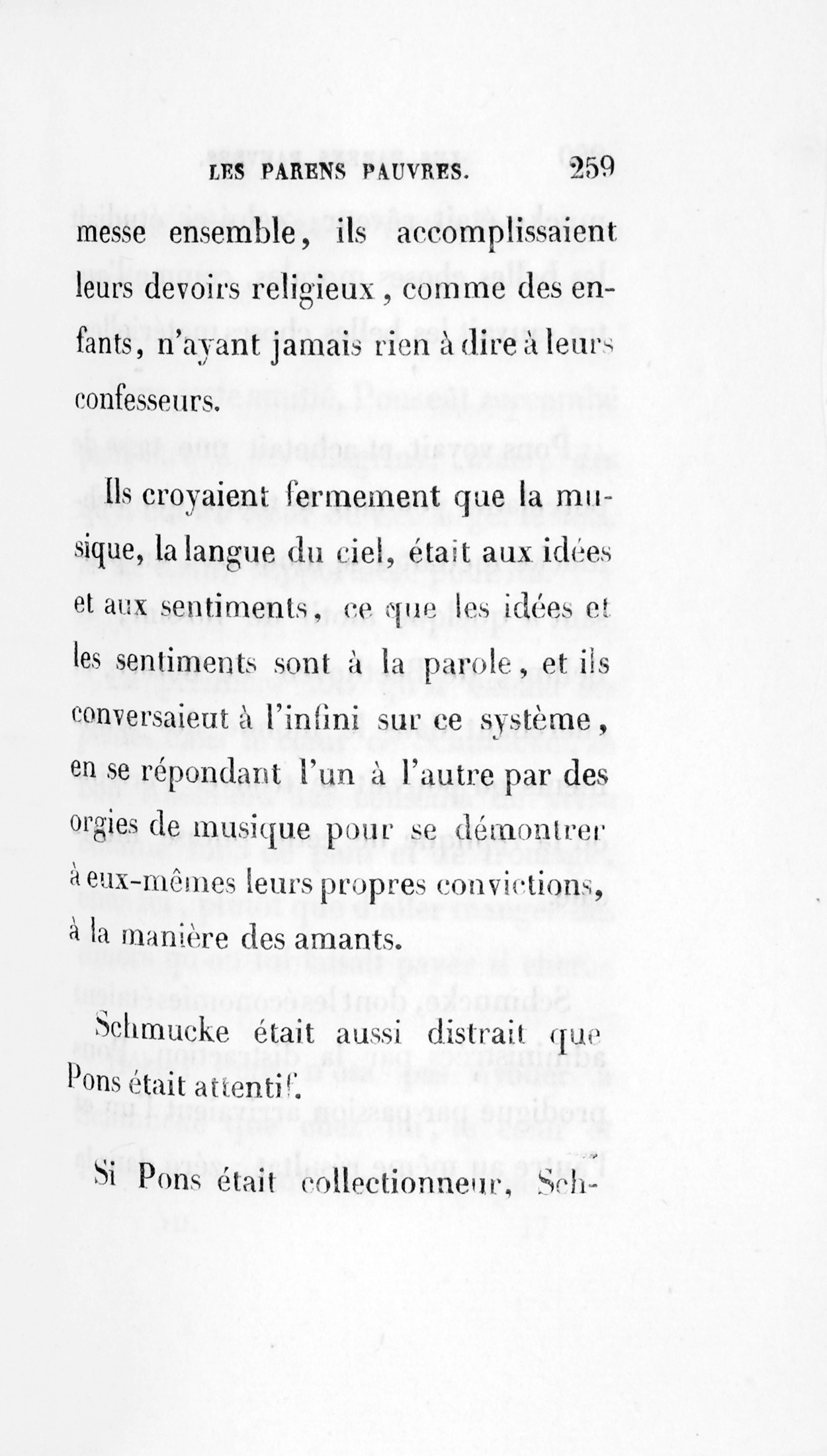 Jamais peut-être deux âmes ne se trouvèrent si pareilles dans l’océan humain qui prit sa source au Paradis terrestre contre la volonté de Dieu. Ces deux musiciens devinrent en peu de temps l’un pour l’autre une nécessité. Réciproquement confidents l’un de l’autre, ils furent en huit jours comme deux frères. Enfin Schmucke ne croyait pas plus qu’il pût exister un Pons, que Pons ne se doutait qu’il existât un Schmucke. Déjà, ceci suffirait à peindre ces deux braves gens ; mais toutes les intelligences ne goûtent pas les brièvetés de la synthèse. Une légère démonstration est nécessaire pour les incrédules.