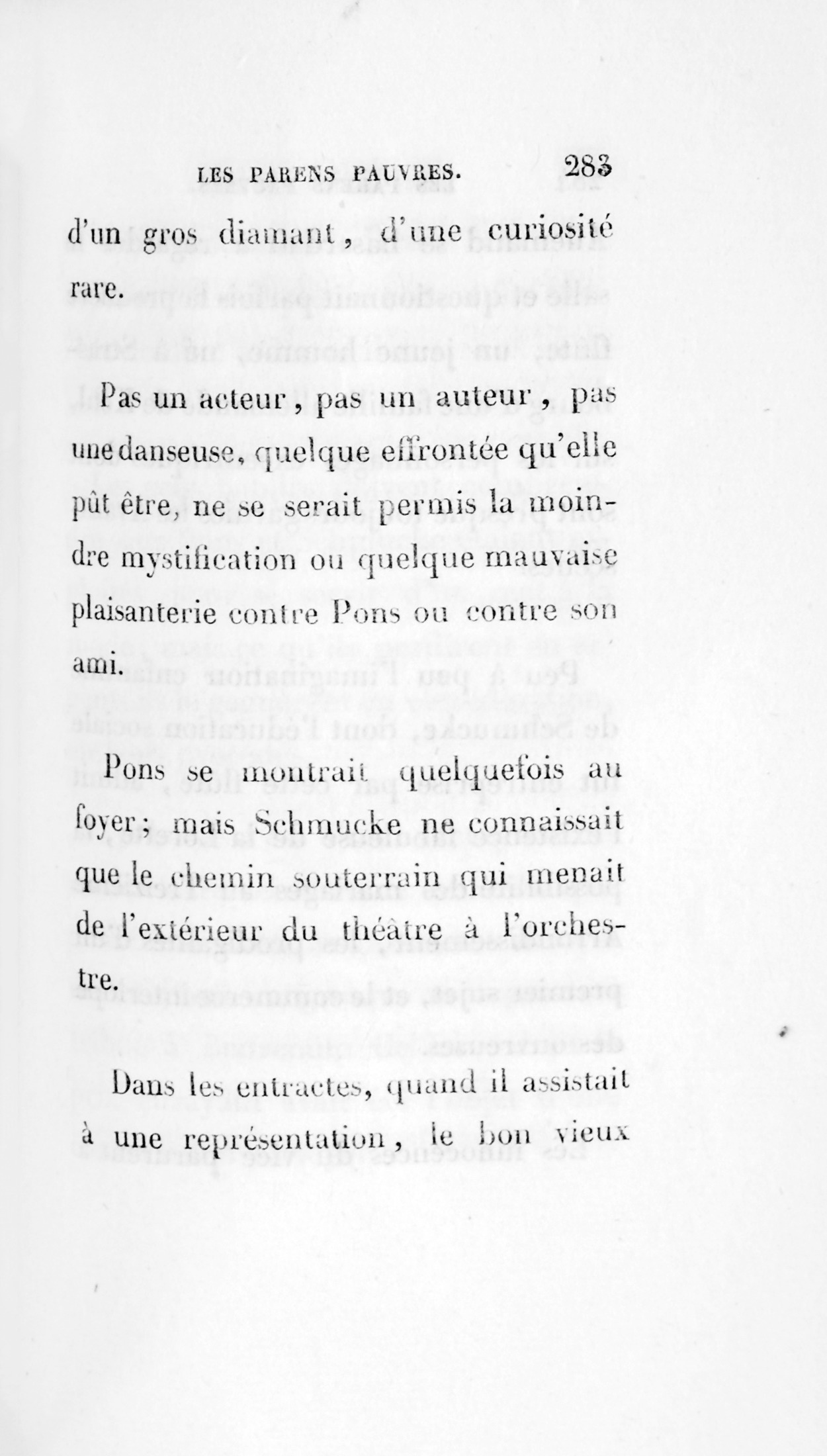 Un grand respect des autres et de lui-même avait valu l’estime générale au bon et modeste Pons. D’ailleurs, dans toute sphère, une vie limpide, une honnêteté sans tache commandent une sorte d’admiration aux cœurs les plus mauvais. À Paris, une belle vertu a le succès d’un gros diamant, d’une curiosité rare. Pas un acteur, pas un auteur, pas une danseuse, quelque effrontée qu’elle pût être, ne se serait permis la moindre mystification ou quelque mauvaise plaisanterie contre Pons ou contre son ami. Pons se montrait quelquefois au foyer ; mais Schmucke ne connaissait que le chemin souterrain qui menait de l’extérieur du théâtre à l’orchestre.