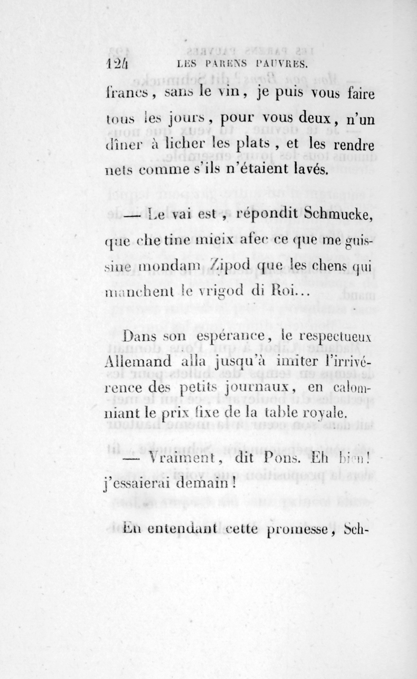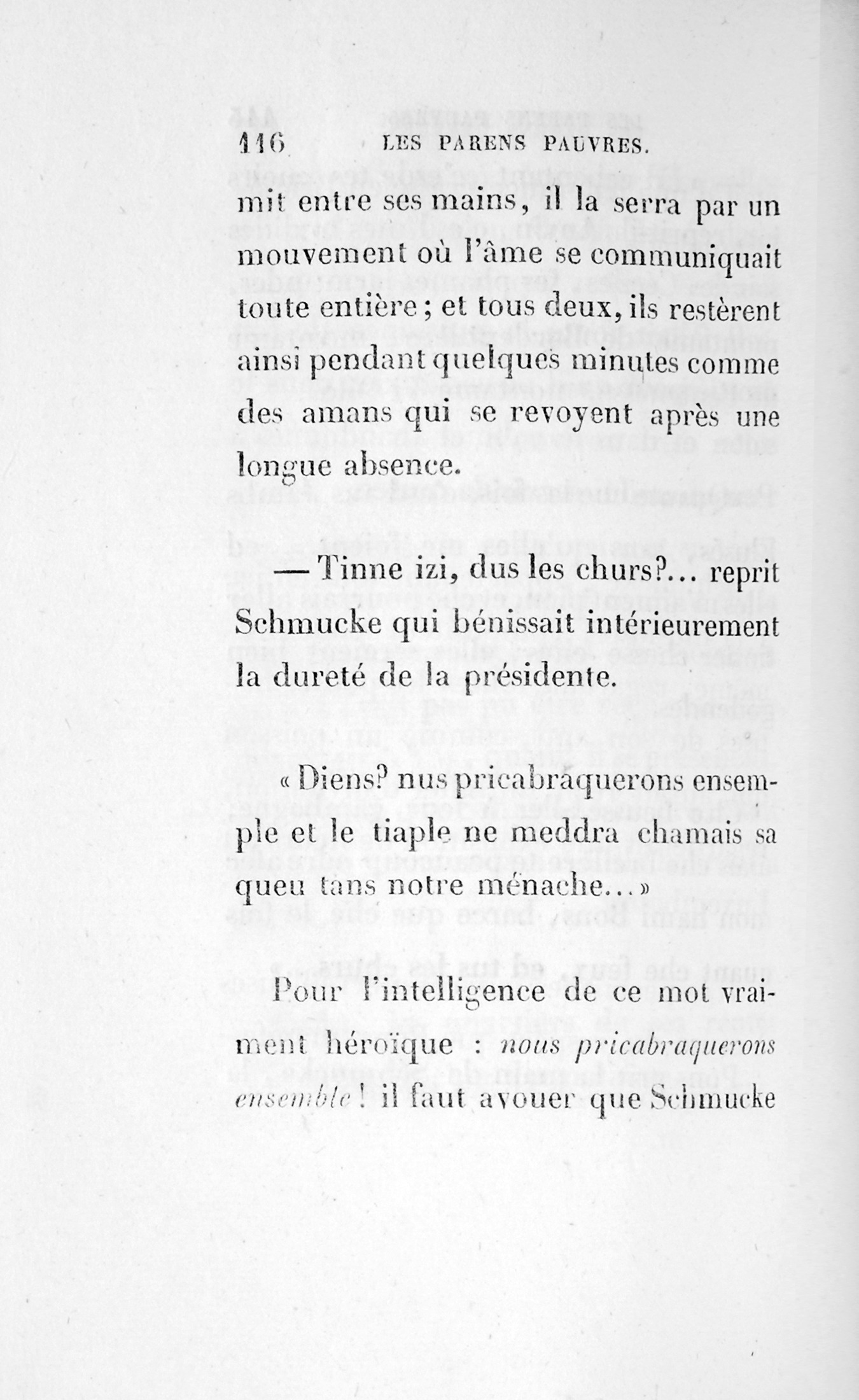 p. 158 Schmucke prit le papier, le lut, et en se voyant traité comme il l’était, ne comprenant rien aux gentillesses de la procédure, il reçut un coup mortel.