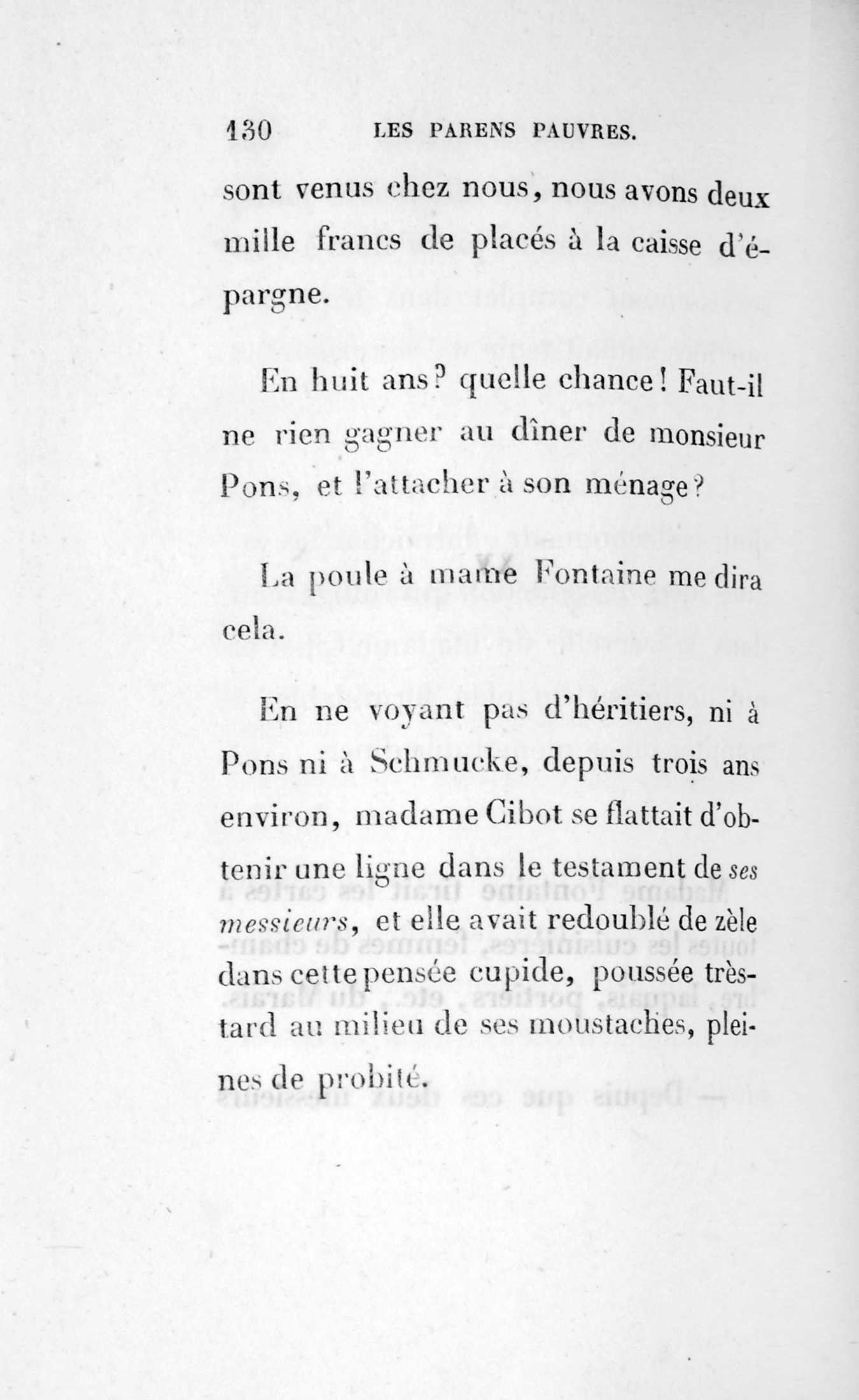 Ce passant était pourtant un grand prix, l’auteur de la première cantate couronnée à l’Institut, lors du rétablissement de l’Académie de Rome, enfin M. Sylvain Pons !… l’auteur de célèbres romances roucoulées par nos mères, de deux ou trois opéras joués en 1815 et 1816, puis de quelques partitions inédites. Ce digne homme finissait chef d’orchestre à un théâtre des boulevards. Il était, grâce à sa figure, professeur dans quelques pensionnats de demoiselles, et n’avait pas d’autres revenus que ses appointemens et ses cachets.