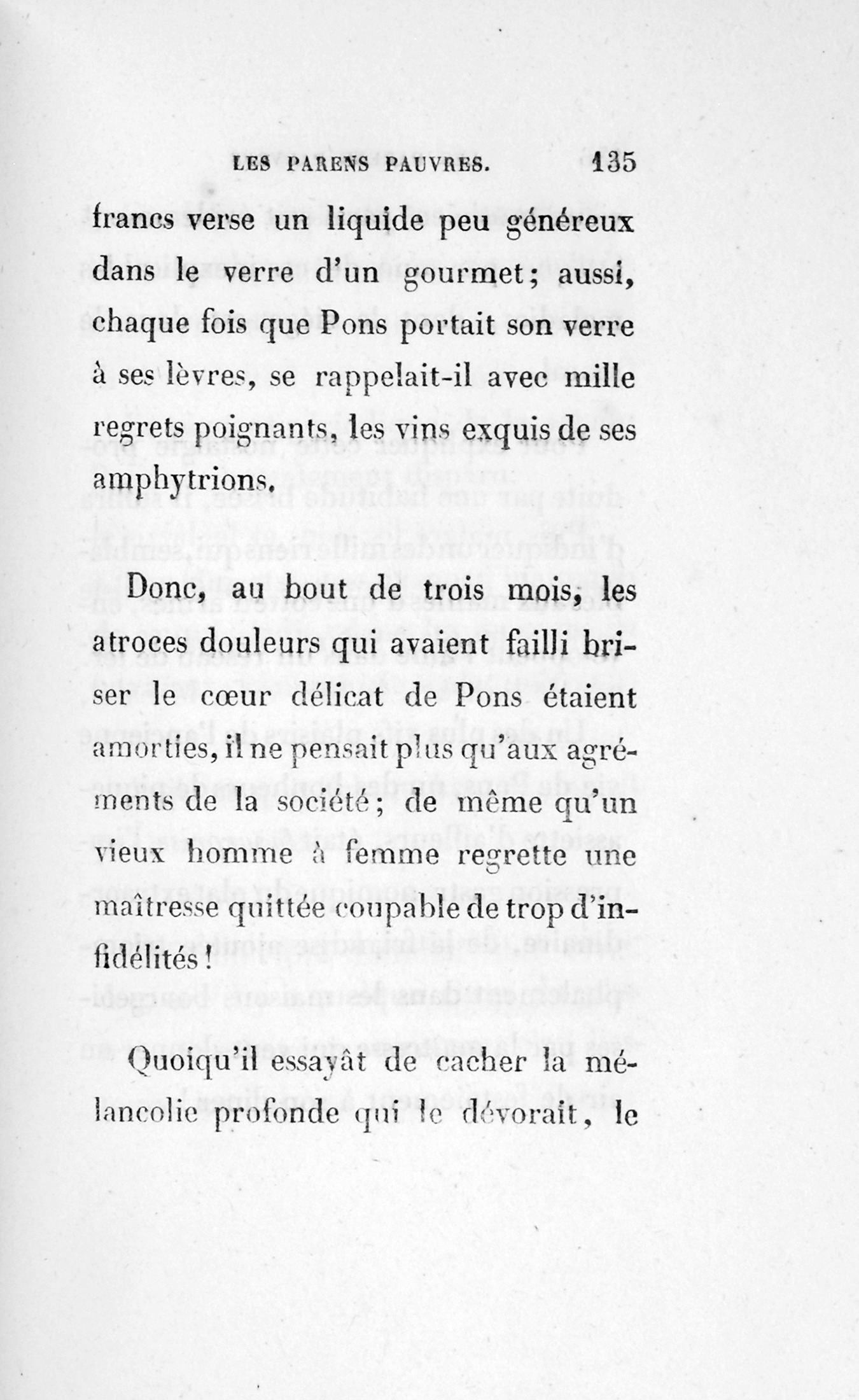 Les malades en convalescence d’une maladie grave, à qui l’on mesure si chichement une nourriture choisie, ont pu souvent observer l’espèce de griserie gastrique causée par une seule aile de poulet. Le sage Pons, dont toutes les jouissances étaient concentrées dans le jeu de son estomac, se trouvait toujours dans la situation de ces convalescens : il demandait à la bonne chère toutes les sensations qu’elle peut donner, et il les avait jusqu’alors obtenues tous les jours. Personne n’ose dire adieu à une habitude. Beaucoup de suicides se sont arrêtés sur le seuil de la Mort par le souvenir du café où ils vont jouer tous les soirs leur partie de dominos.