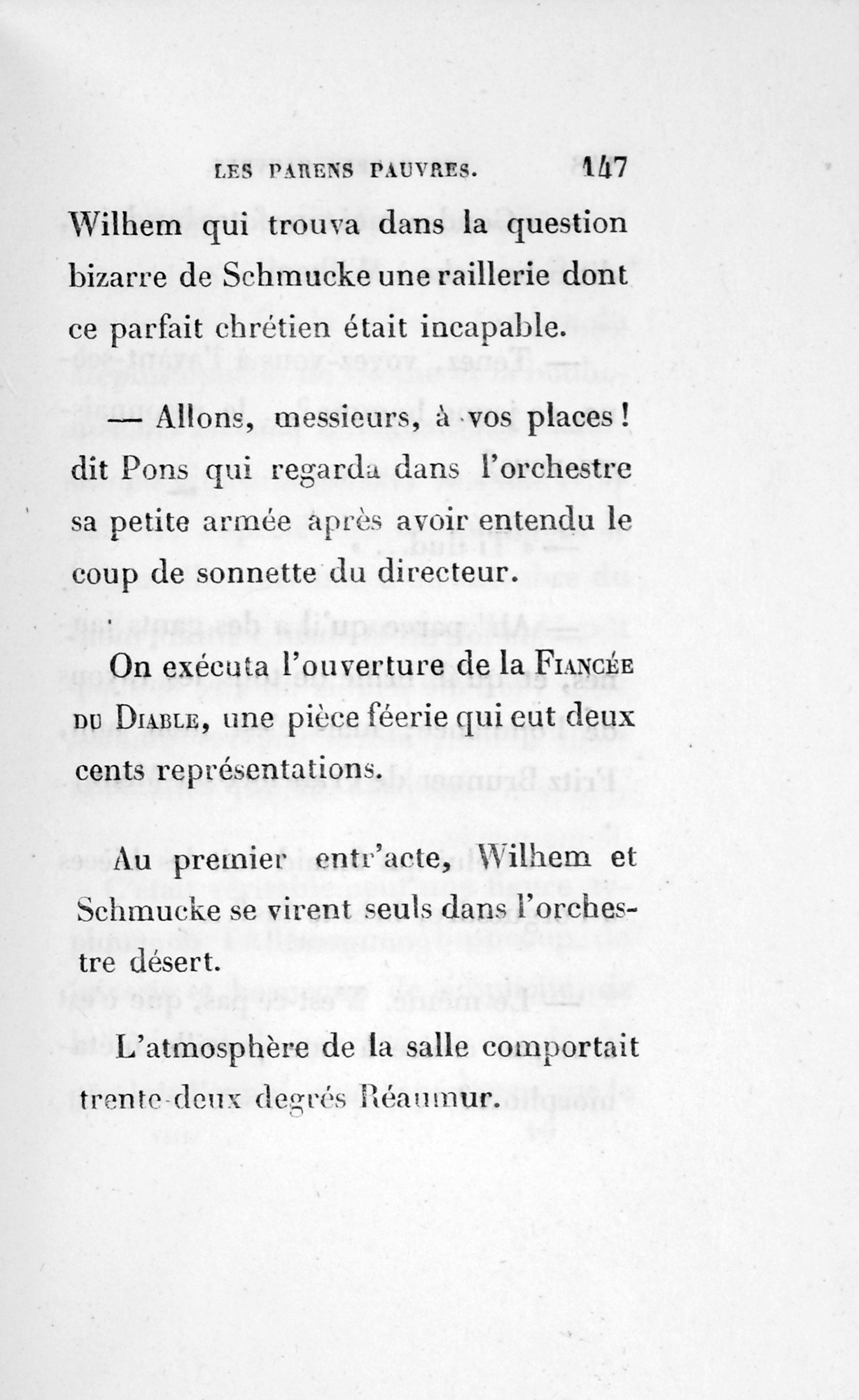 Ordinairement Pons se rendait à l’orchestre de son théâtre vers huit heures, heure à laquelle se donnent les pièces en faveur, et dont les ouvertures et les accompagnemens exigeaient la tyrannie du bâton. Cette tolérance existe dans la plupart des petits théâtres ; mais Pons était à cet égard d’autant plus à l’aise, qu’il mettait dans ses rapports avec l’administration un grand désintéressement. Schmucke suppléait d’ailleurs Pons au besoin.