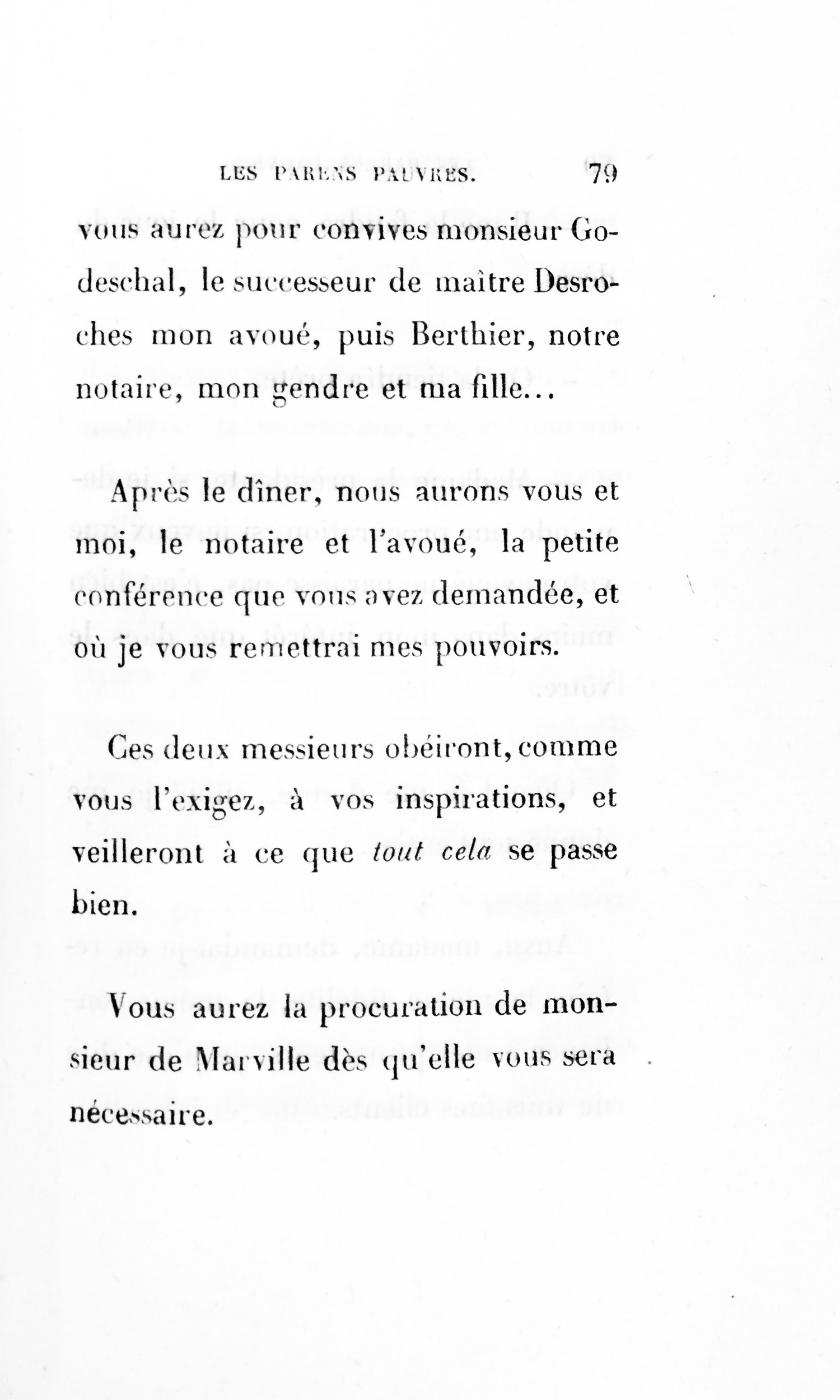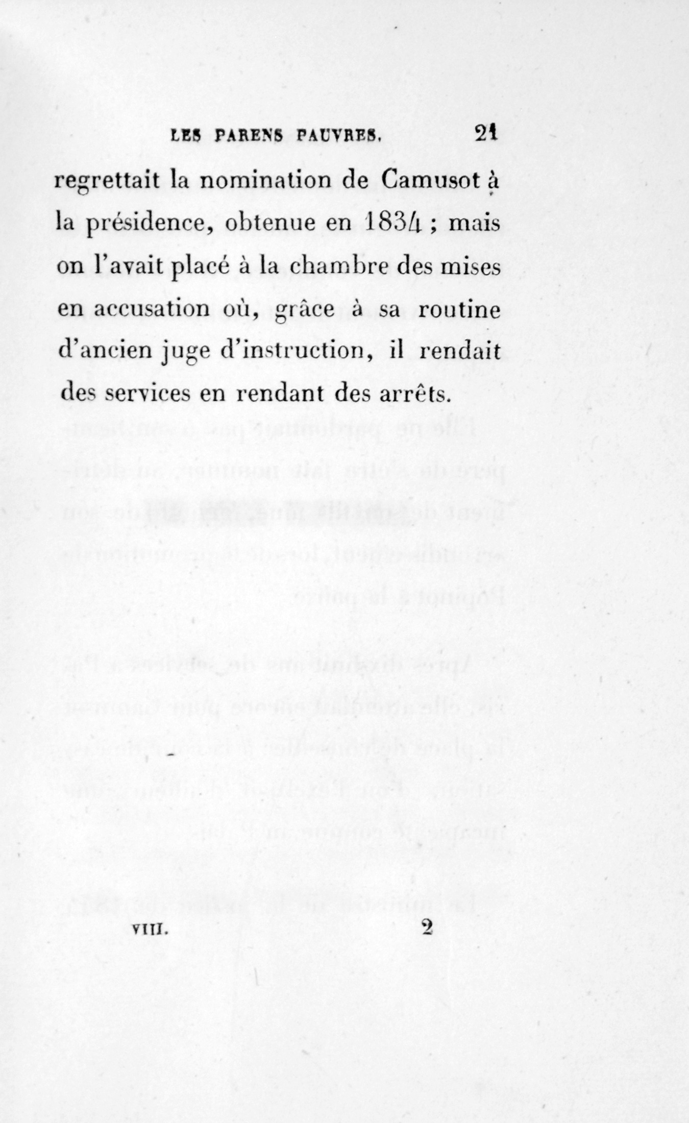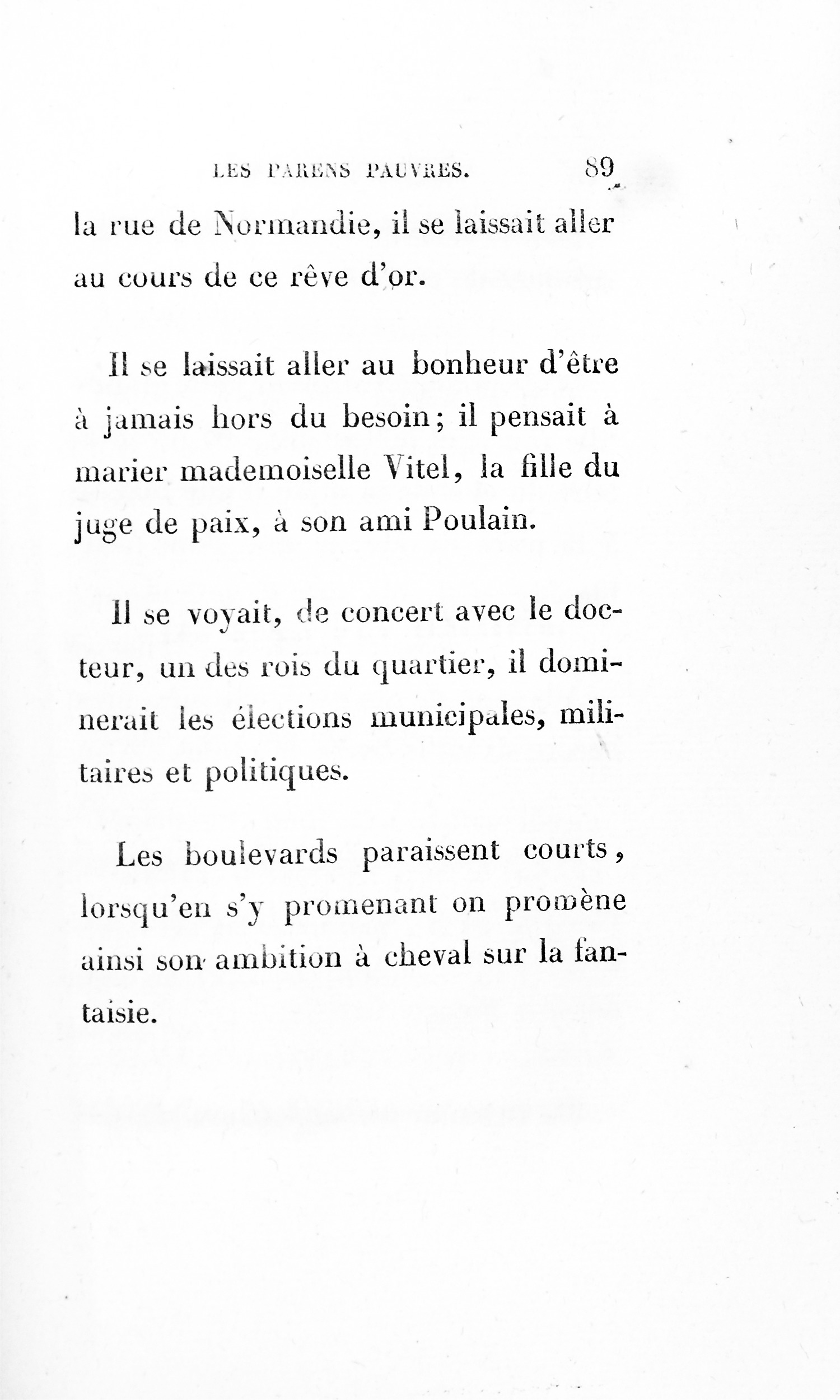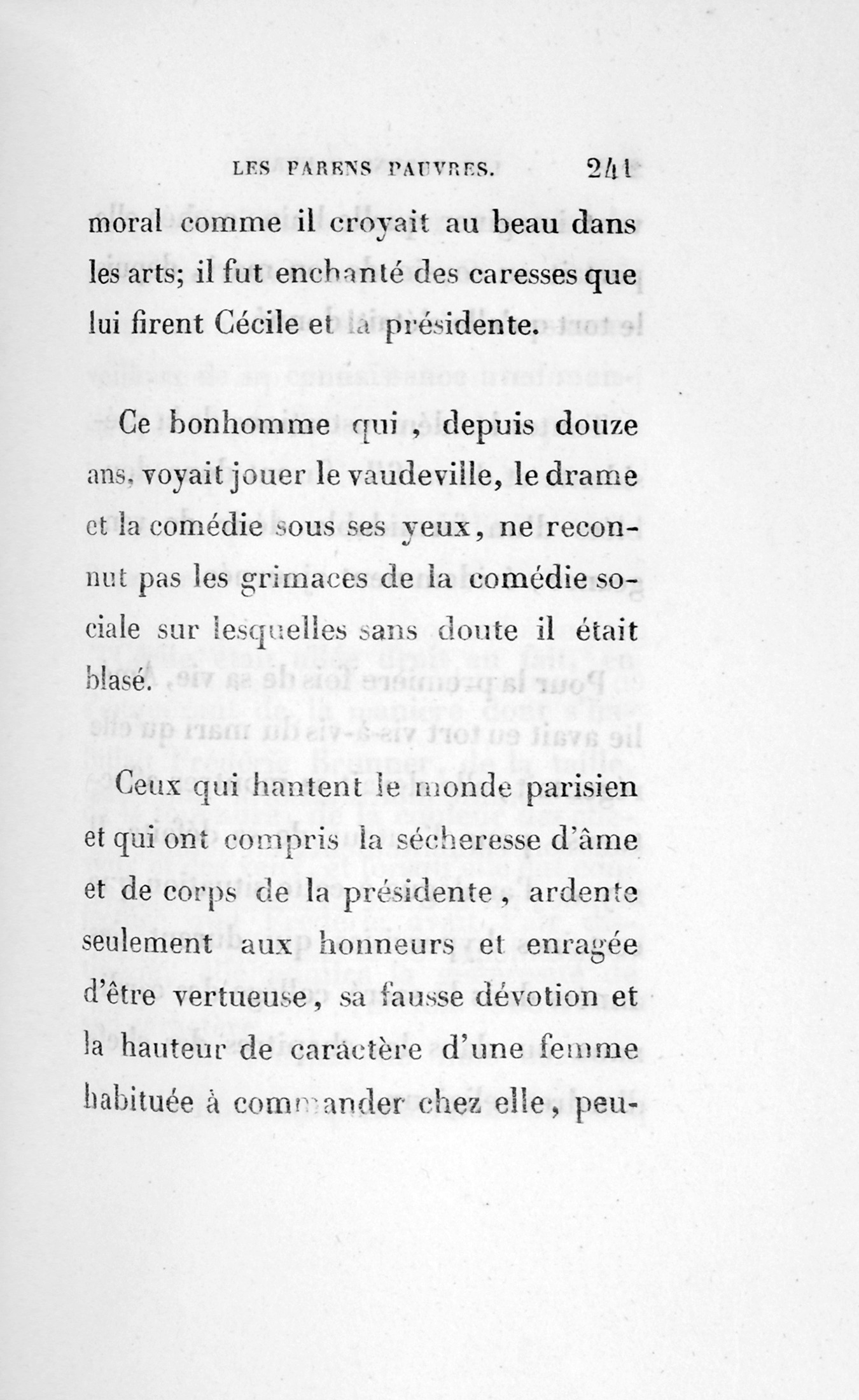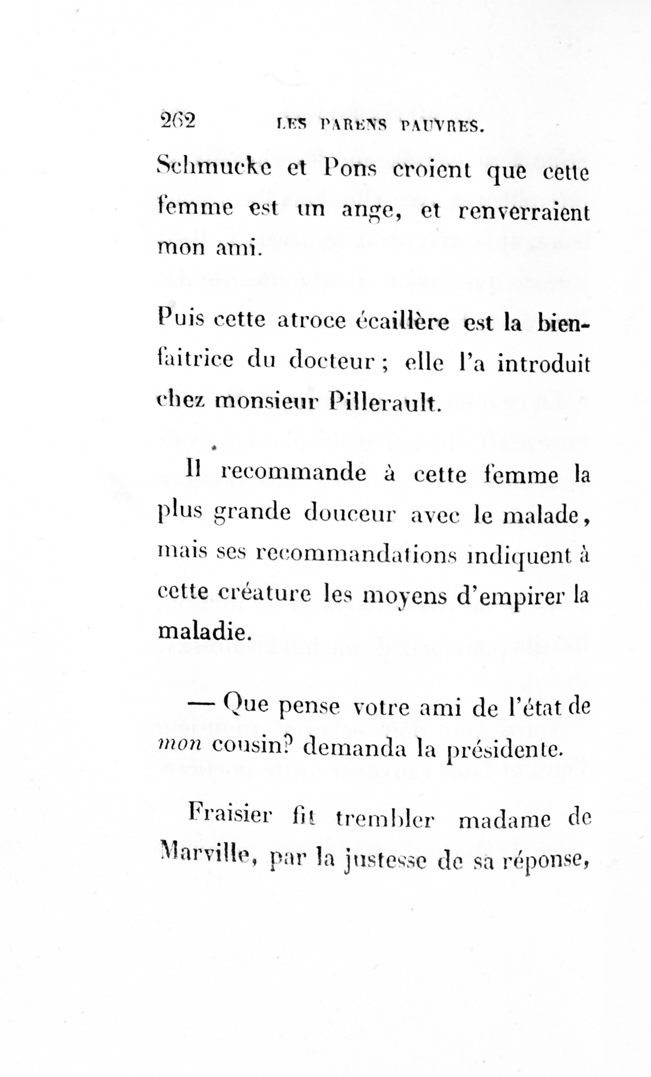 Le cousin Pons succomba donc sous une d’accusation d’égoïsme [p. 252] porté en arrière contre lui, car le monde finit toujours par condamner ceux qu’il accuse. Sait-on combien une défaveur imméritée accable les gens timides ? Qui peindra jamais les malheurs de la Timidité !
