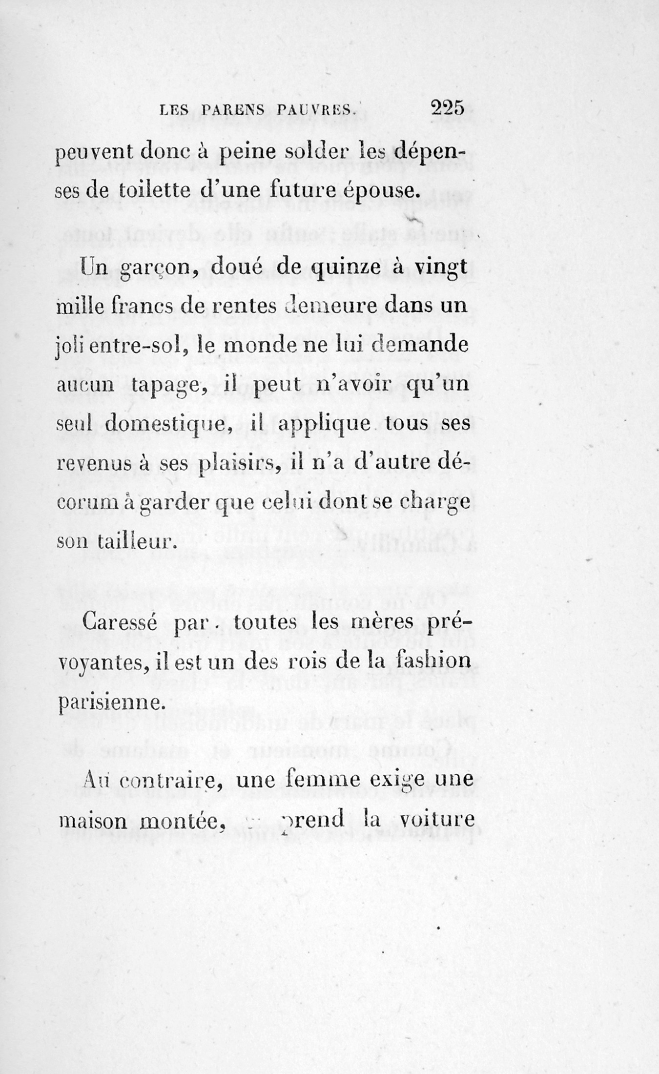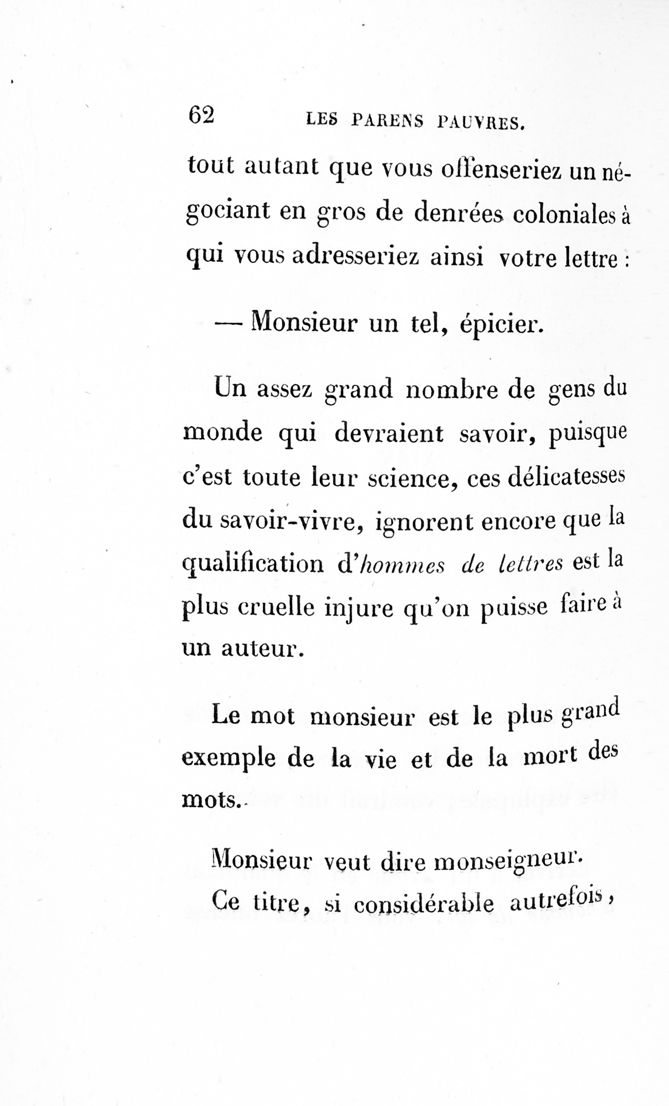 On reconnaissait d’ailleurs à la première vue un homme bien élevé en proie à quelque vice secret, ou l’un de ces petits rentiers dont toutes les dépenses sont si nettement déterminées par la médiocrité du revenu, qu’une vitre cassée, un habit déchiré, ou la peste philanthropique d’une quête, suppriment leurs menus plaisirs pendant un mois.