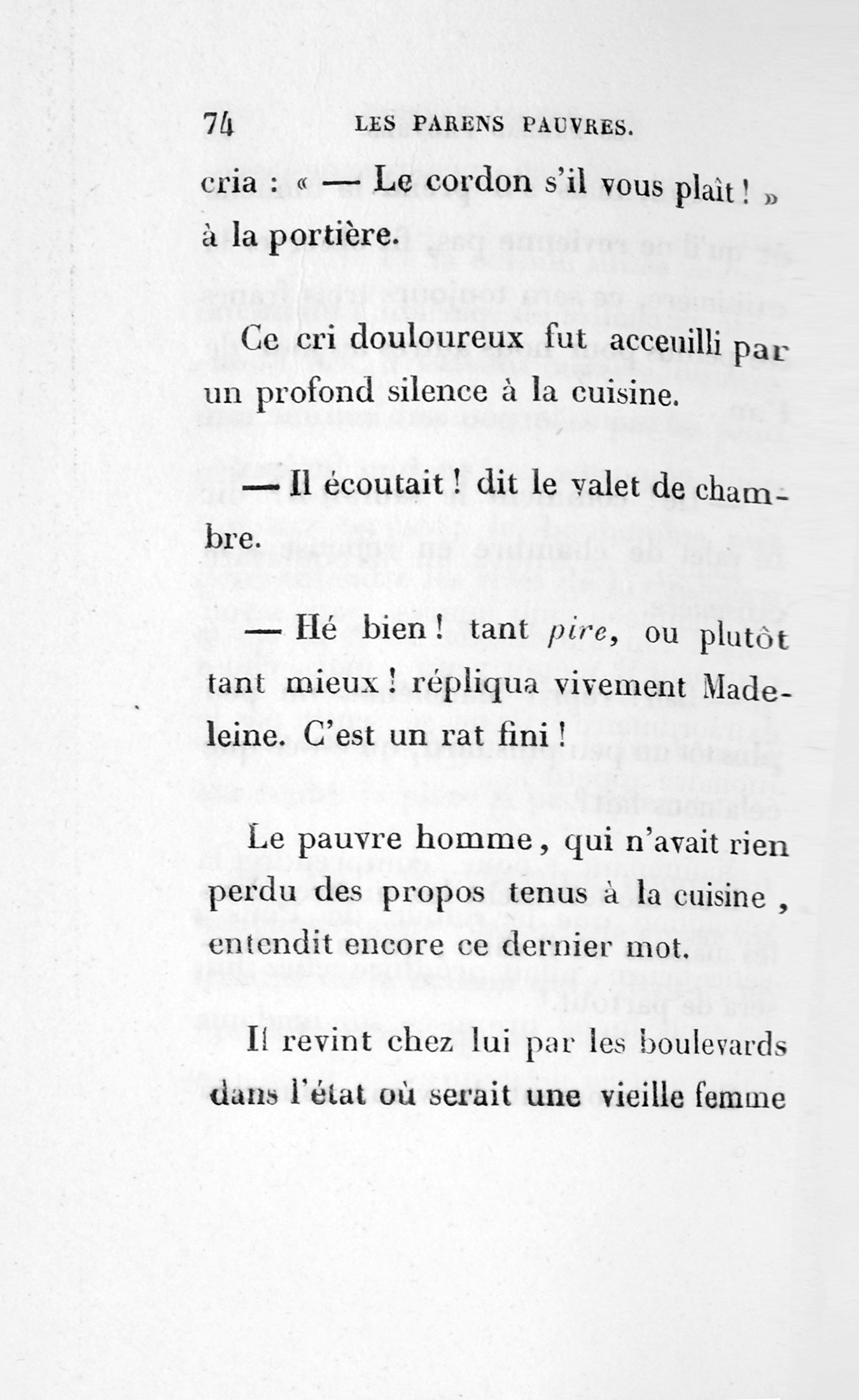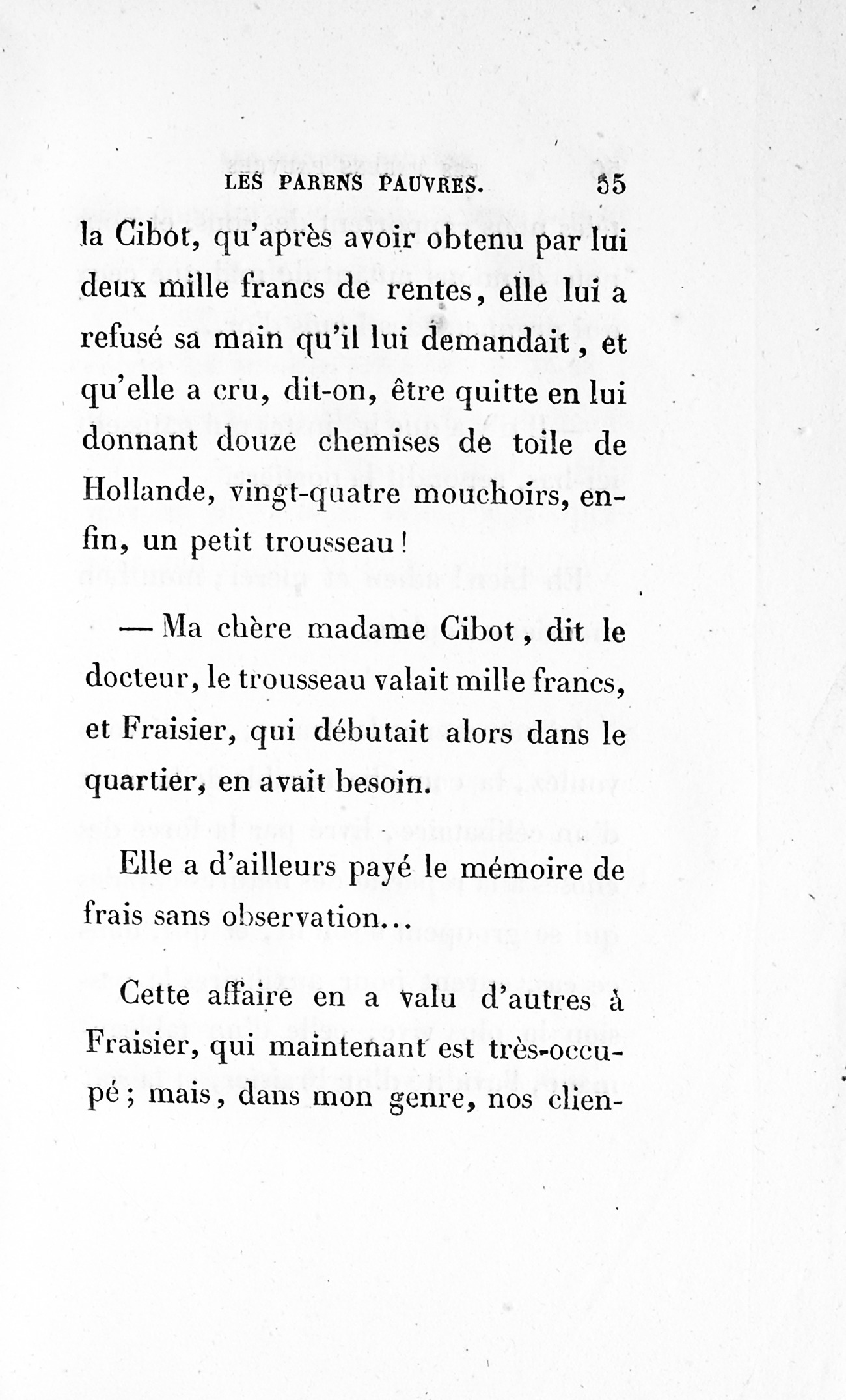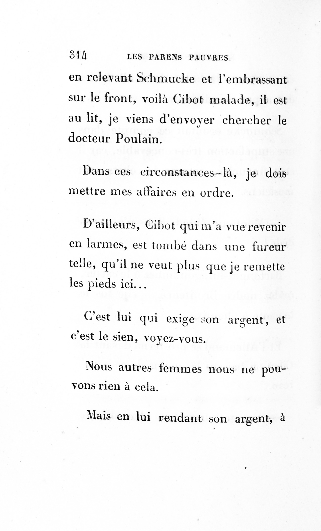 – Eh bien ! madame, je vous ai déjà débarrassée234Erreur du Pétion : « débarrassé » au lieu de « débarrassée ». des soixante mille francs que je calculais devoir être donnés à cette ignoble portière, cette madame Cibot.