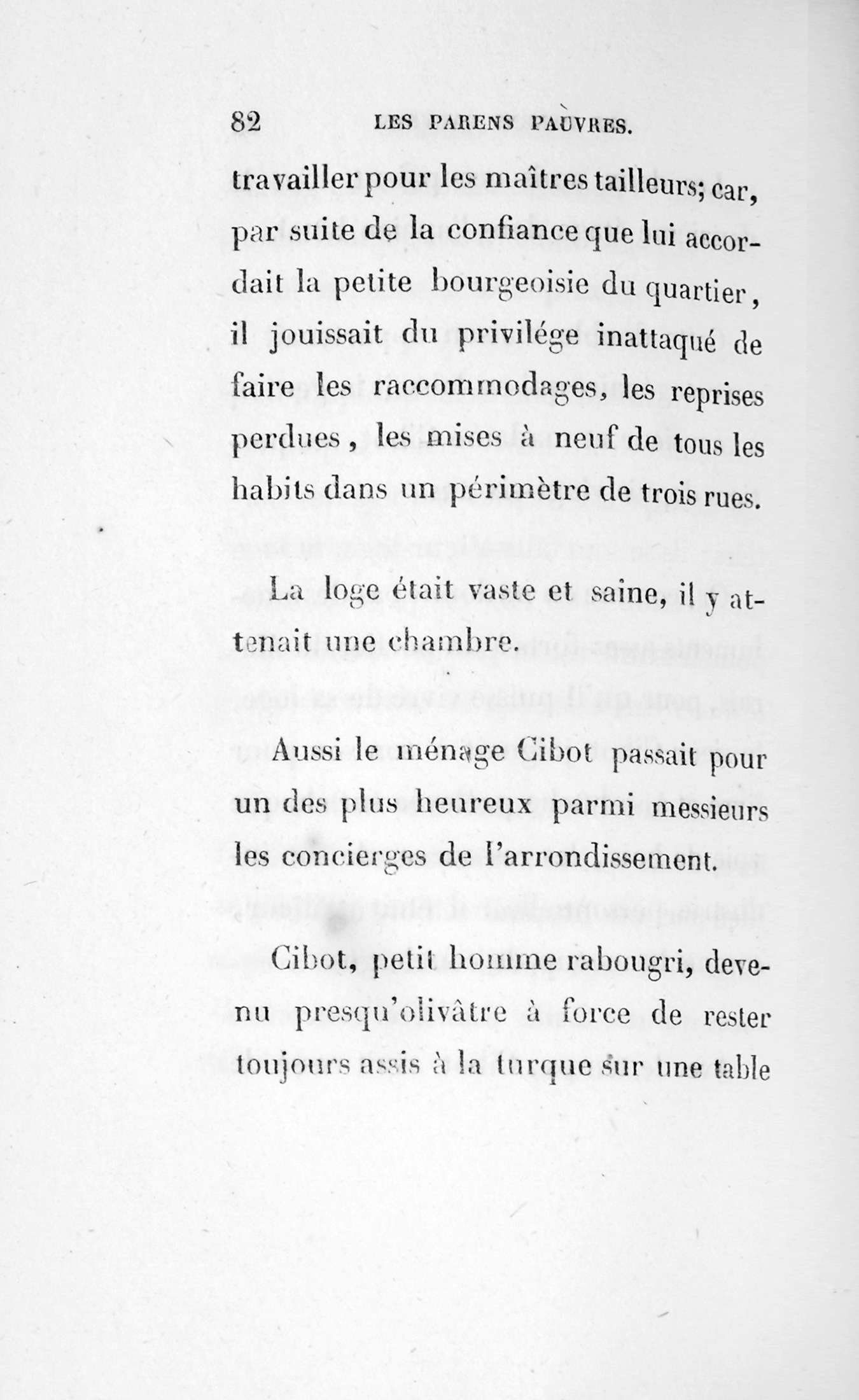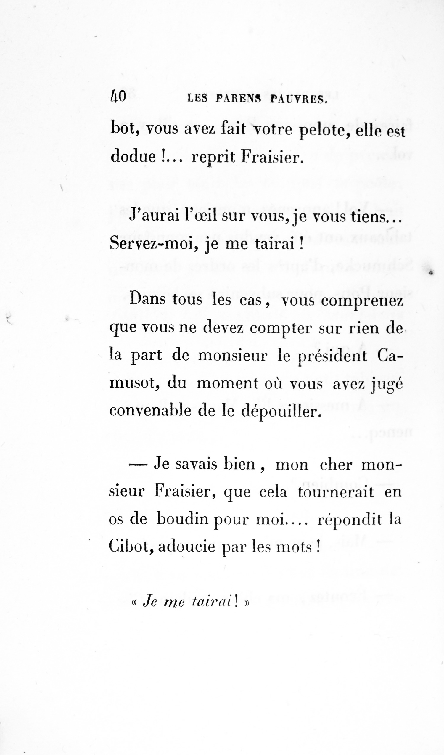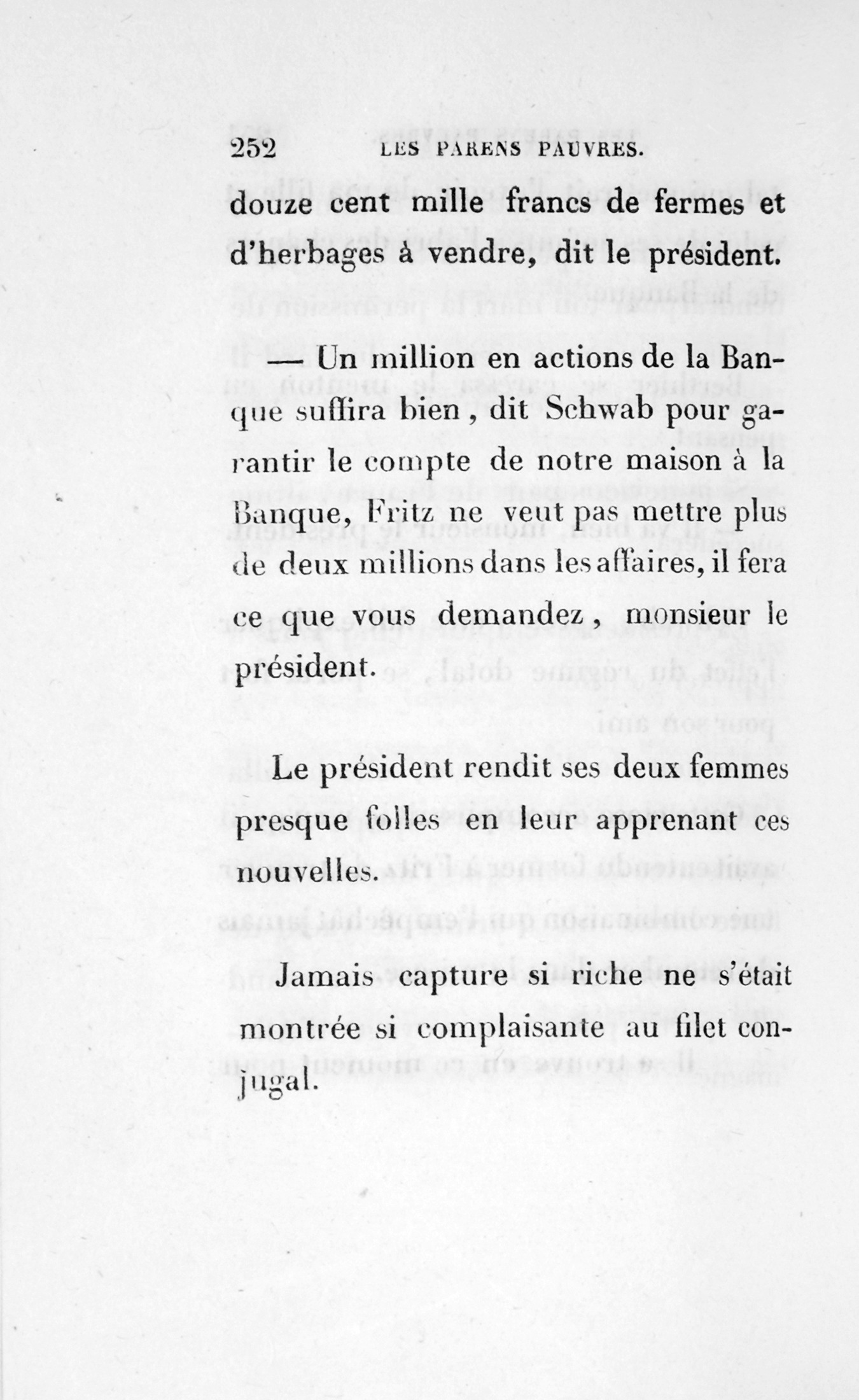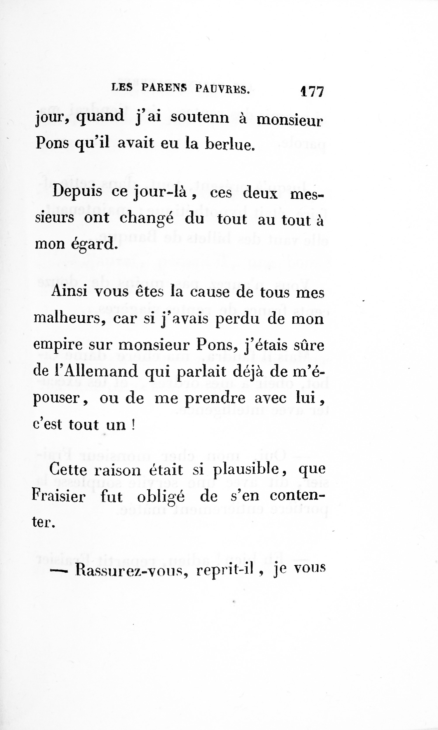 – Eh bien ! madame, je vous ai déjà débarrassée234Erreur du Pétion : « débarrassé » au lieu de « débarrassée ». des soixante mille francs que je calculais devoir être donnés à cette ignoble portière, cette madame Cibot.