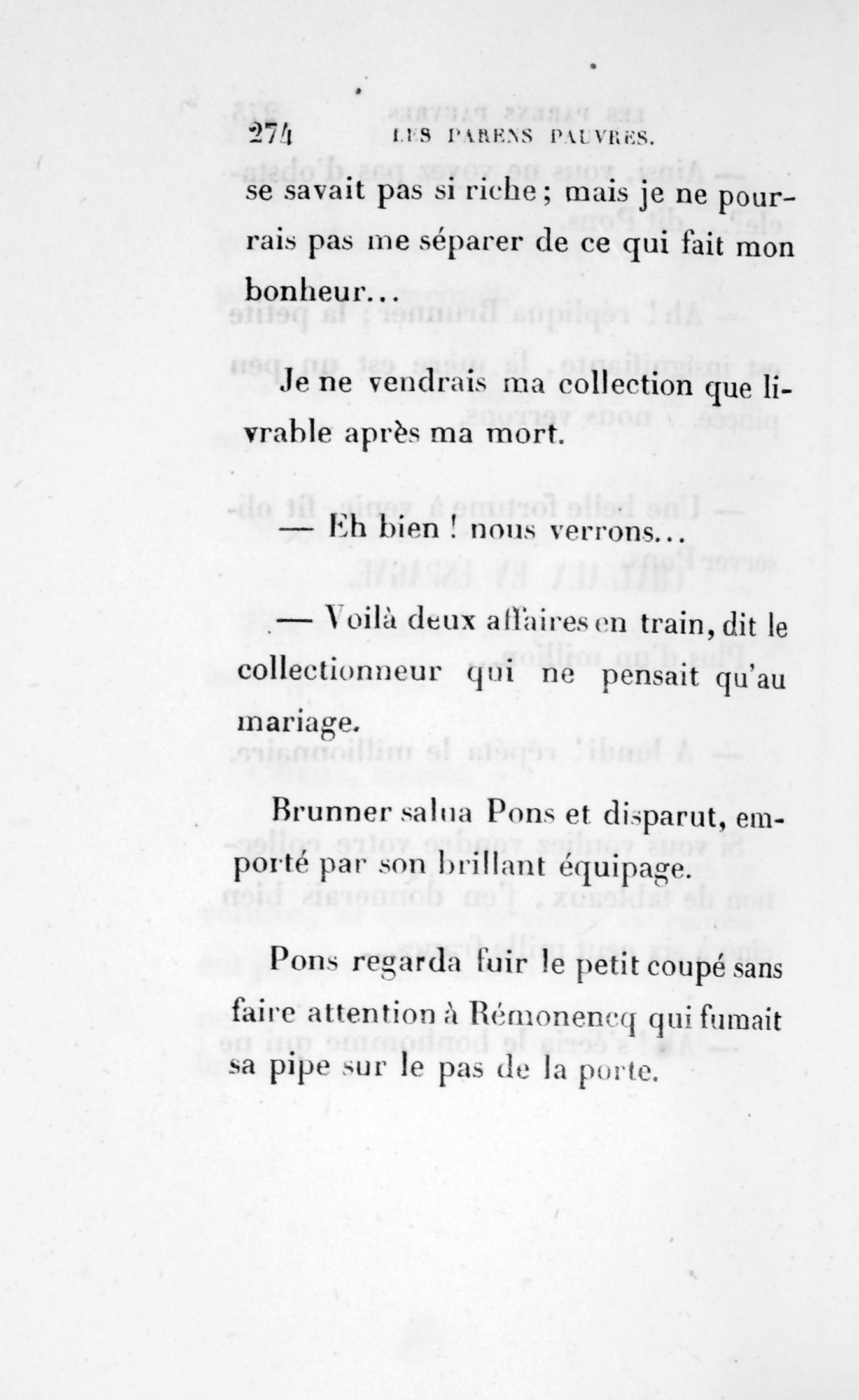 Le fait de l’insuccès du bonhomme peut sembler exorbitant, mais il avouait naïvement sa faiblesse relativement à l’harmonie : il avait négligé l’étude du Contrepoint ; et l’orchestration moderne, grandie outre mesure, lui parut inabordable au moment où, par de nouvelles études, il aurait pu se maintenir parmi les compositeurs modernes, devenir, non pas Rossini, mais Hérold. Enfin, il trouva dans les plaisirs du collectionneur de si vives compensations à la faillite de la gloire, que s’il lui eût fallu choisir entre la possession de ses curiosités et le nom de Rossini, le croirait-on ? Pons aurait opté pour son cher cabinet.