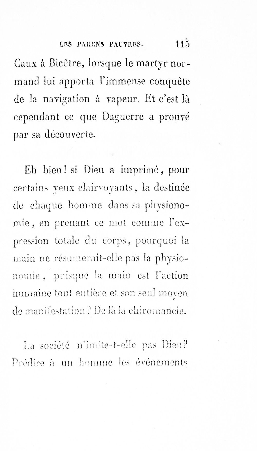 Ce qui reste à dire sur le moral de ces deux êtres en est précisément le plus difficile à faire comprendre aux quatre-vingt-dix-neuf centièmes des lecteurs, dans la quarante-septième année du dix-neuvième siècle, probablement à cause du prodigieux développement financier produit par l’établissement des chemins de fer. C’est peu de chose et c’est beaucoup. En effet, il s’agit de donner une idée de la délicatesse excessive de ces deux cœurs.