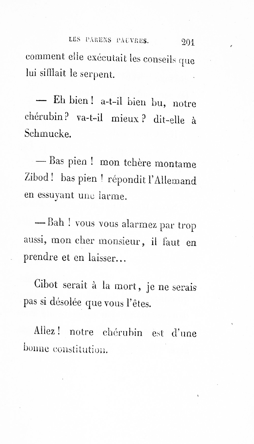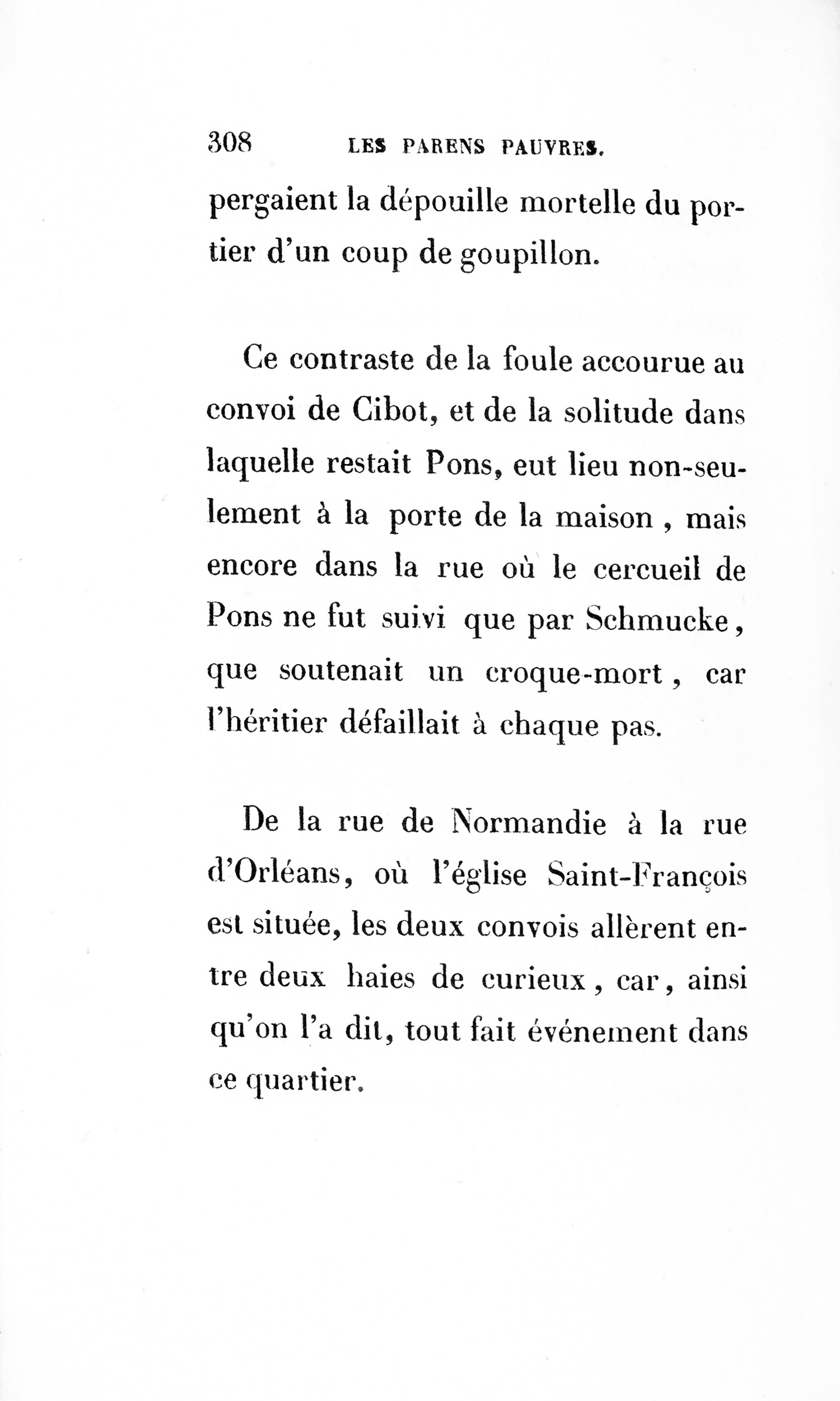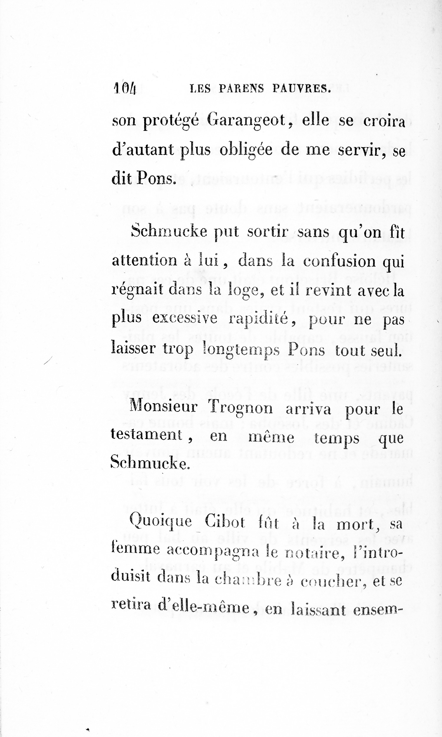 Il fut soigné par madame Topinard, et fut obscurément enterré côte à côte avec Pons, par les soins de Topinard, la seule personne qui suivit 235 Erreur du Pétion : « suivît » au lieu de « suivit ». le convoi de ce fils de l’Allemagne.