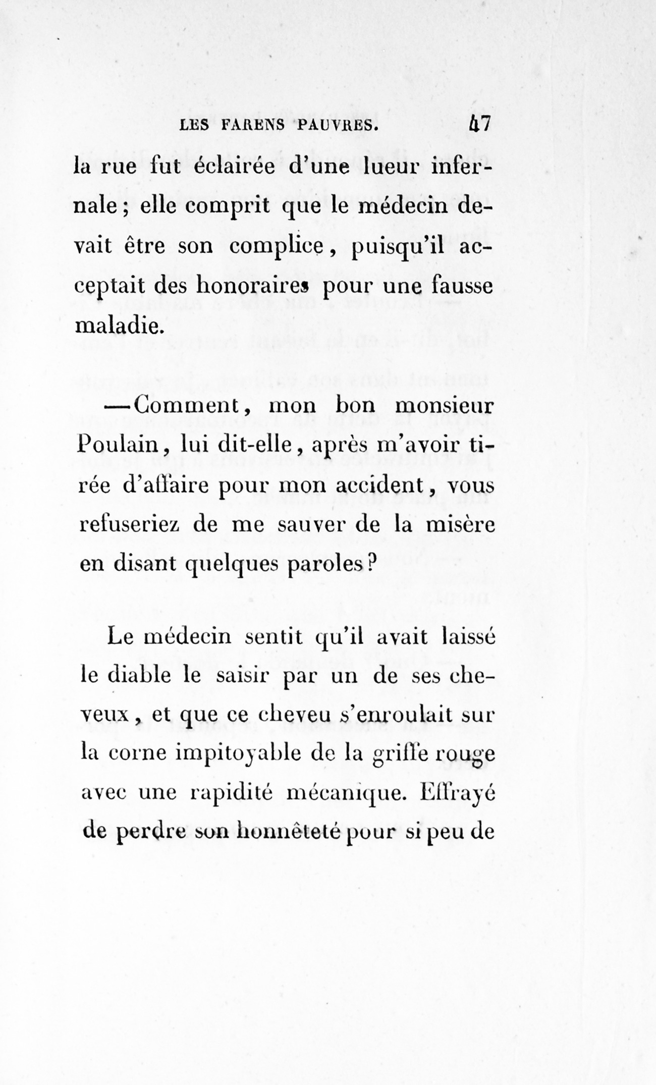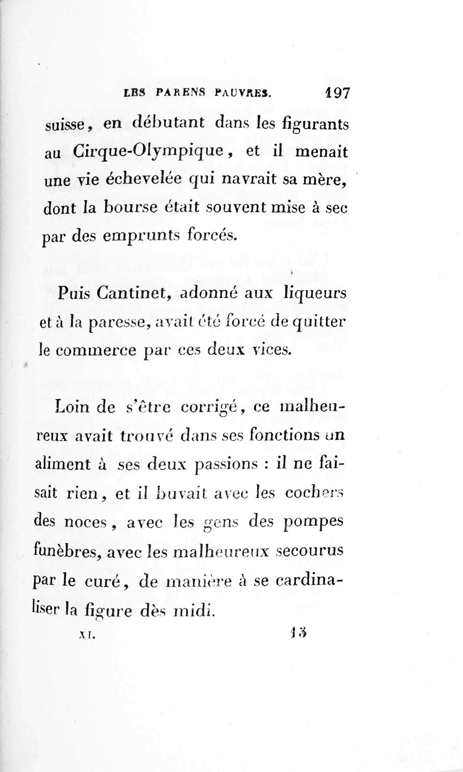 p. 169 Madame Rémonencq, frappée de la prédiction de madame Fontaine, ne veut pas se retirer à la campagne, elle reste dans son magnifique magasin du boulevard de la Madeleine, encore une fois veuve, car l’Auvergnat, après s’être fait donner par contrat de mariage les biens au dernier vivant, avait mis à portée de sa femme un petit verre de vitriol, comptant sur une erreur, et sa femme, dans une intention excellente, ayant mis ailleurs le petit verre, Rémonencq l’avala.