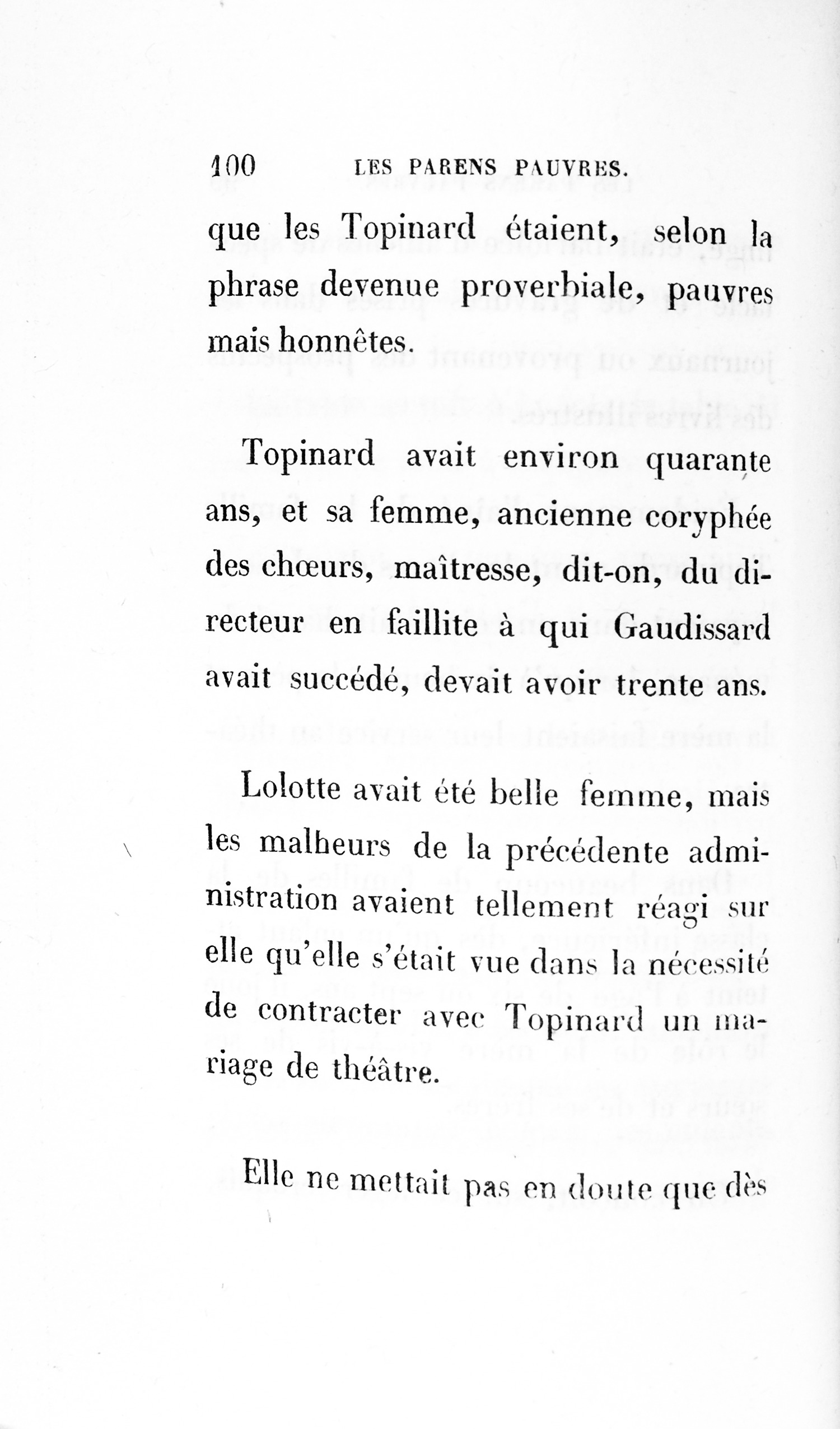 Mais monsieur Topinard est devenu sombre, misanthrope, et parle peu ; il passe pour avoir commis un crime, et les mauvais plaisants du théâtre prétendent que son chagrin vient d’avoir épousé Lolotte.