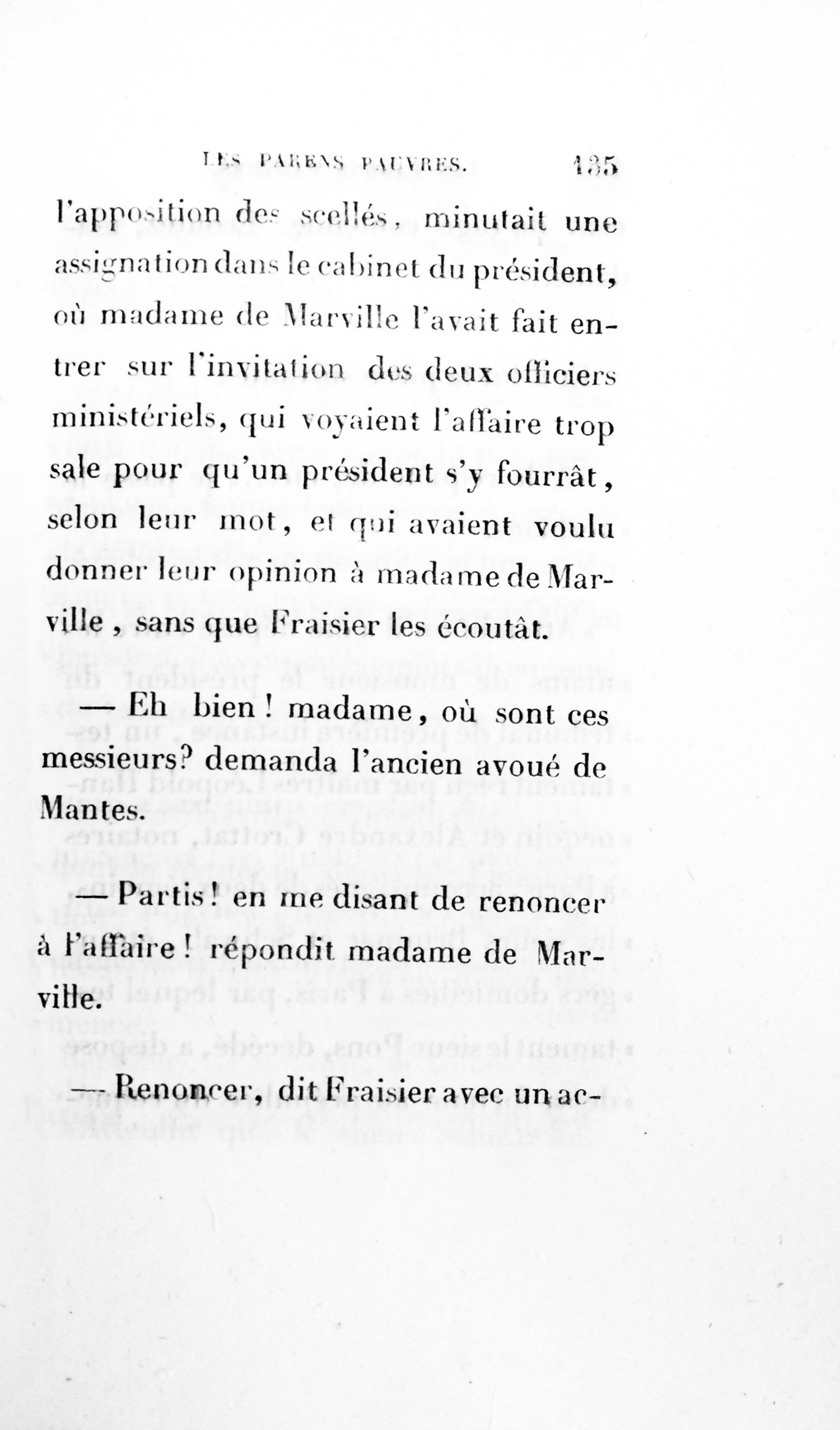 En ce moment Fraisier, revenu de p. 135 l’apposition des scellés, minutait une assignation dans le cabinet du président, où madame de Marville l’avait fait entrer sur l’invitation des deux officiers ministériels, qui voyaient l’affaire trop sale pour qu’un président s’y fourrât, selon leur mot, et qui avaient voulu donner leur opinion à madame de Marville, sans que Fraisier les écoutât.