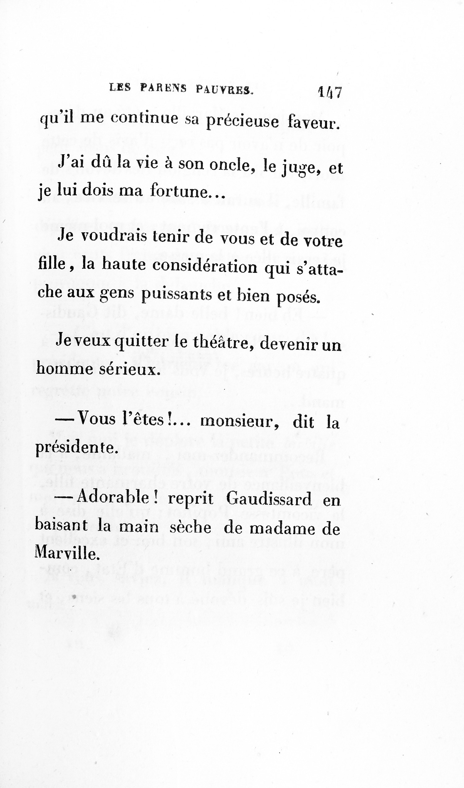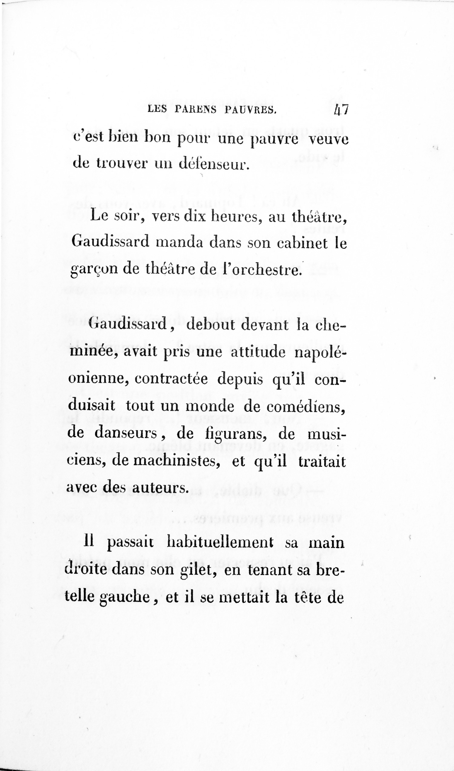 Ancien commis-voyageur, cet ami, nommé Gaudissard, avait été jadis fort utile au succès de la grande maison Popinot. Popinot, devenu comte, devenu pair de France après avoir été deux fois ministre, ne renia point l’illustre Gaudissard! Bien plus, il voulut mettre le voyageur en position de renouveler sa garde-robe et de remplir sa bourse ; car la politique, les vanités de la cour citoyenne n’avaient point gâté le cœur de cet ancien droguiste. Gaudissard, toujours fou des femmes, demanda le privilége d’un théâtre alors en faillite, et le ministre, en le lui donnant, eut soin de lui envoyer quelques vieux amateurs du beau sexe, assez riches [p. 255] pour créer une puissante commandite amoureuse de ce que cachent les maillots. Pons, parasite de l’hôtel Popinot, fut un appoint du privilége.